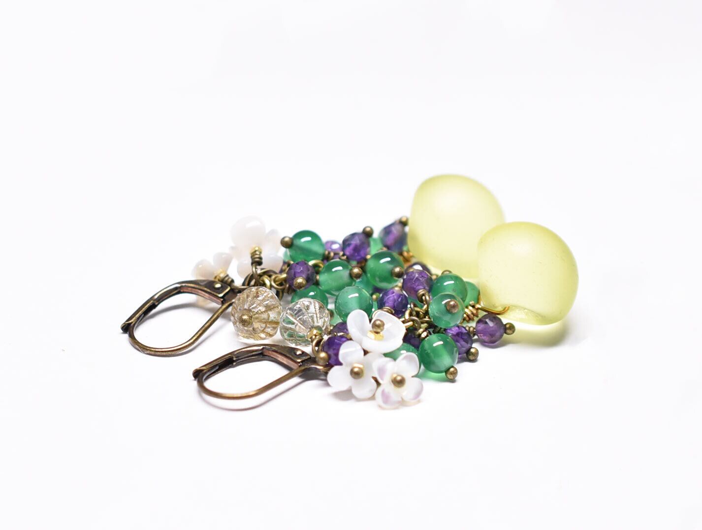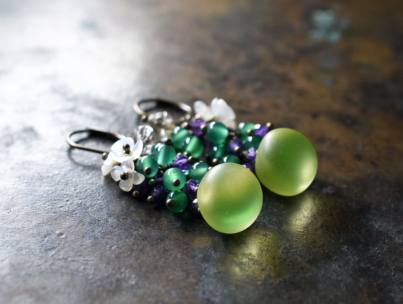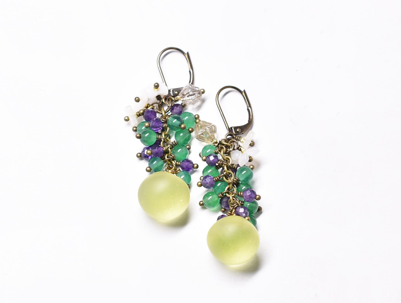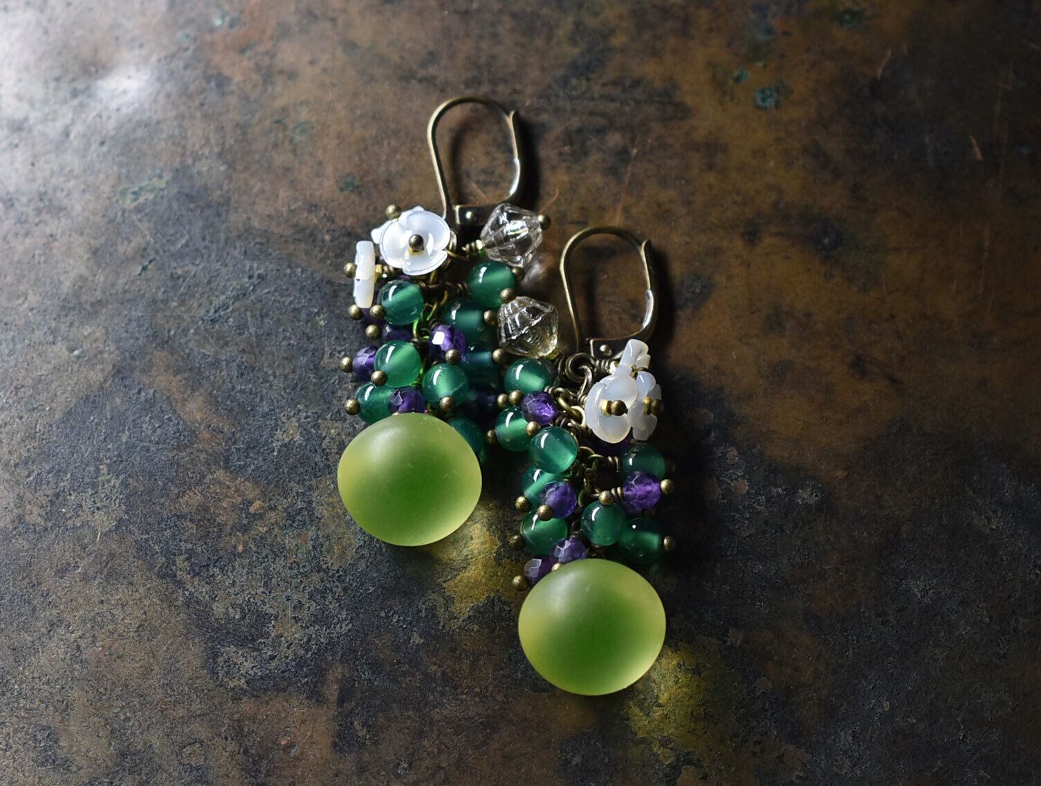 ぽってりアンティークウランガラスとたわわなアメジスト&グリーン瑪瑙、白蝶貝の小花、アンティークボヘミアビーズを繋いだピアスです。
