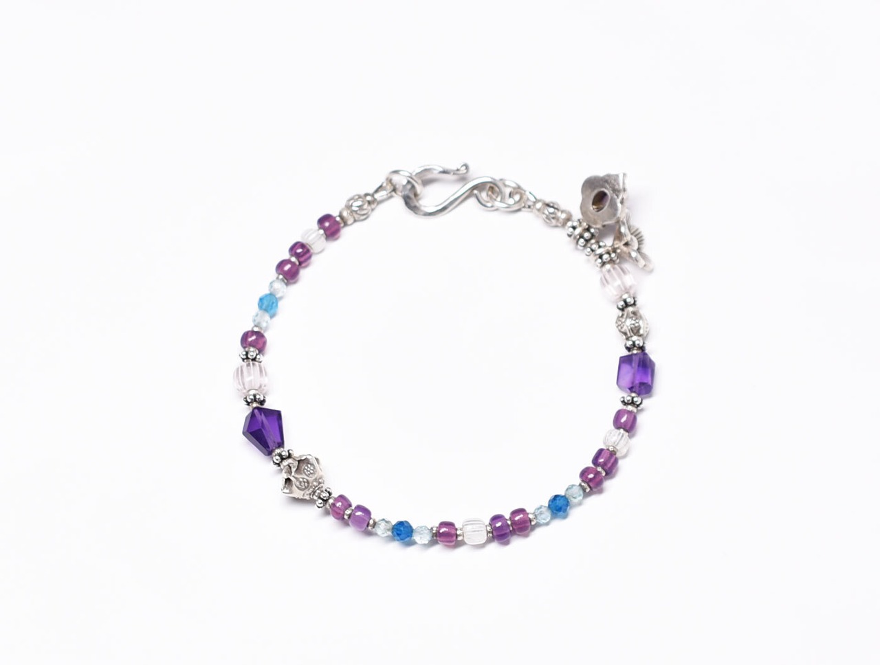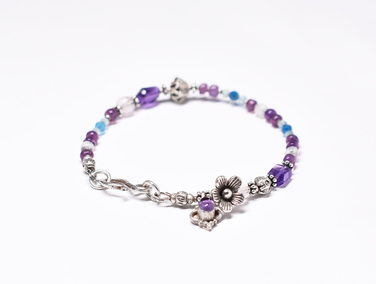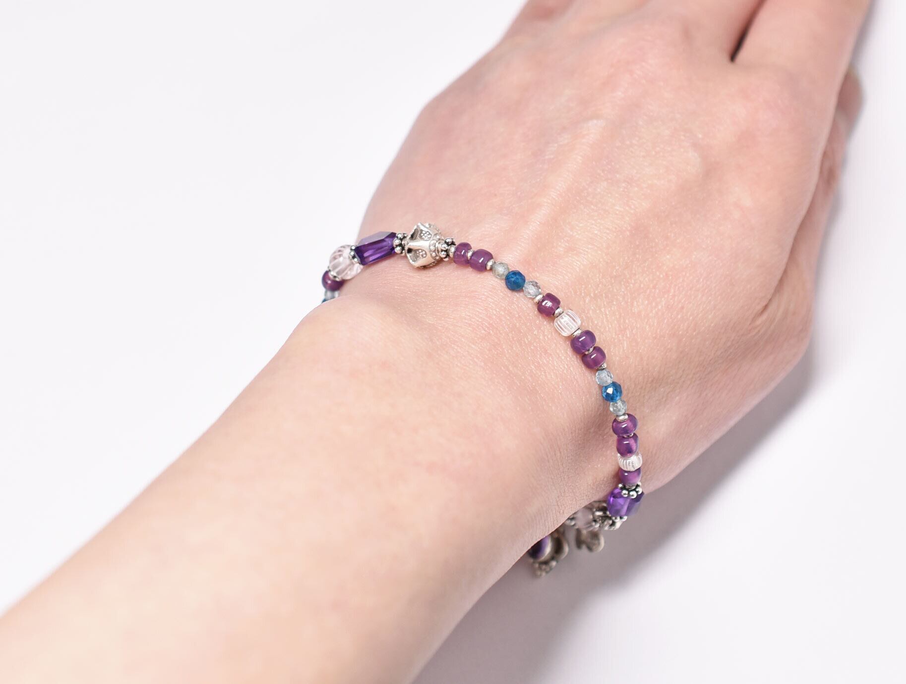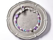 アメジストとグーズベリーカレンシルバー、すみれ色フランスヴィンテージビーズ、アクアマリンとアパタイト、チャームにはアメジストを繋いだ華奢なブレスです。