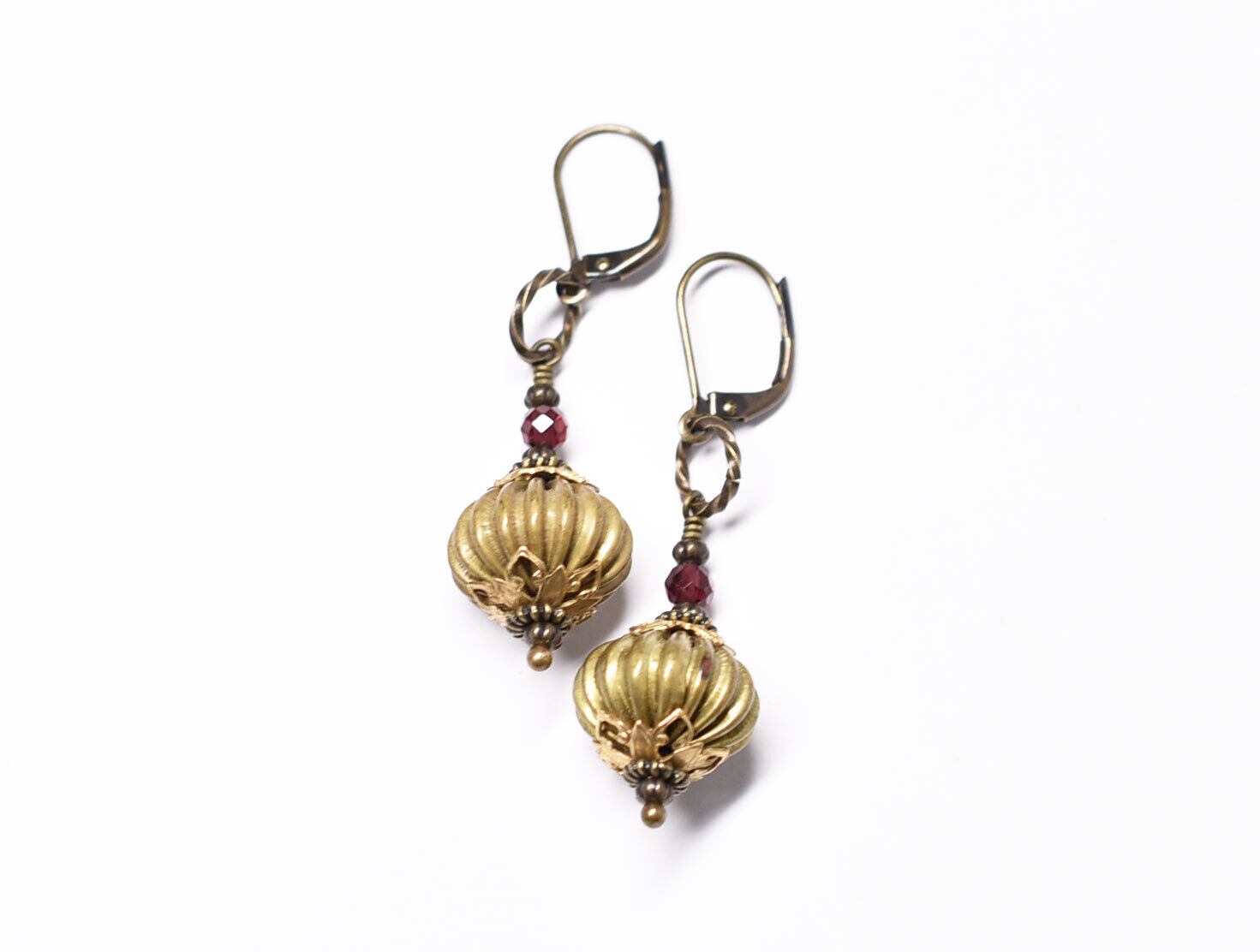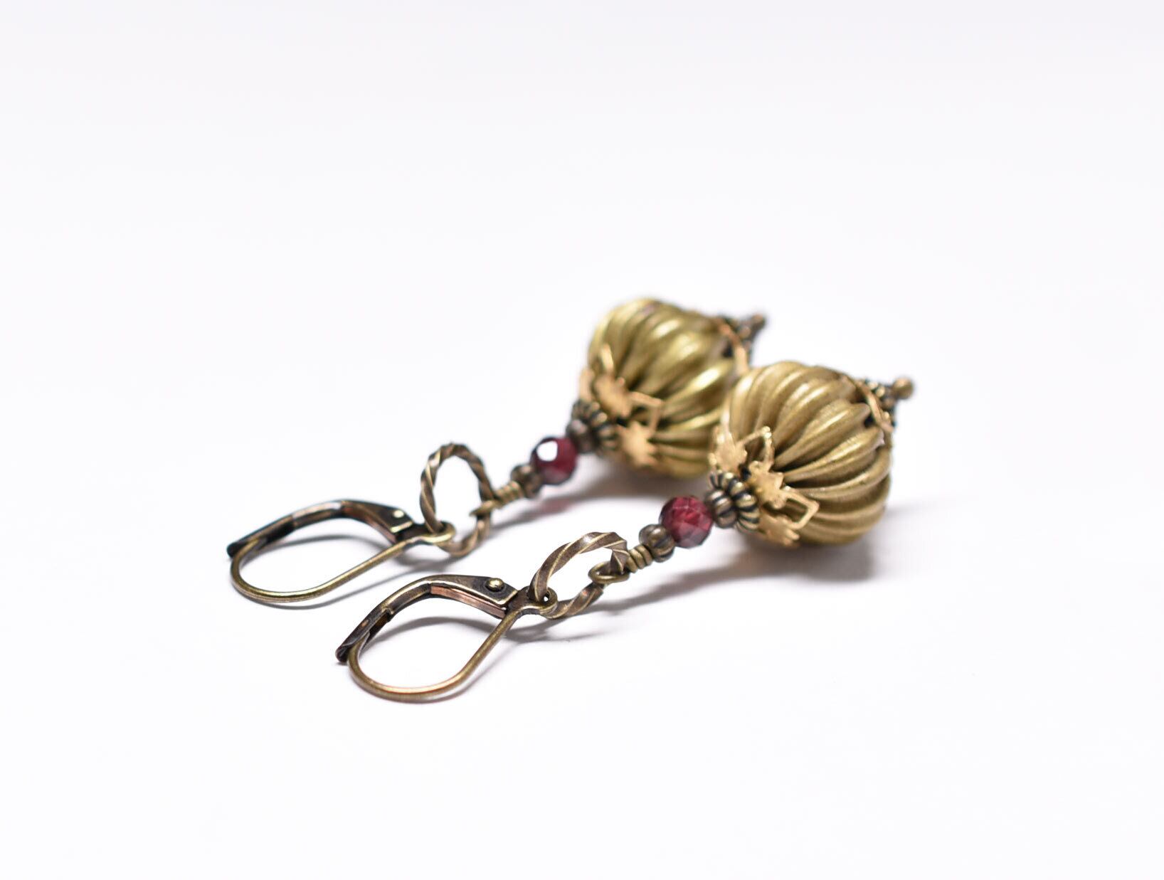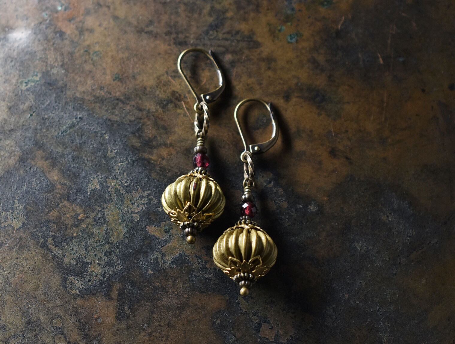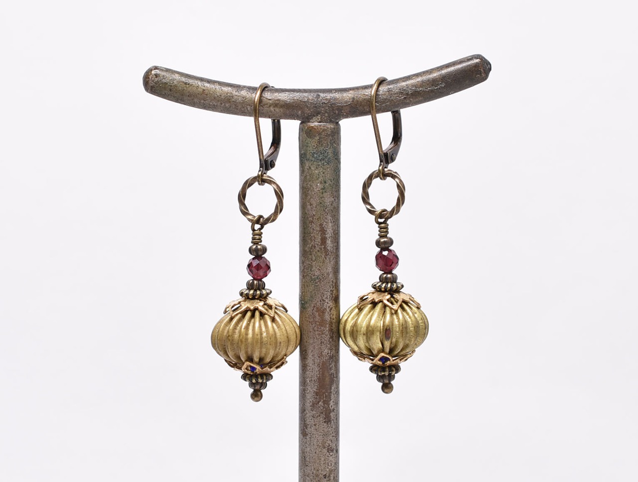 ぷっくりヴィンテージブラスとガーネットのピアス(M)