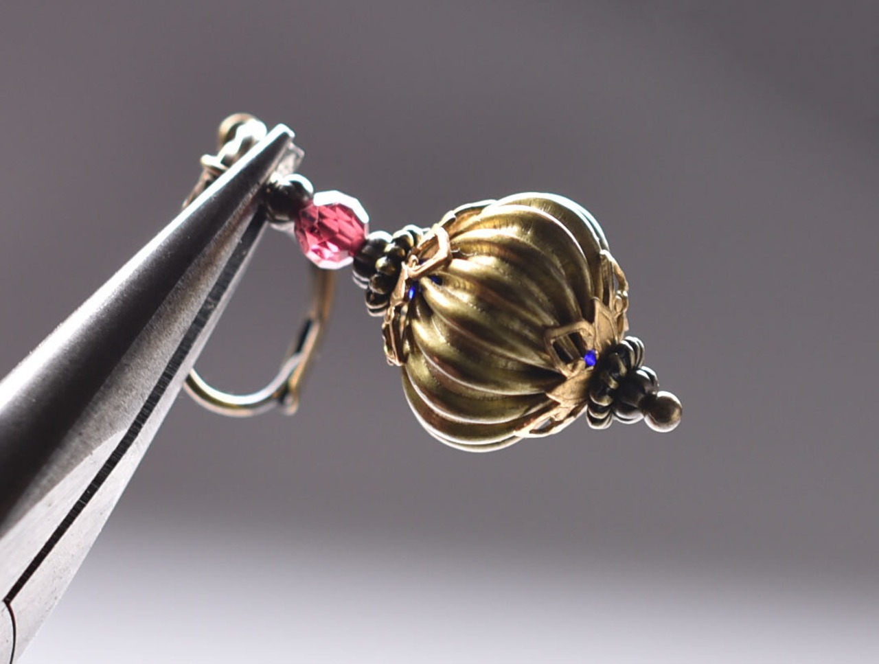 ぷっくりヴィンテージブラス隠しブルービーズとガーネットを繋いだピアスです。