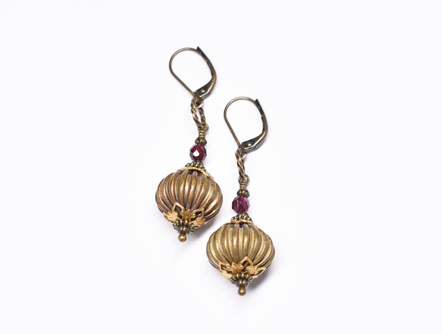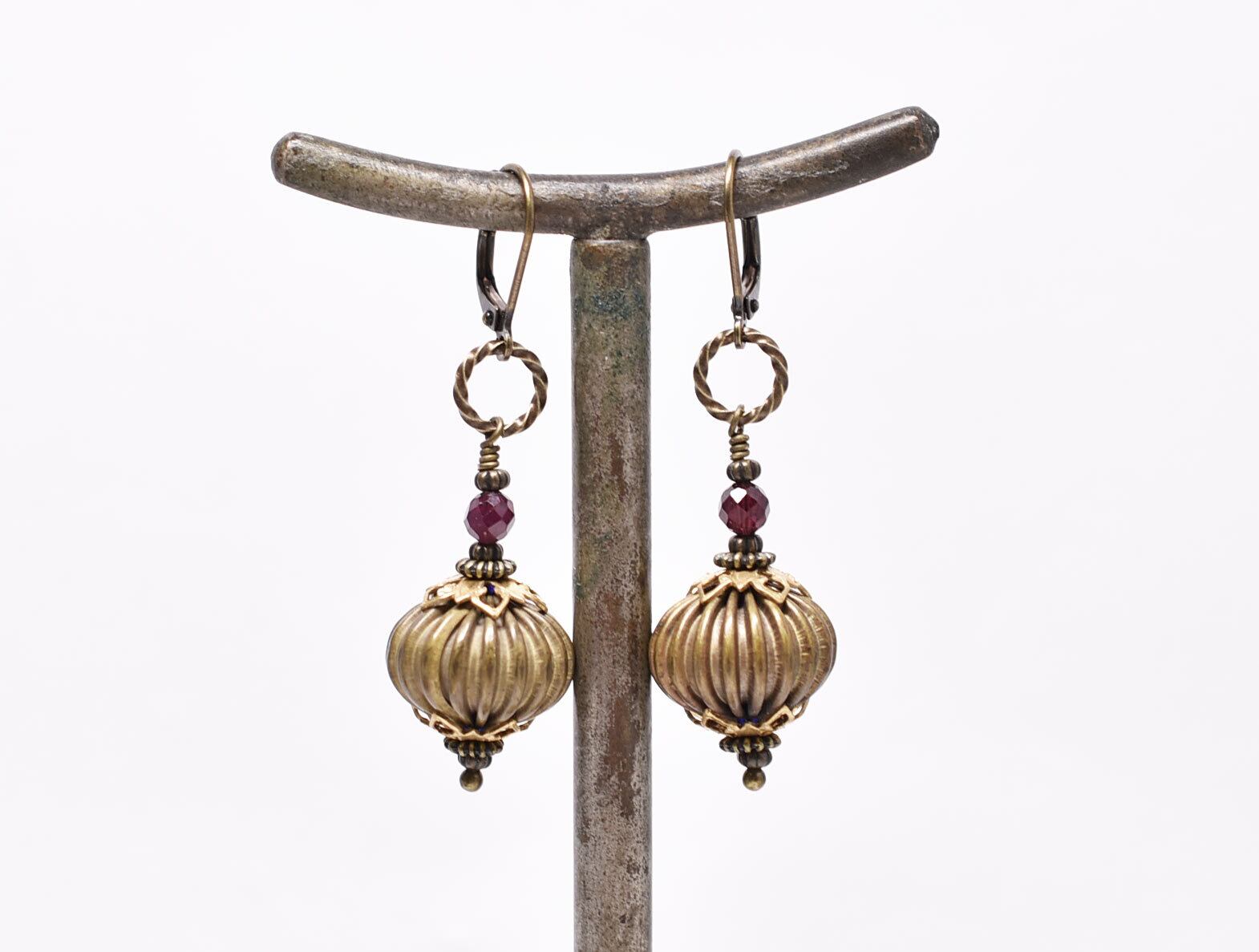 ぷっくりヴィンテージブラス隠しブルービーズとガーネットを繋いだピアスです。