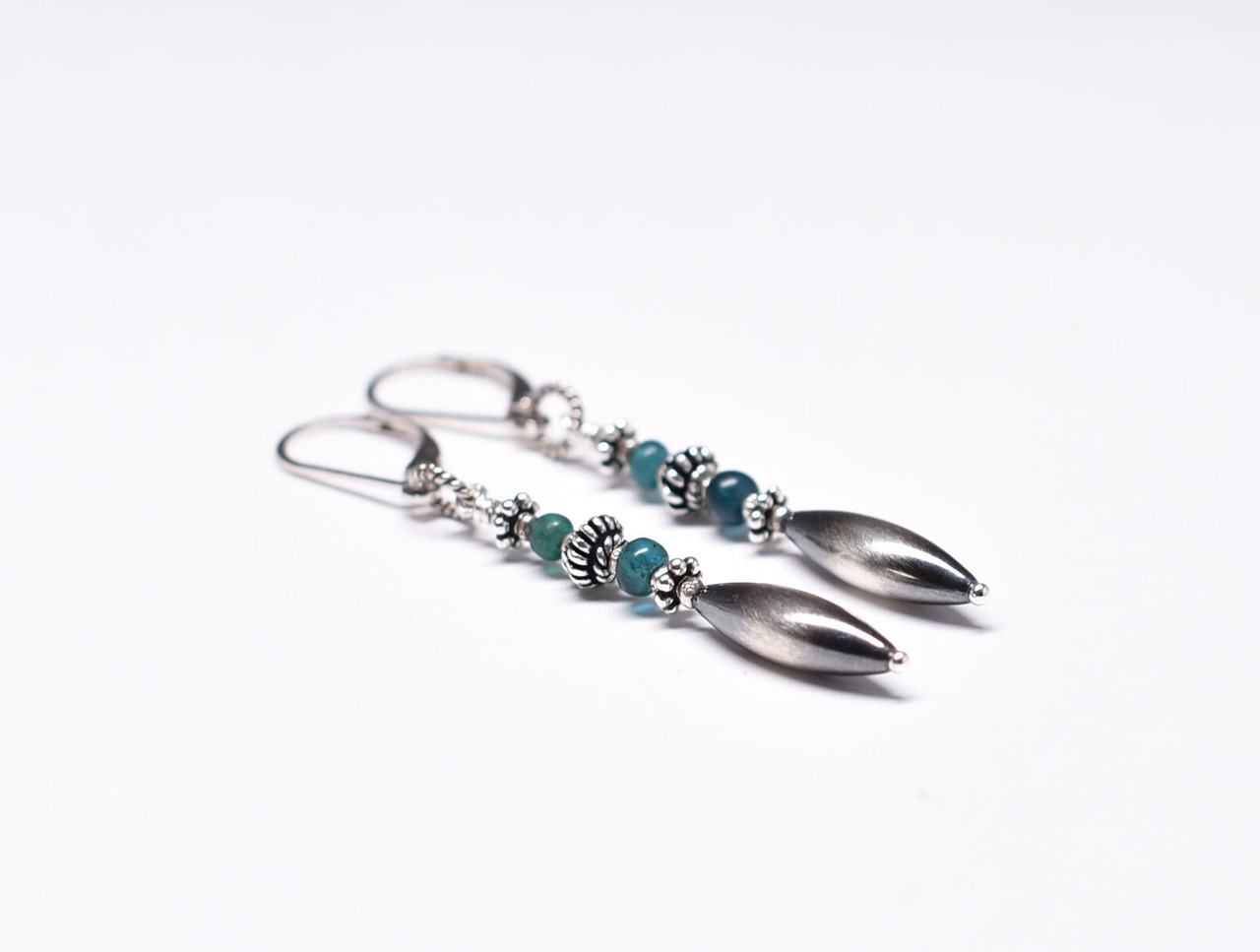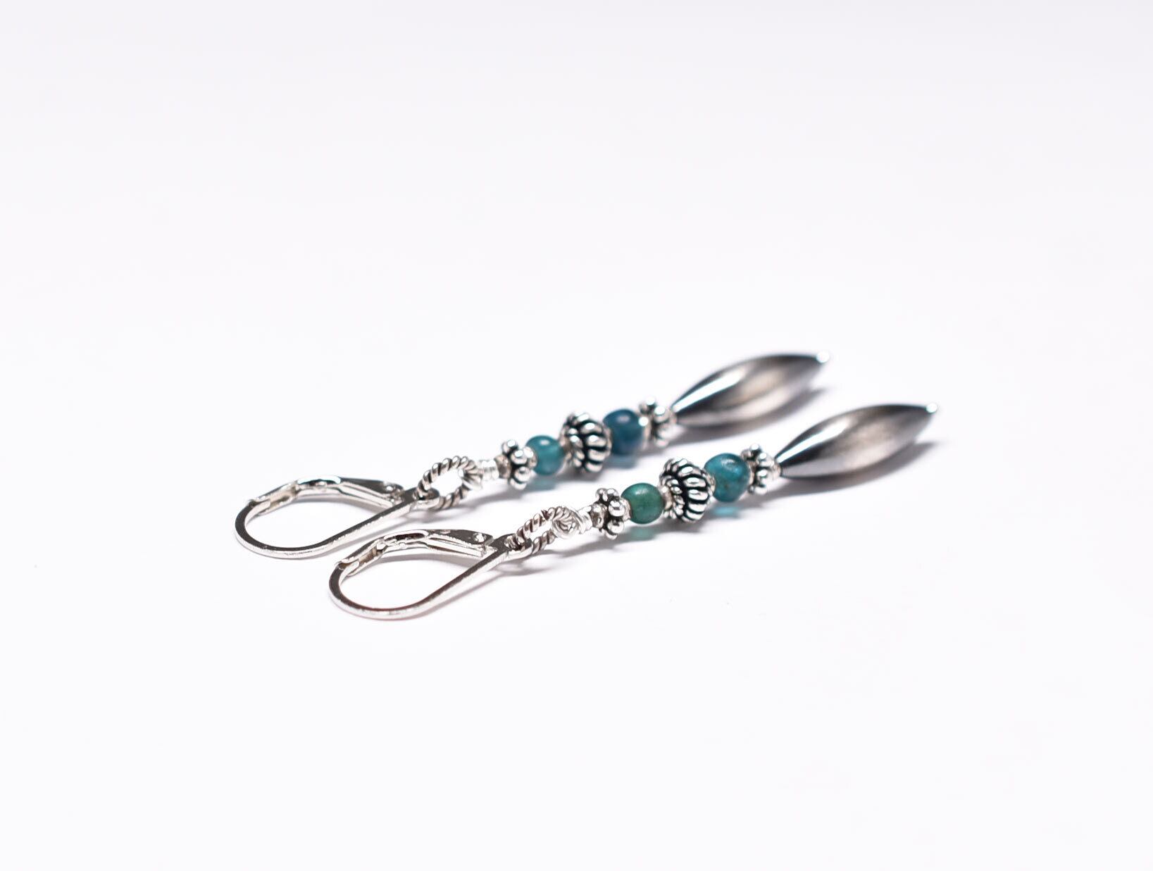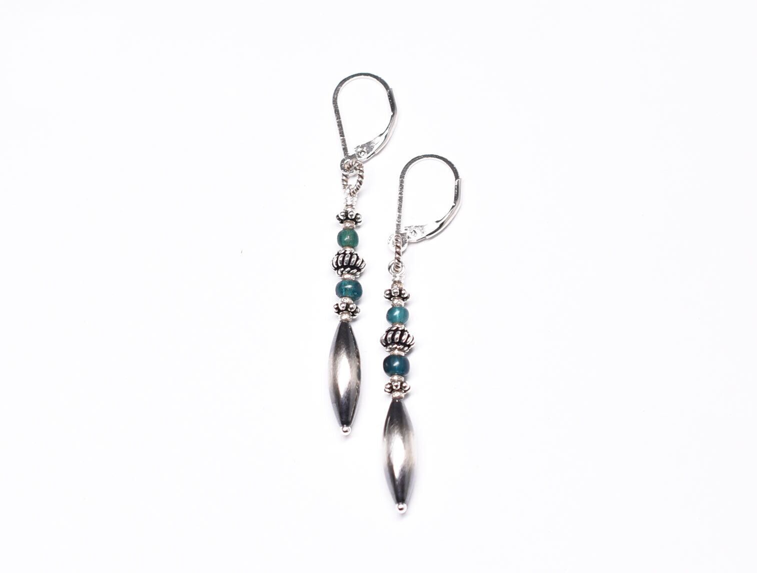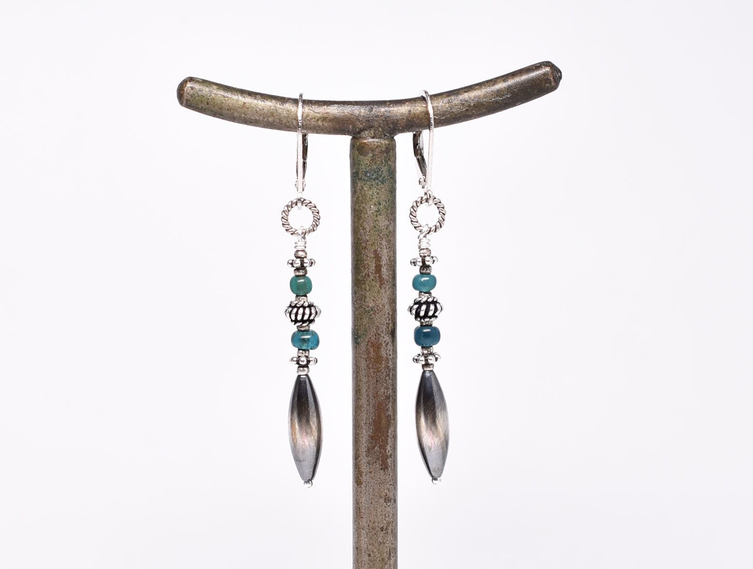 ナバホパールとエメラルドグリーンブルービーズ、ハンドメイドシルバーのスリムなピアス