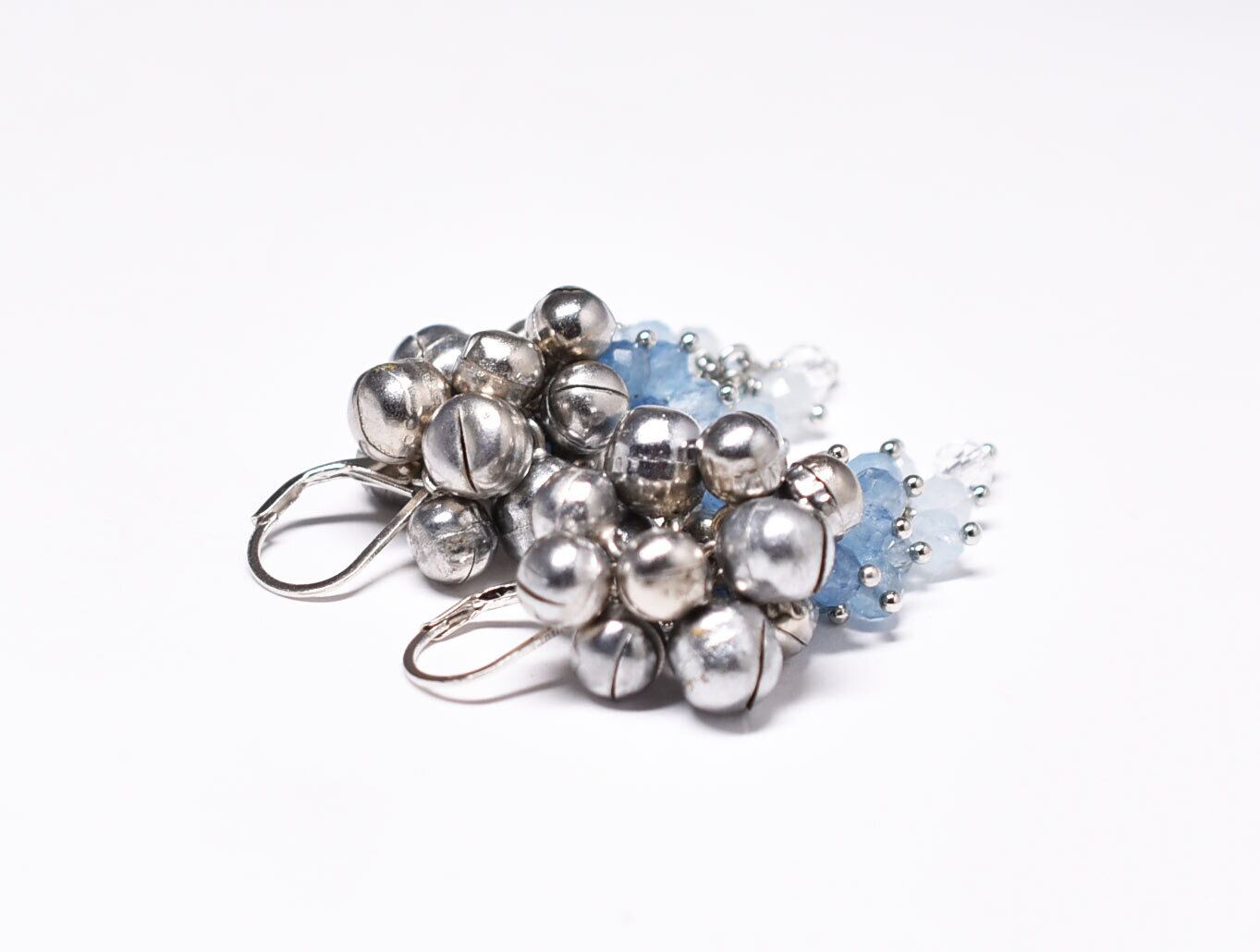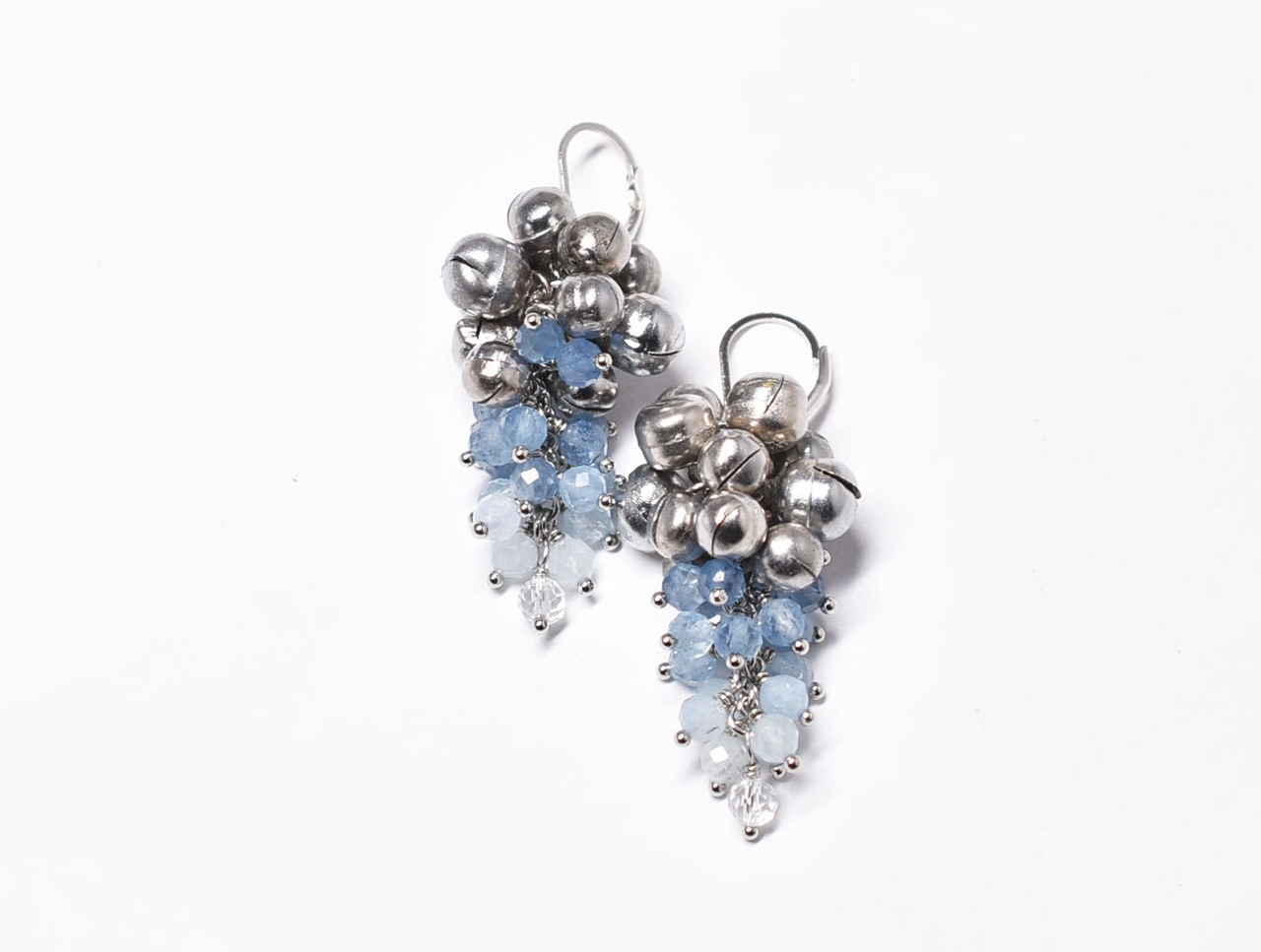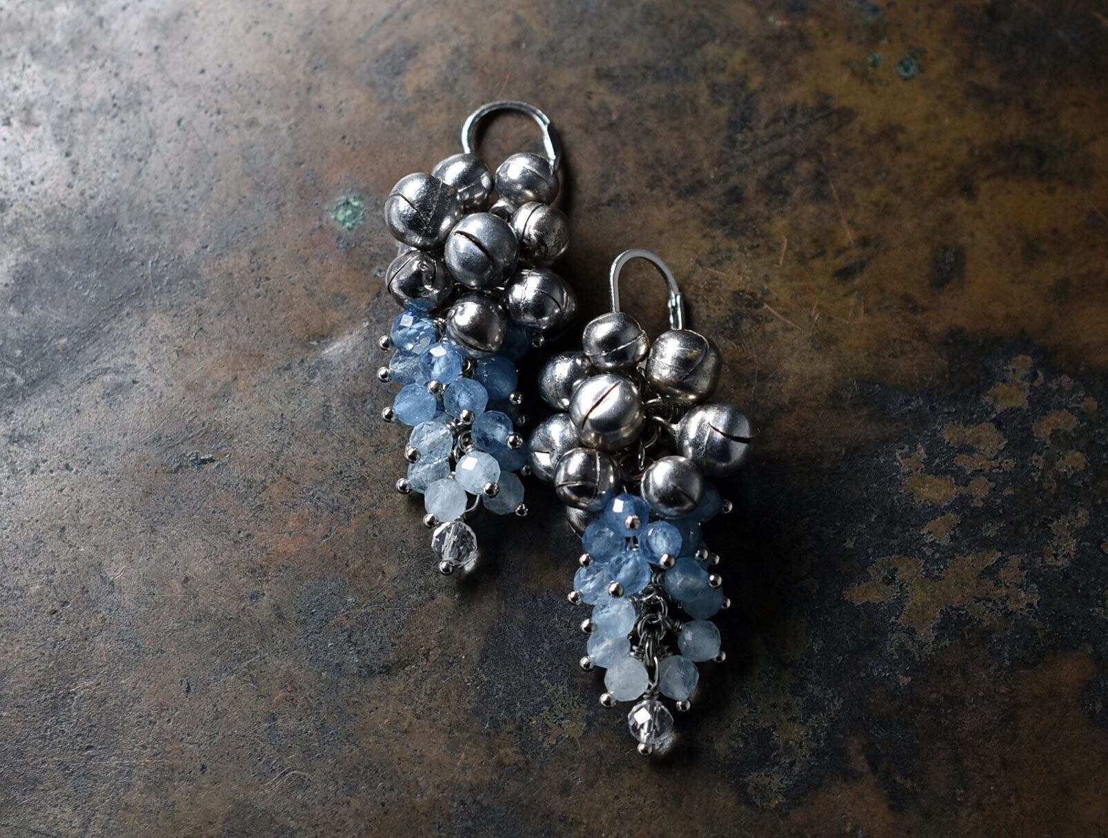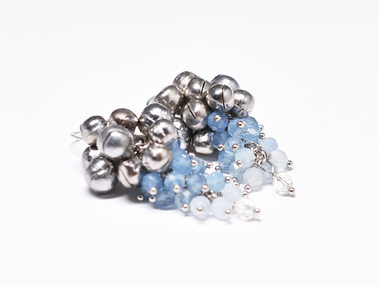 たわわな鈴とアクアマリンを繋いだ少しボリュームのあるピアスです。