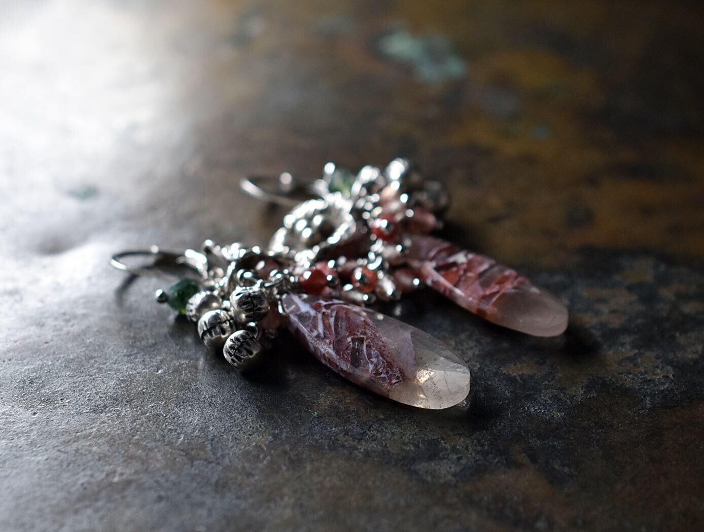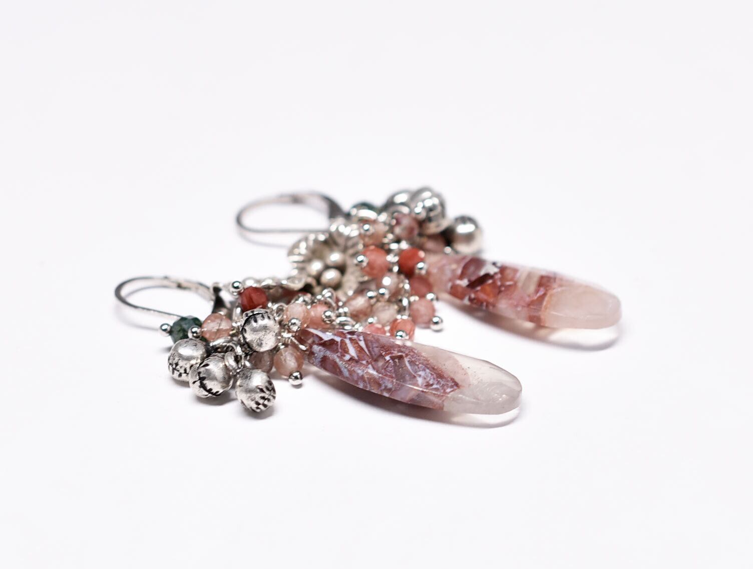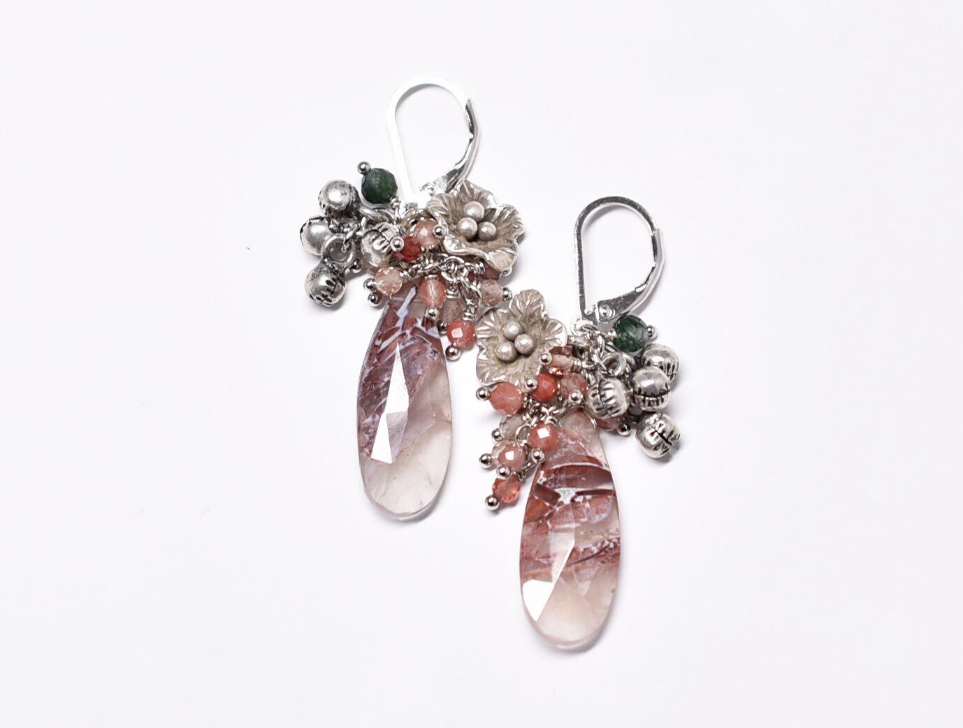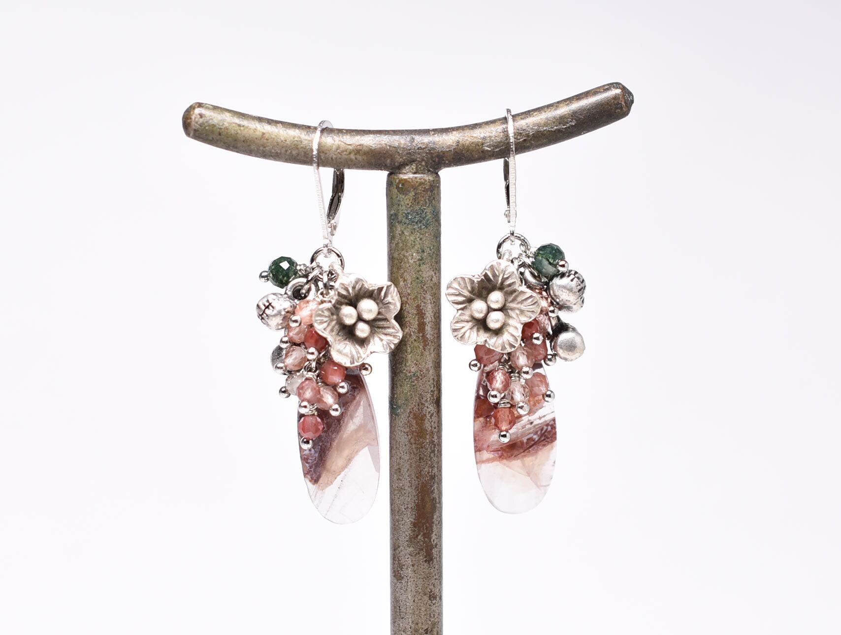 アゲートインクォーツとたわわなアンデシン、モスアゲート、カレンシルバーのお花とインド鈴を繋いだピアスです。
