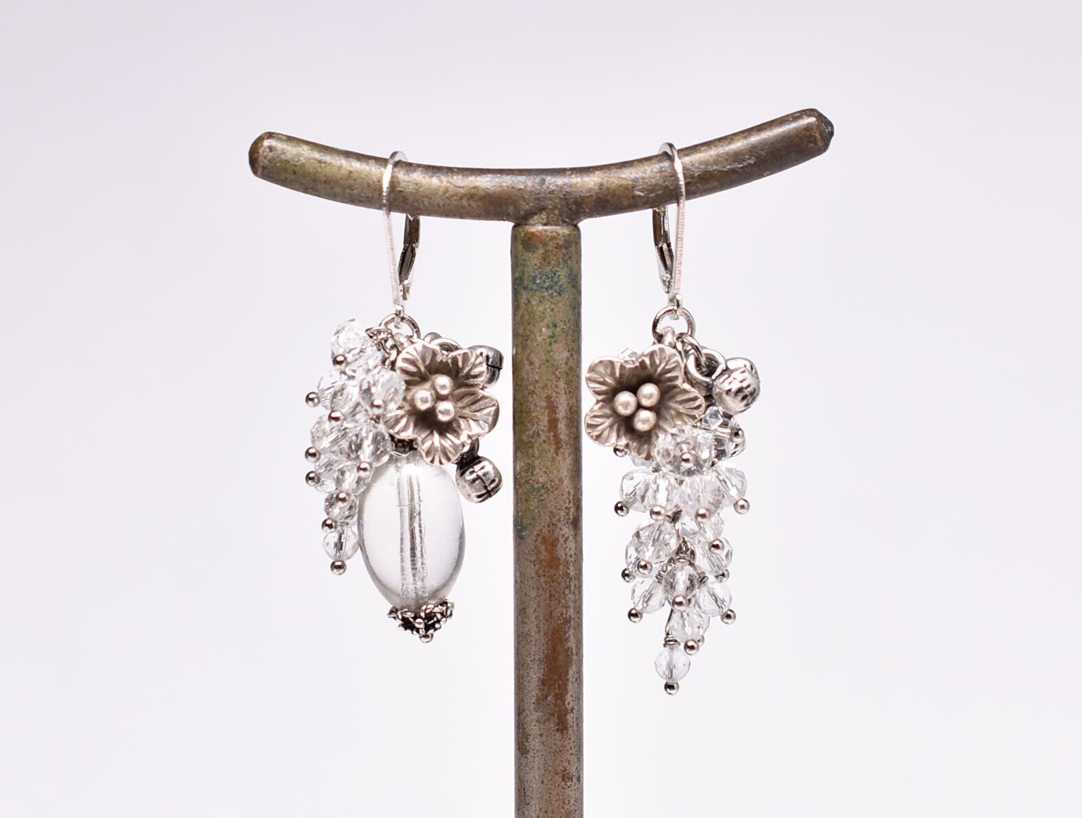 アンティークボヘミアビーズとたわわなクォーツ、カレンシルバーのお花と、インド鈴を繋いだピアスです。