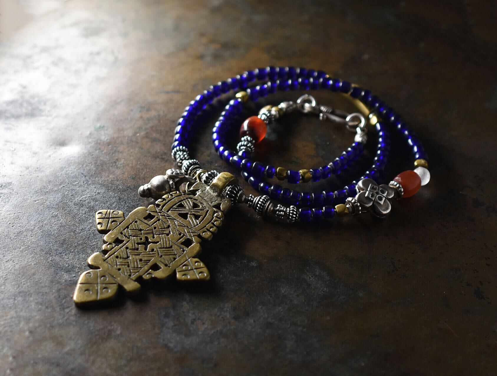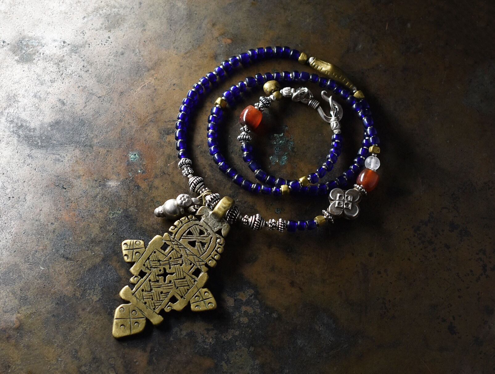 エチオピアンクロスとoldヒマーチャルシルバー、ミゾーラムカーネリアン、古代水晶、ブルキナファソブラス、瑠璃色ビーズなどを繋いだセミロングネックレスです。