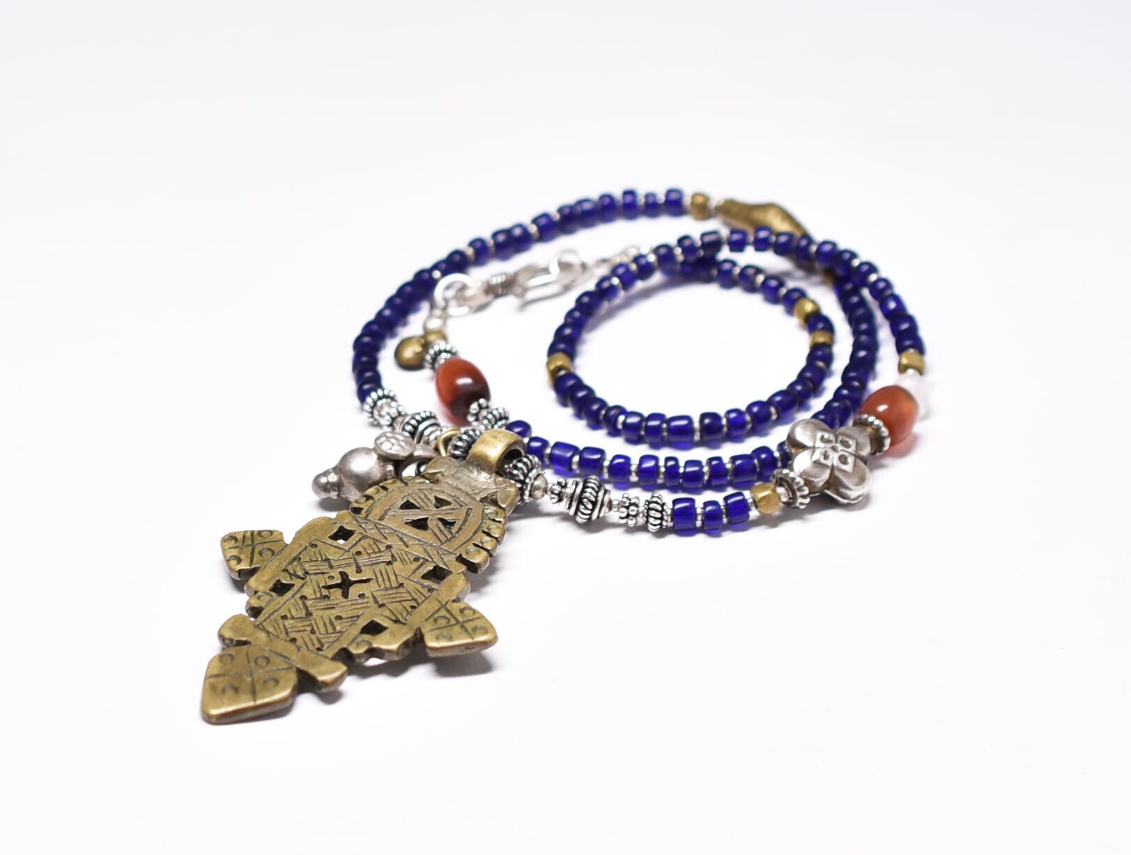 エチオピアンクロスとoldヒマーチャルシルバー、ミゾーラムカーネリアン、古代水晶、ブルキナファソブラス、瑠璃色ビーズのセミロングネックレス