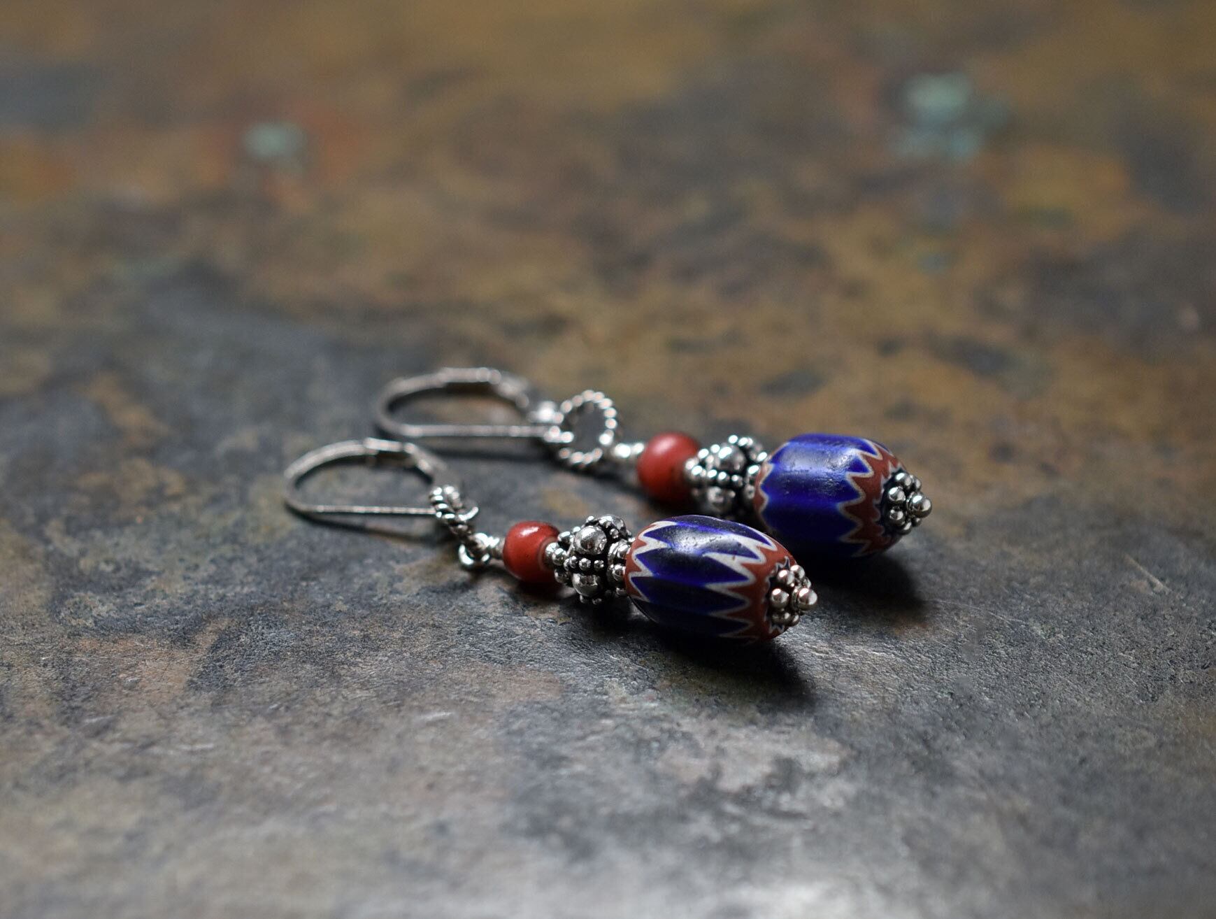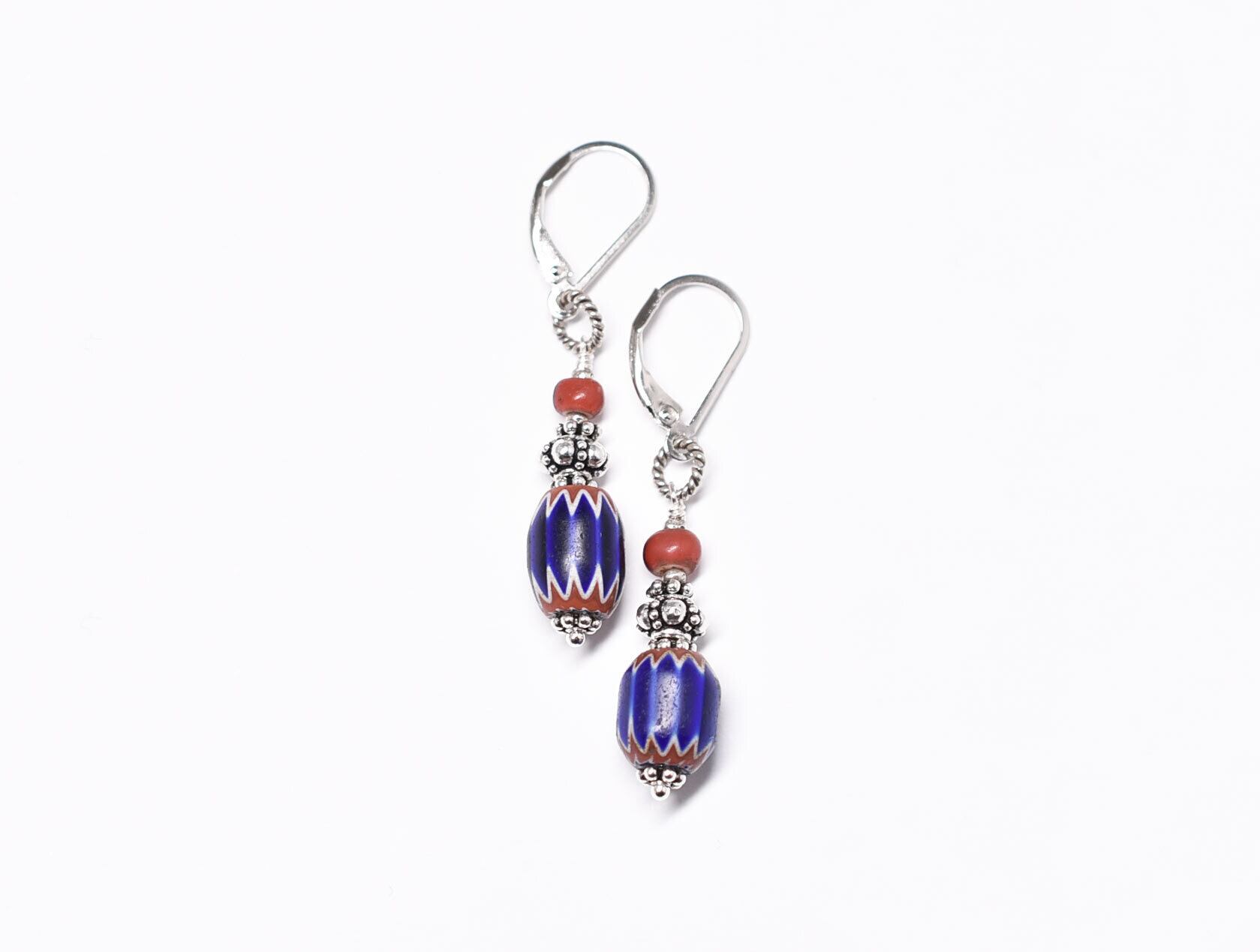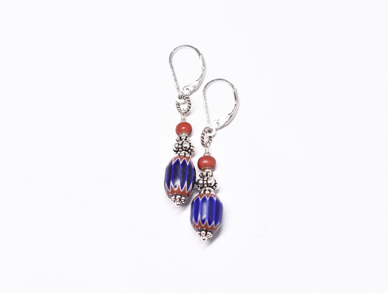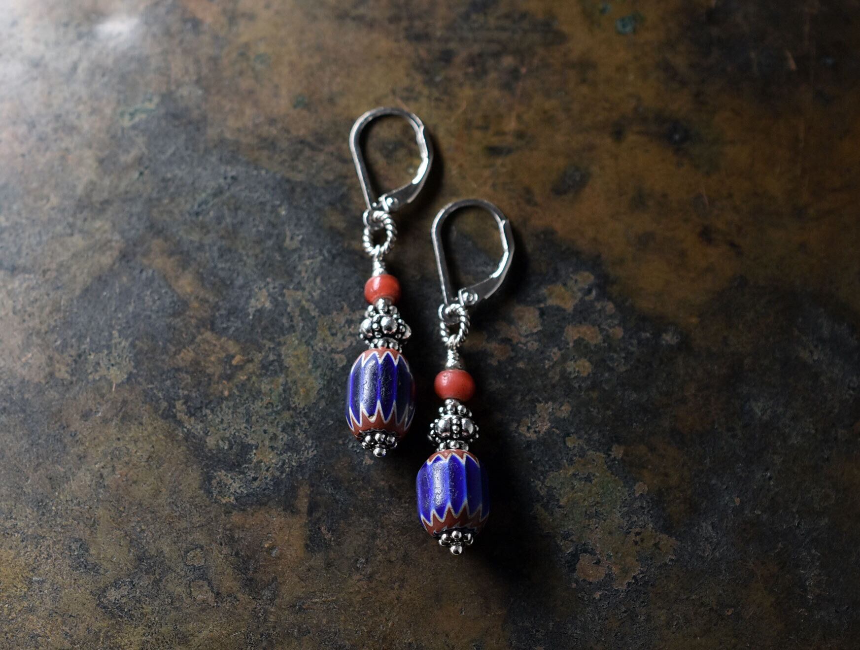 濃いブルーのビーズはシェブロンと呼ばれるアンティークのベネチアビーズです。6層構造になっていてます。