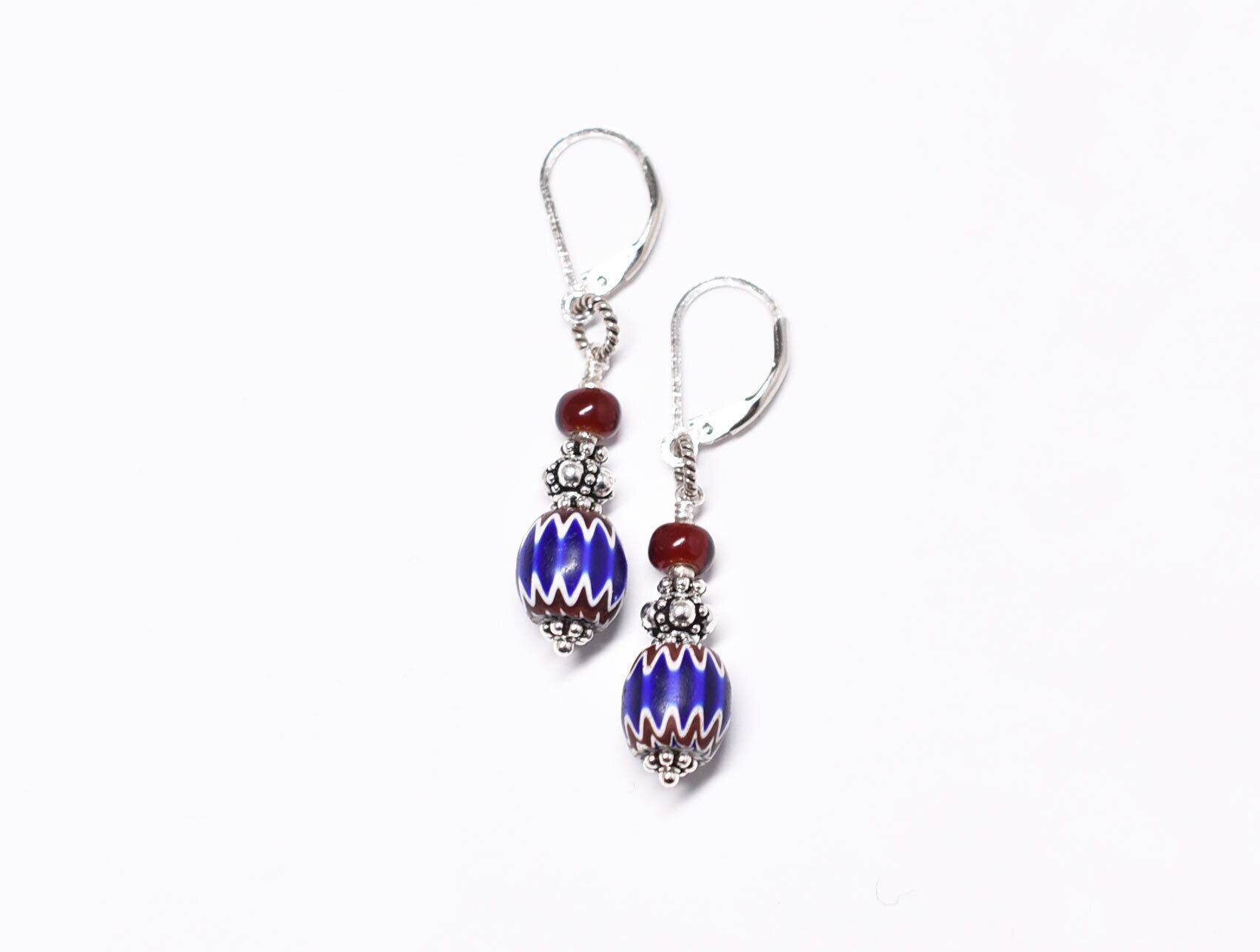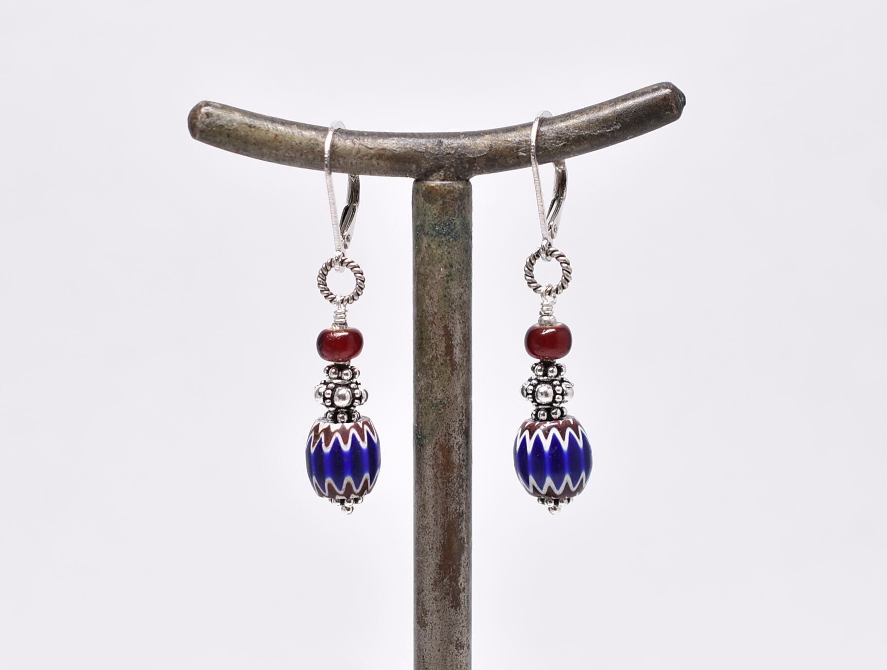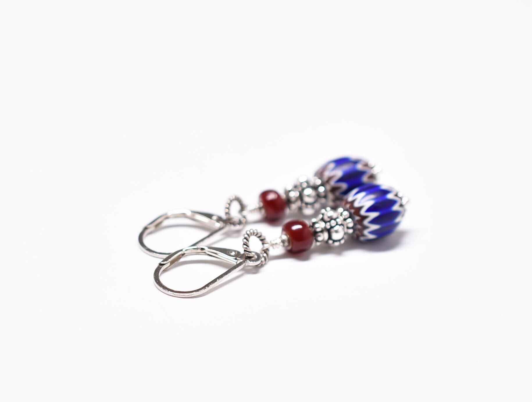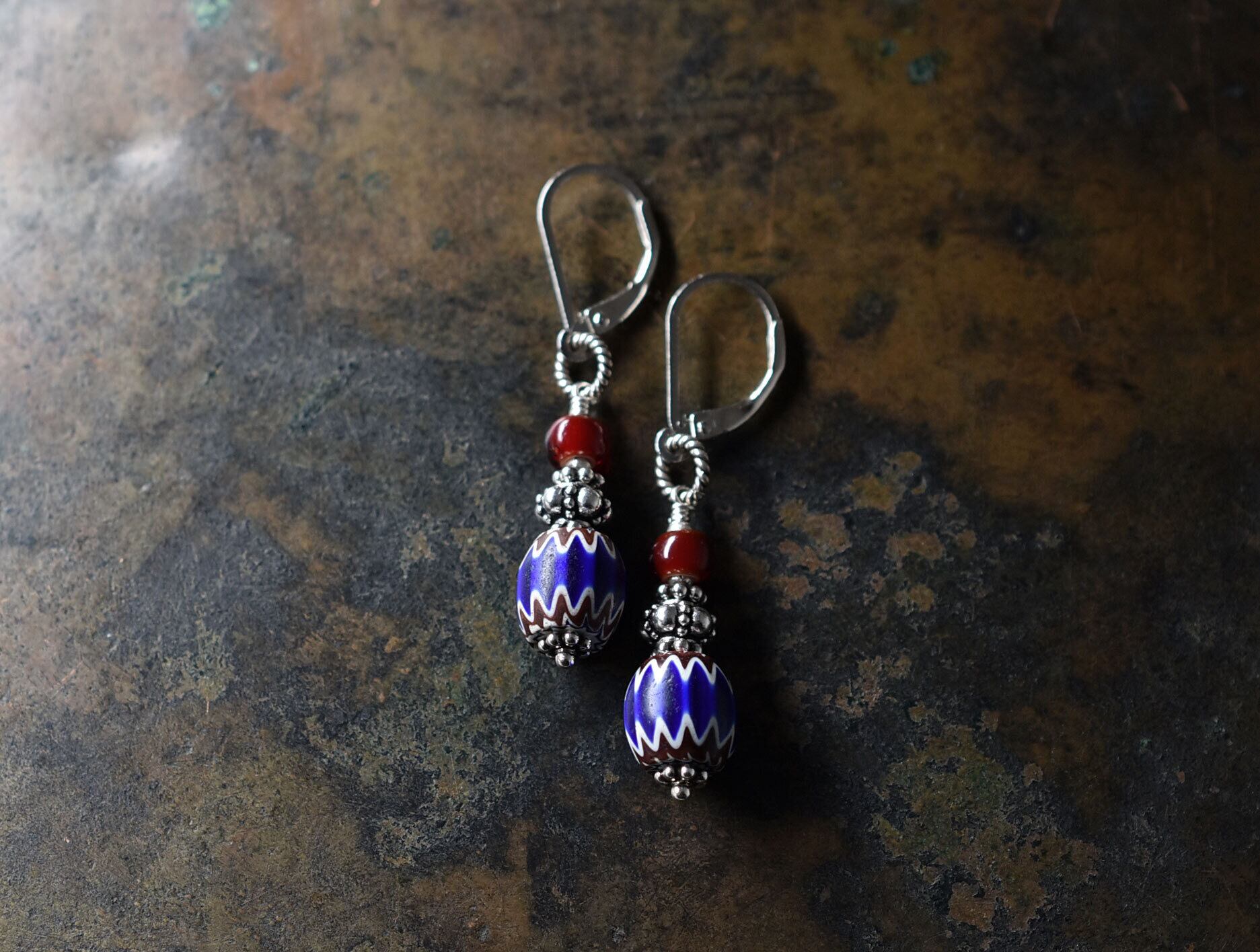アンティークブルーシェブロンビーズと血赤ホワイトハーツのピアス