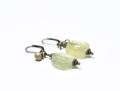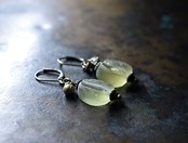 オリーブイエロー薄っすら銀化ローマングラスと民族鈴を繋いだピアスです。