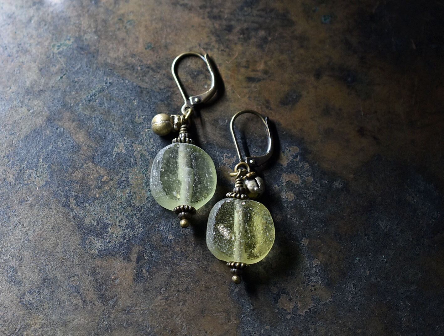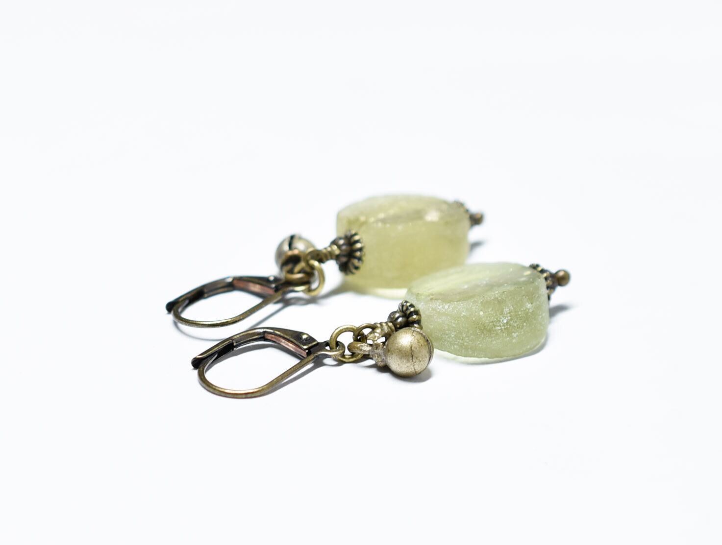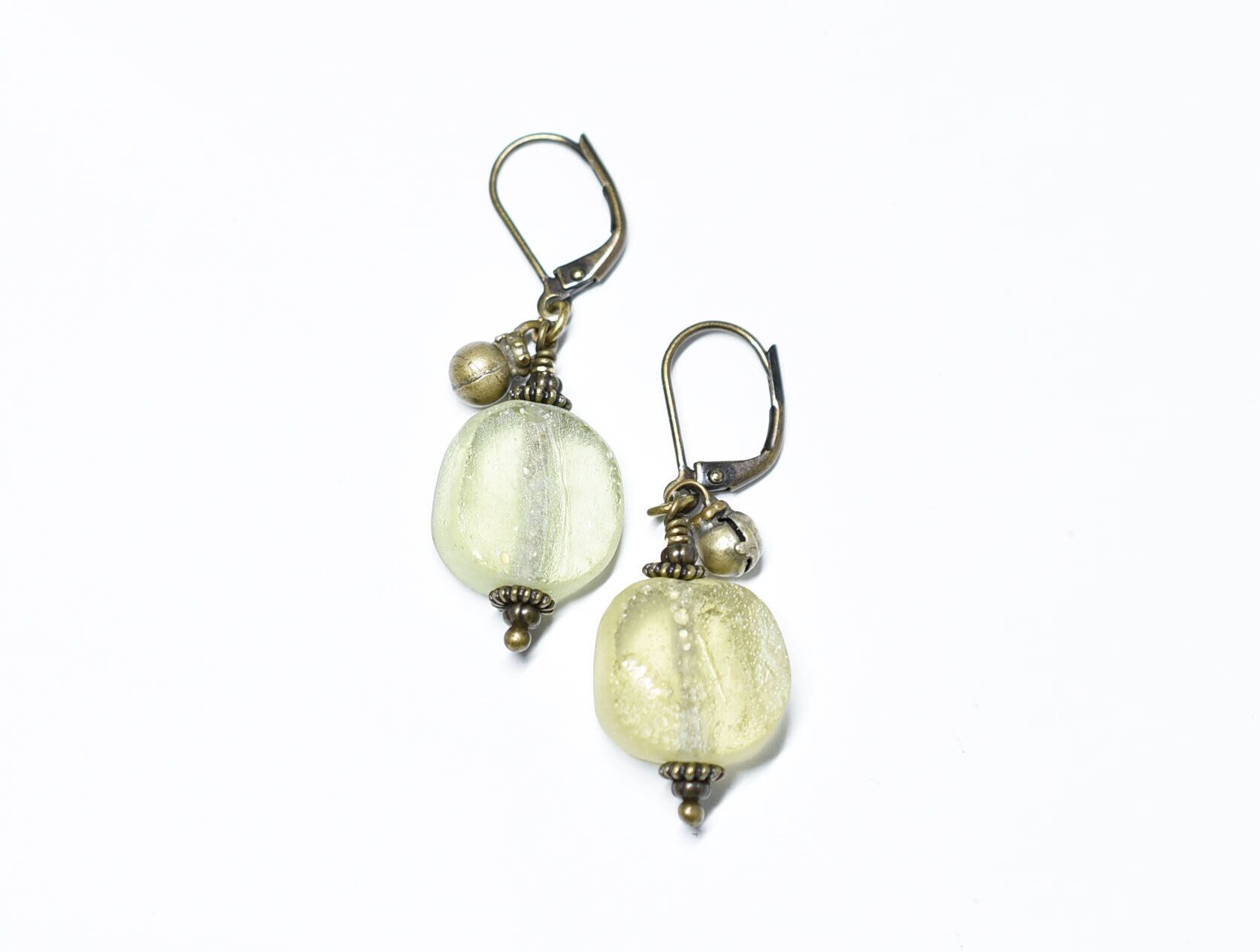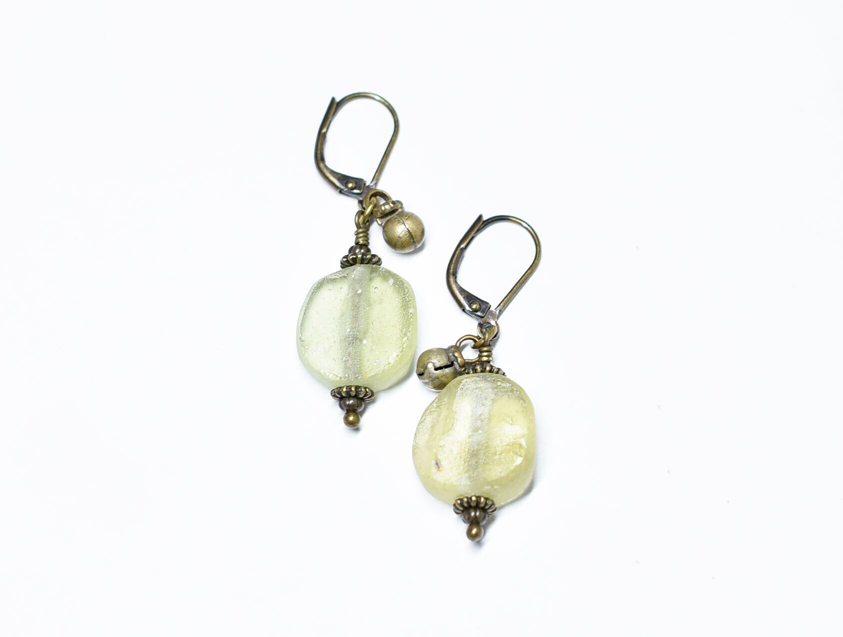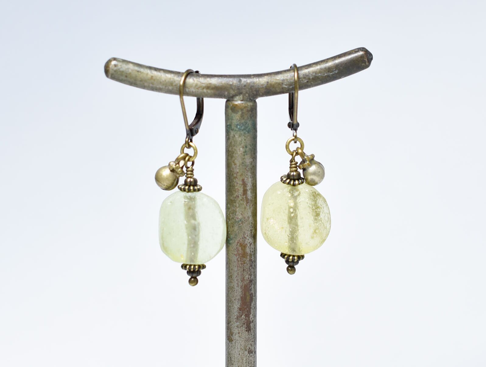 オリーブイエロー薄っすら銀化ローマングラスと民族鈴のピアス