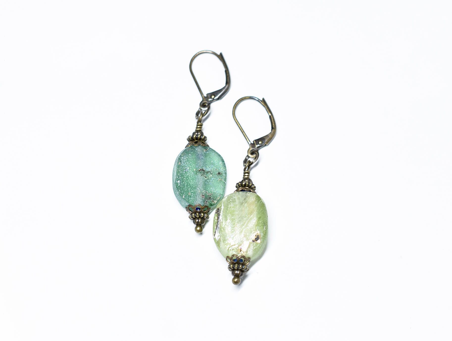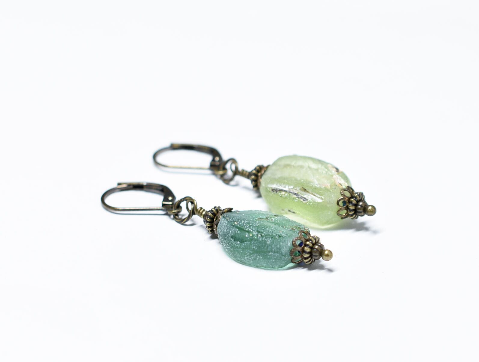 オリーブイエロー&グリーン薄っすら 銀化ローマングラスと隠しブルービーズを繋いだピアスです。