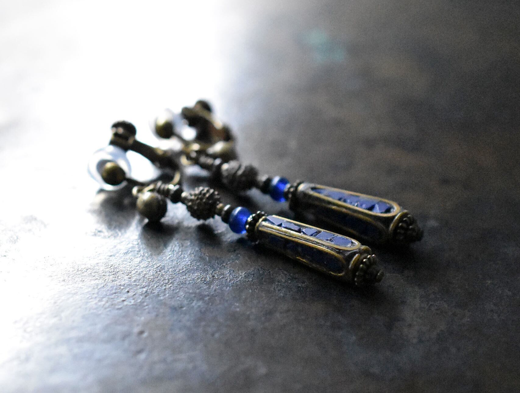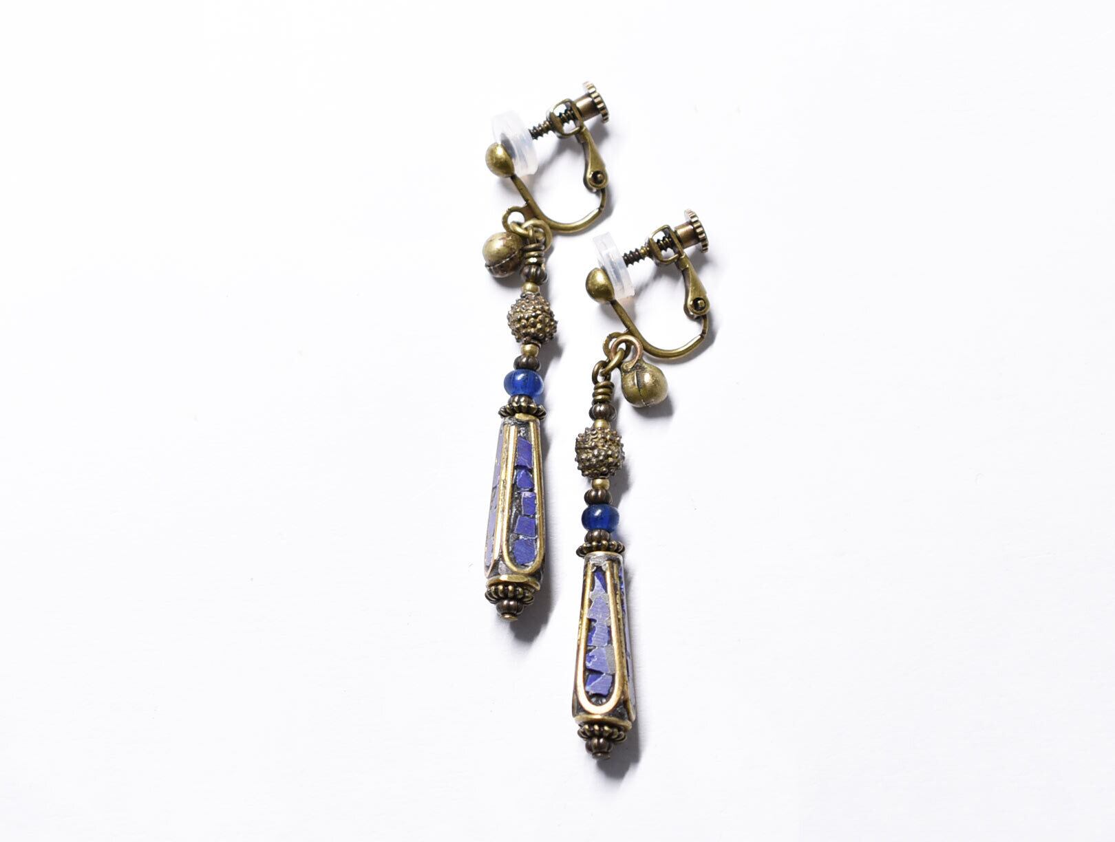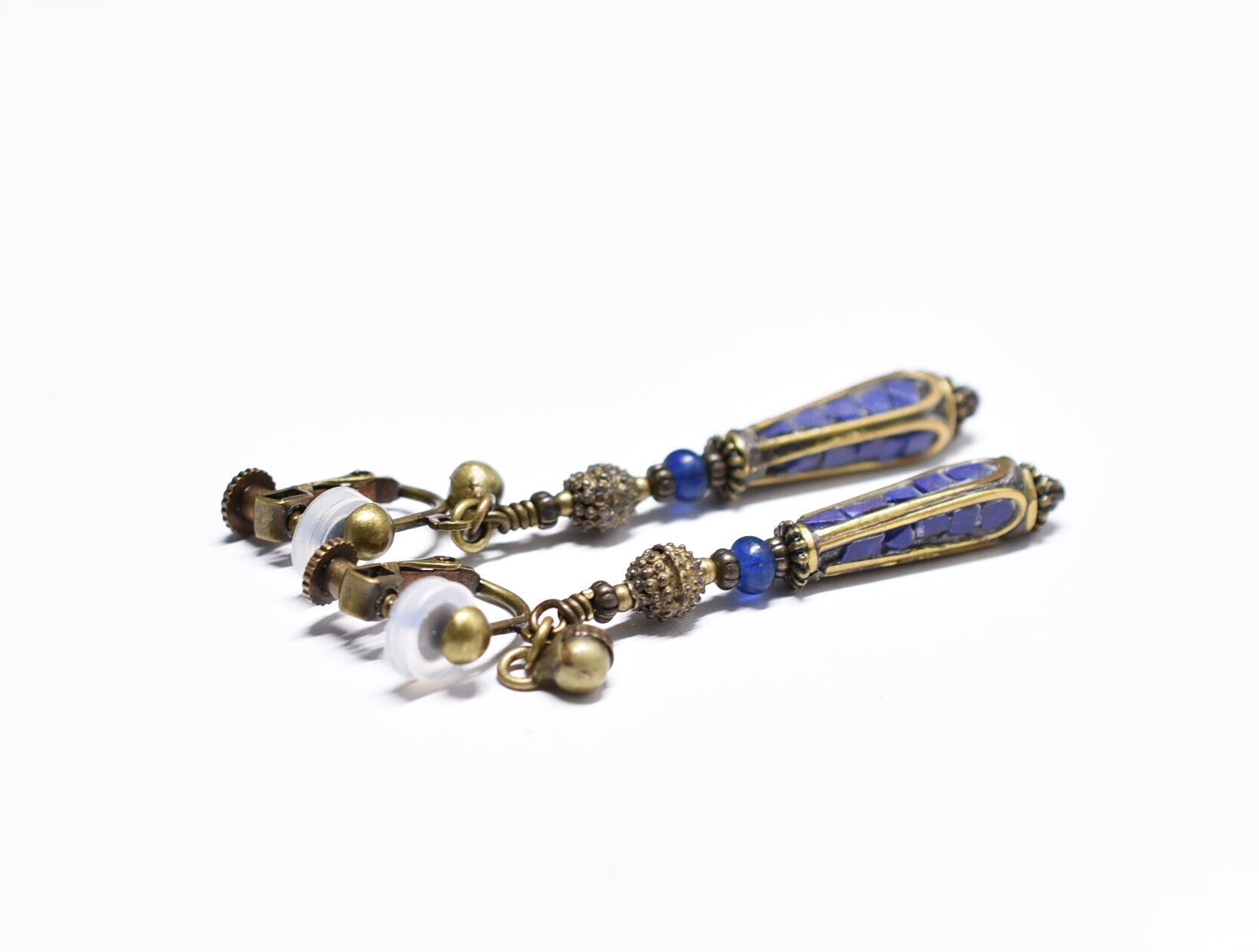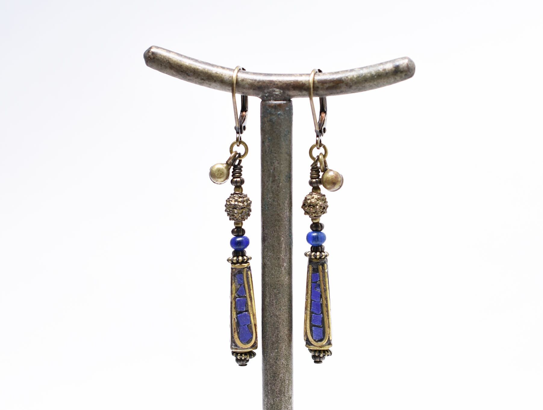 ラピス象嵌チベットビーズとブルーアンティークビーズ、つぶつぶブラス、民族鈴を繋いだイヤリングです。