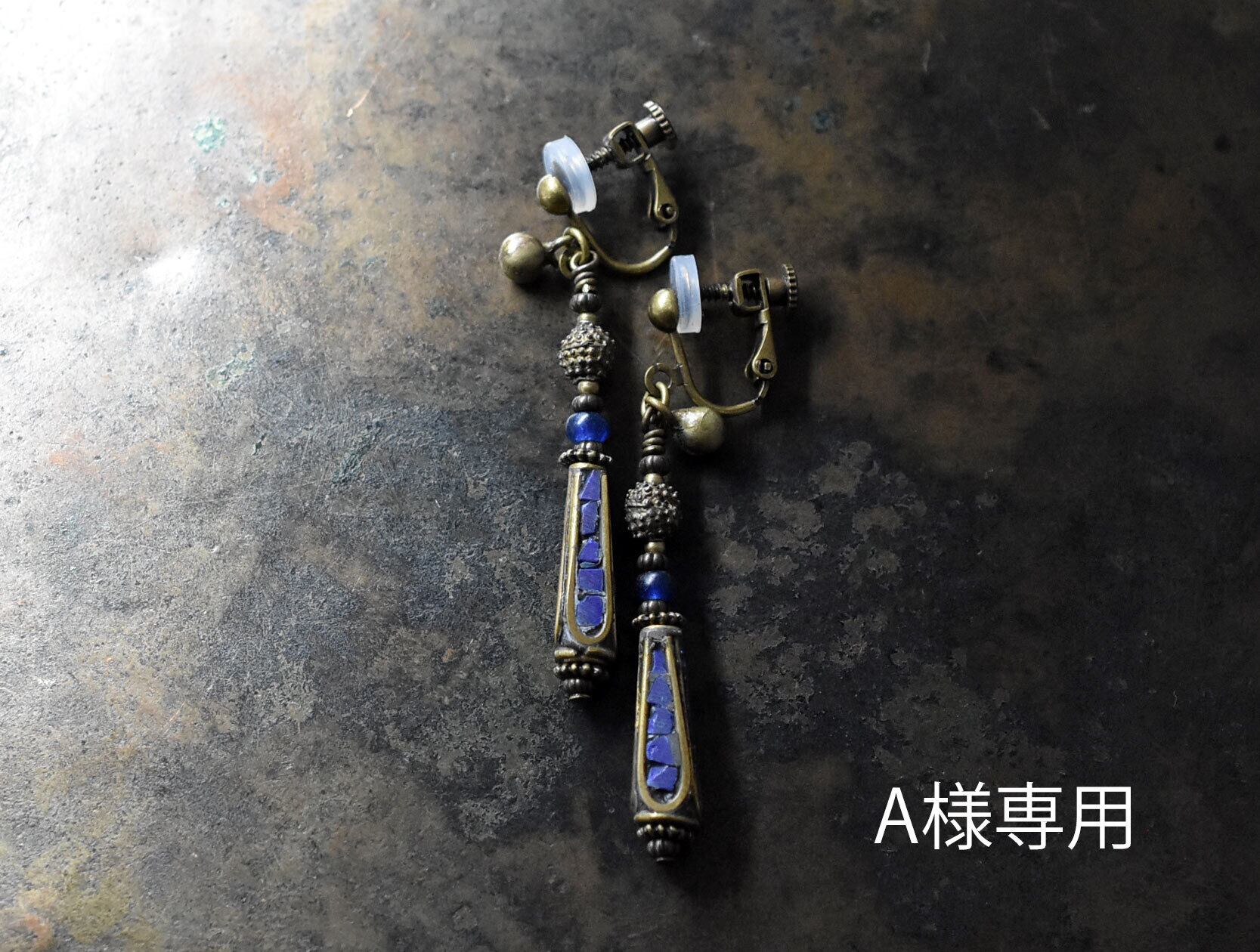 「A様専用」ラピス象嵌チベットビーズとブルーアンティークビーズ、つぶつぶブラス、民族鈴のイヤリング