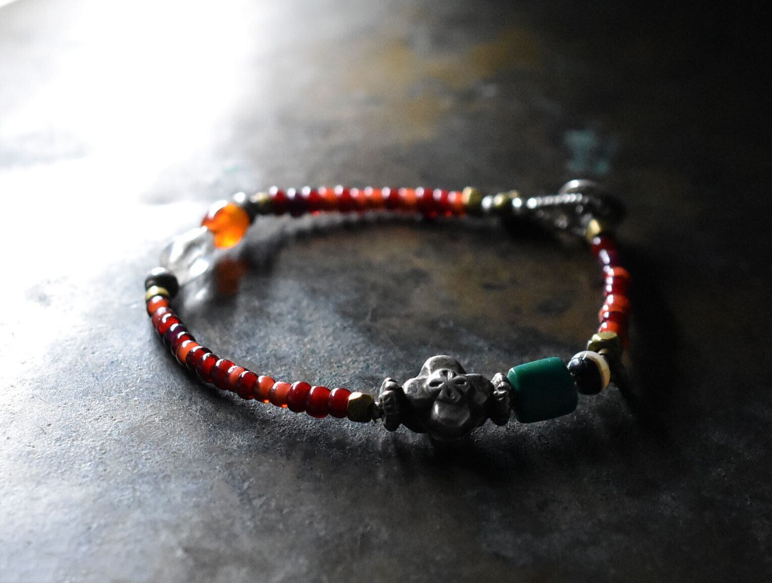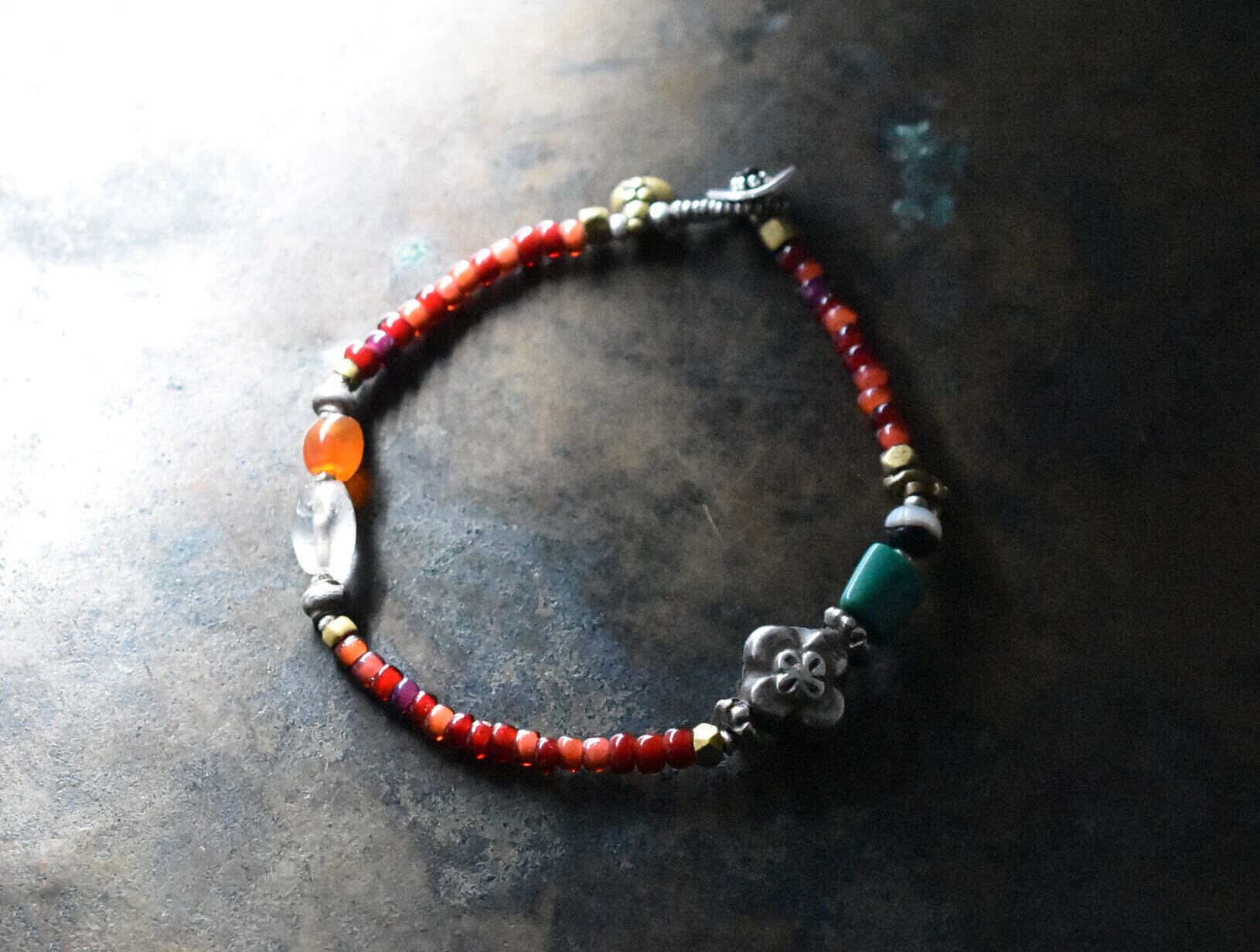 oldヒマーチャルシルバーとoldチベタンターコイズ、古代瑪瑙、古代水晶、ミゾーラムカーネリアン、血赤&金赤ホワイトハーツなどを繋いだブレスです。