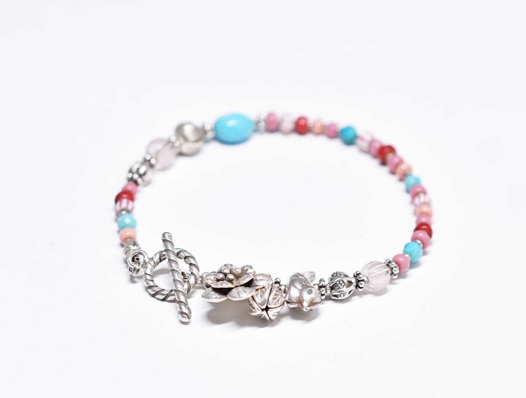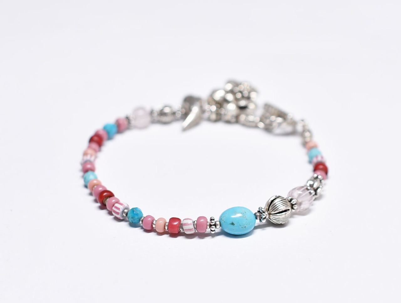 キングマンターコイズとヴェネチアアンティークビーズ、小鳥&ボタニカルカレンシルバーを繋いだシャーベットカラーのブレスです。