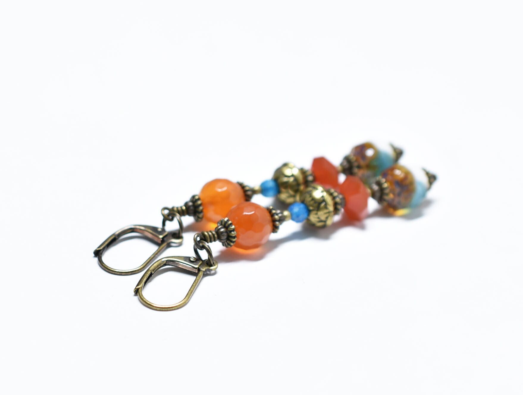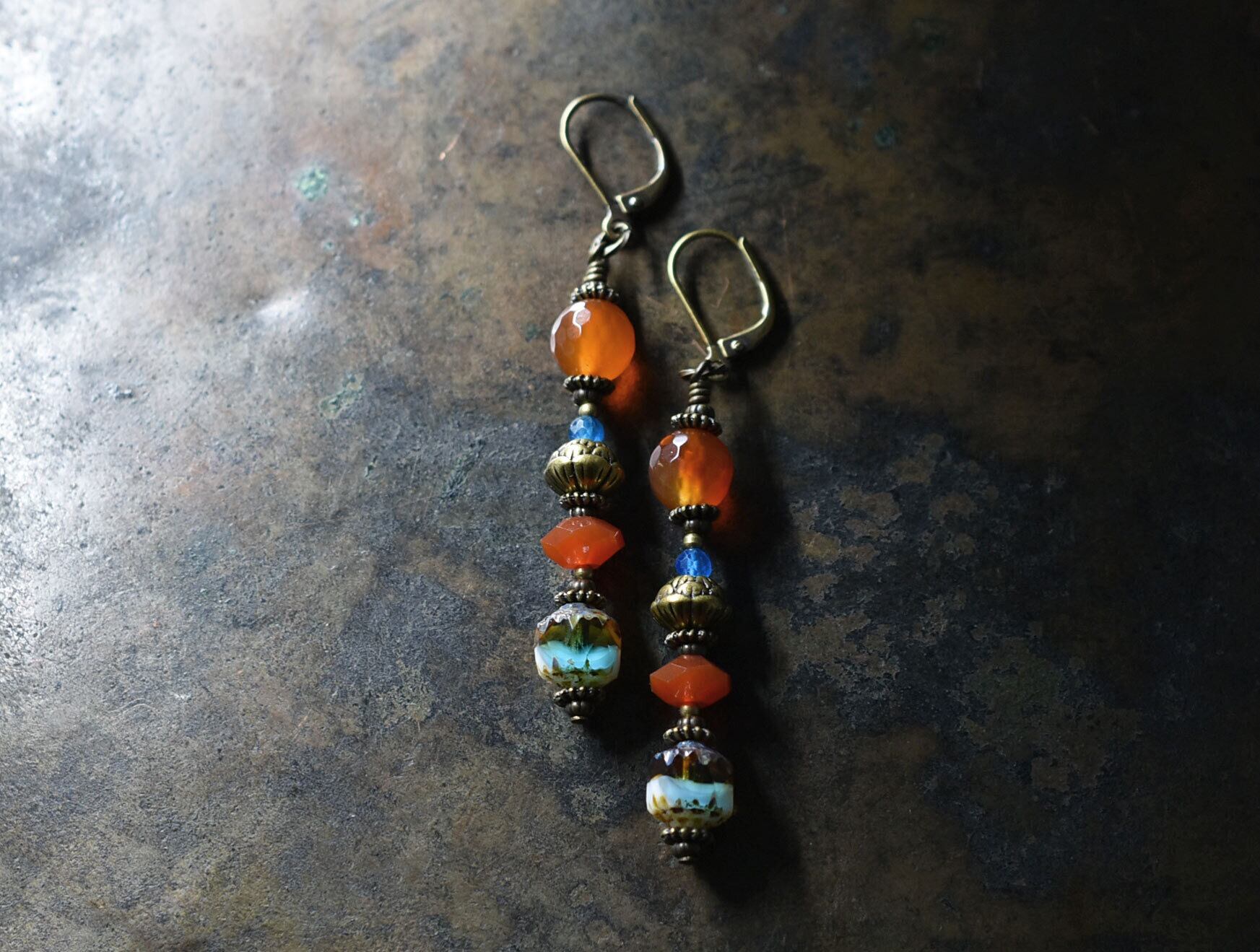 空色&琥珀チェコビーズと蓮華ブラス、カーネリアン、アパタイトを繋いだピアスです。