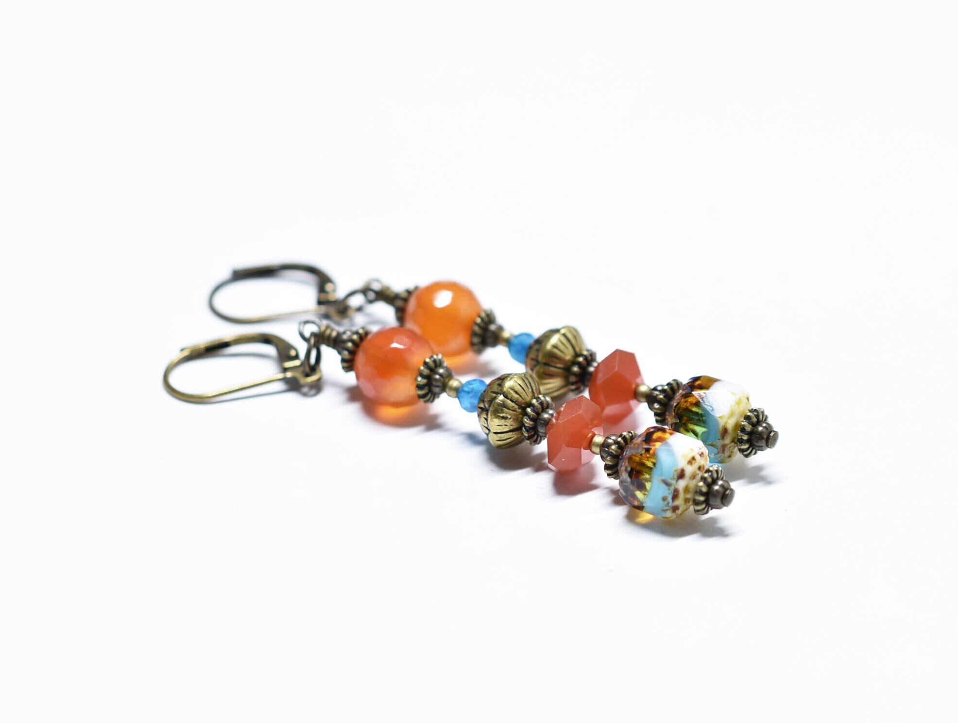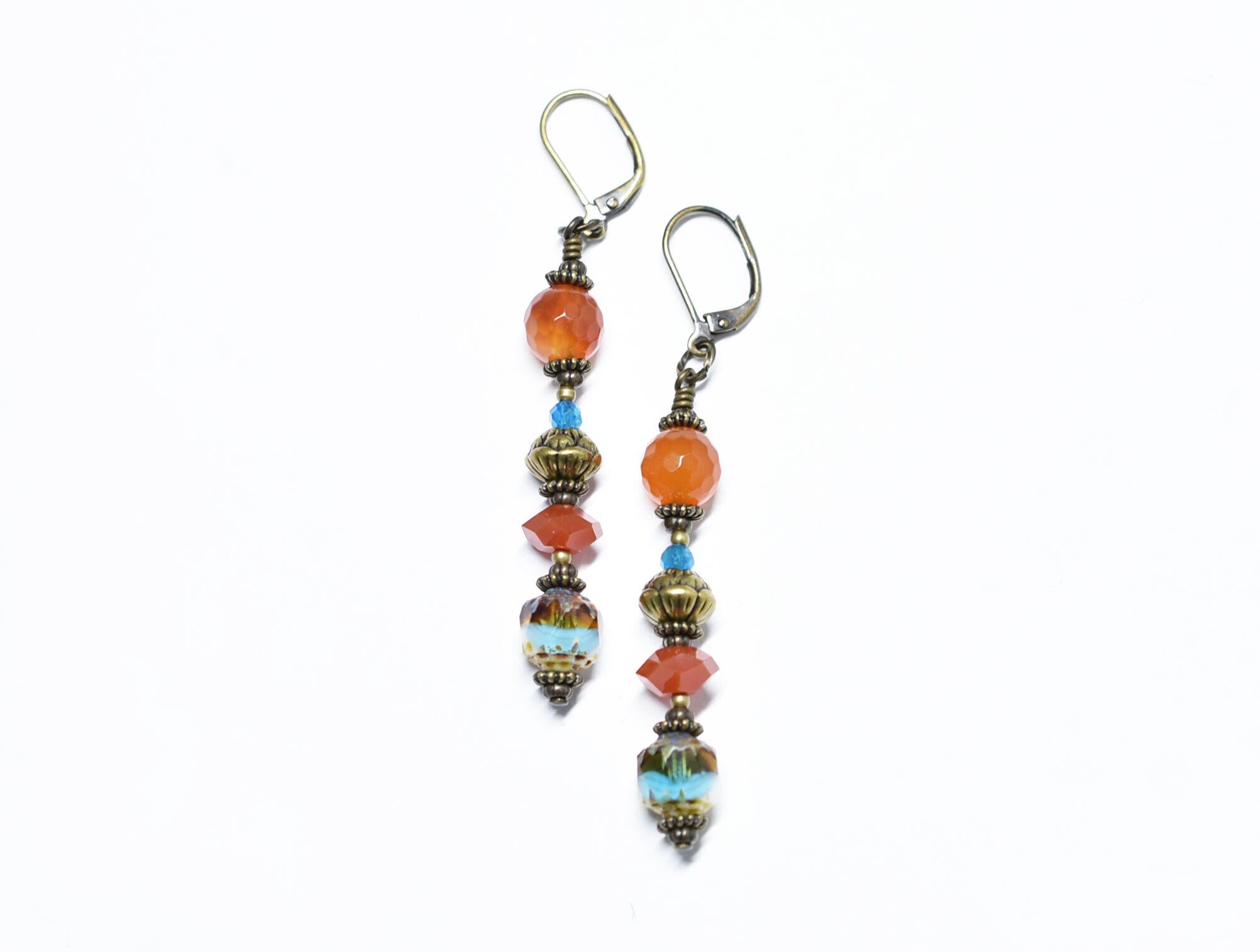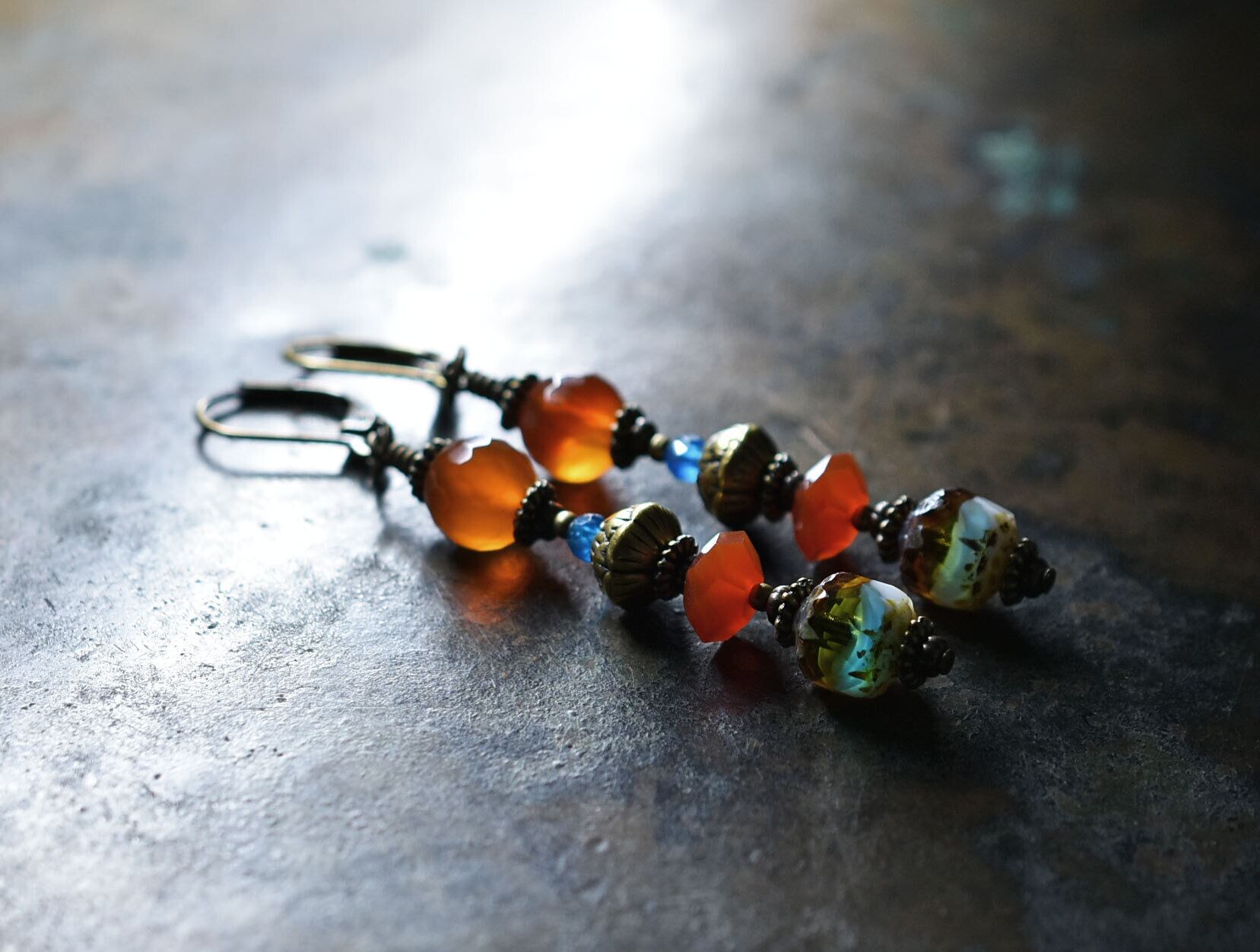 空色&琥珀チェコビーズと蓮華ブラス、カーネリアン、アパタイトのピアス