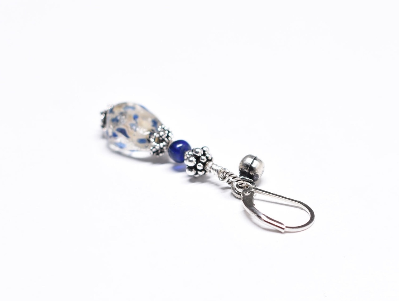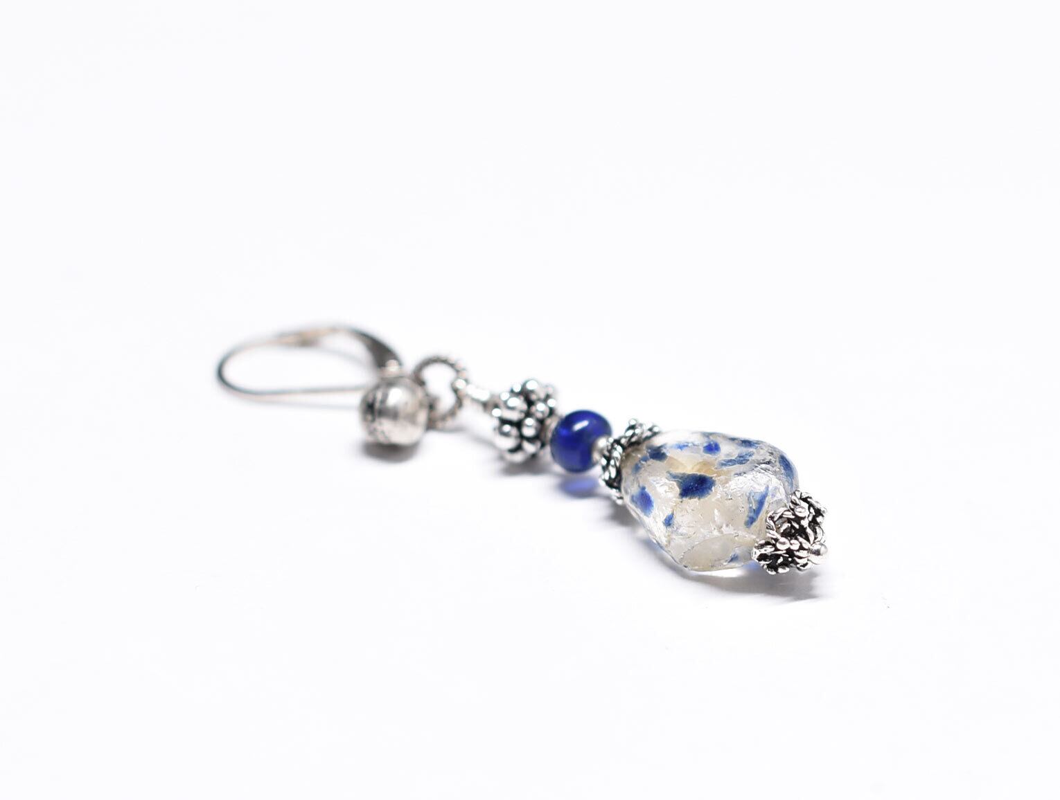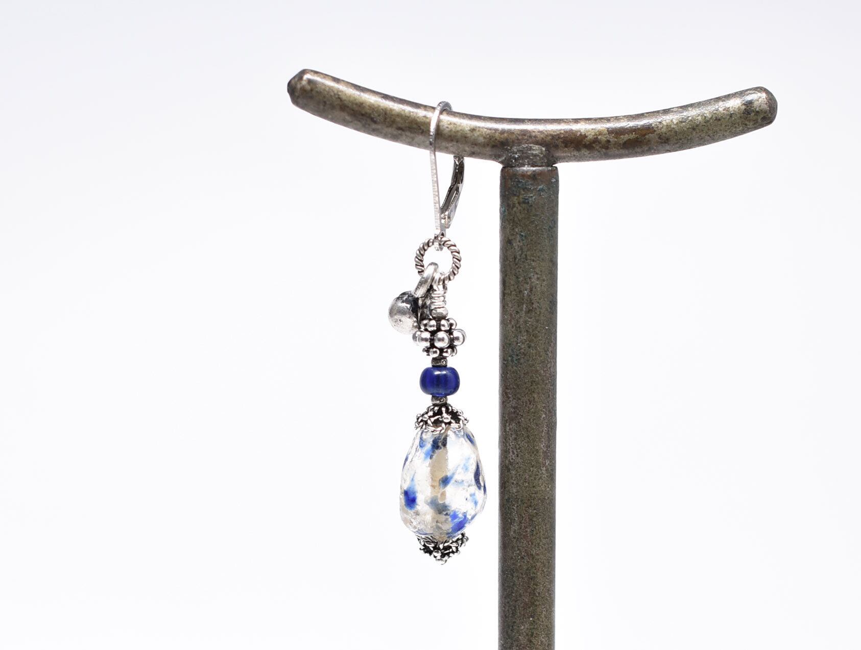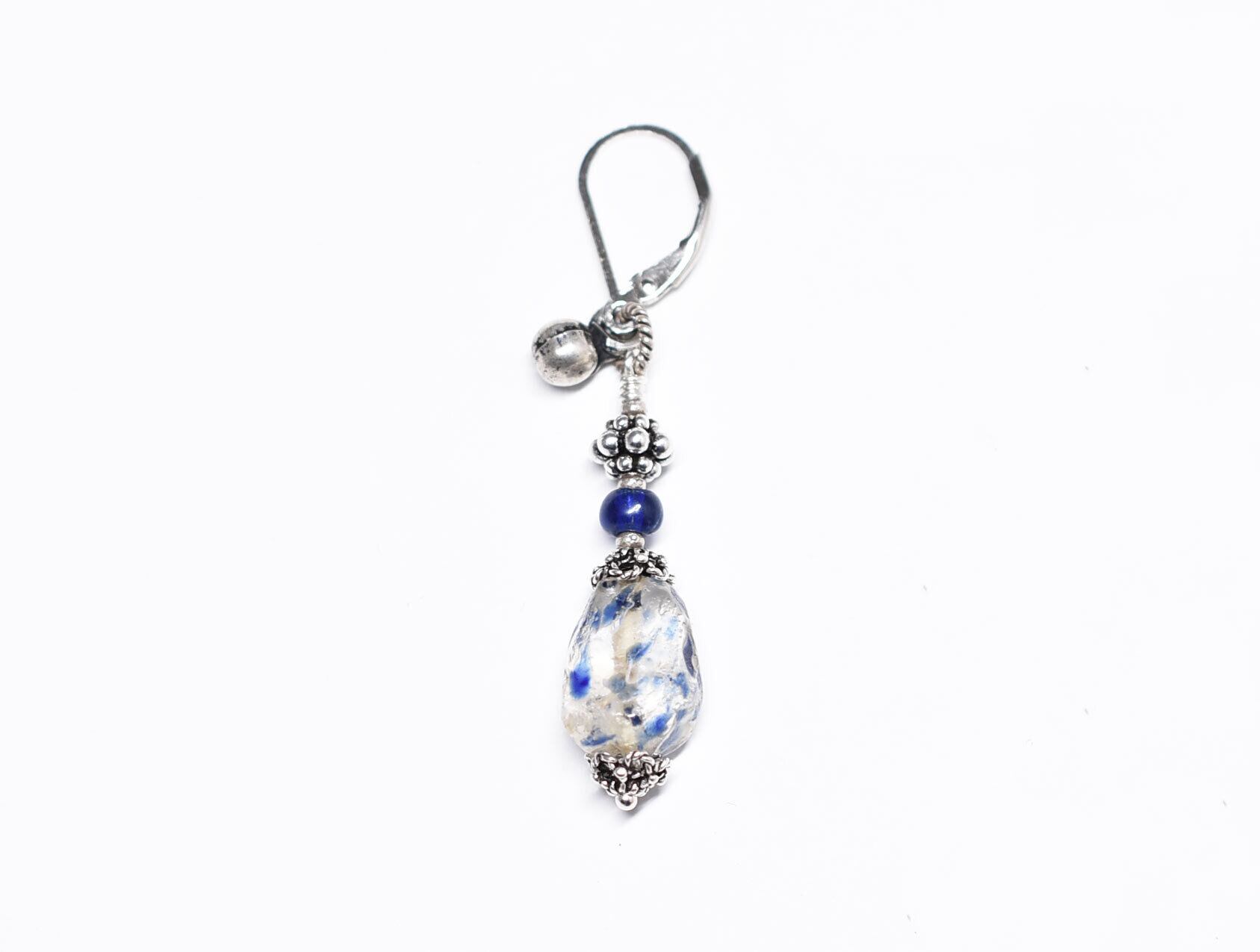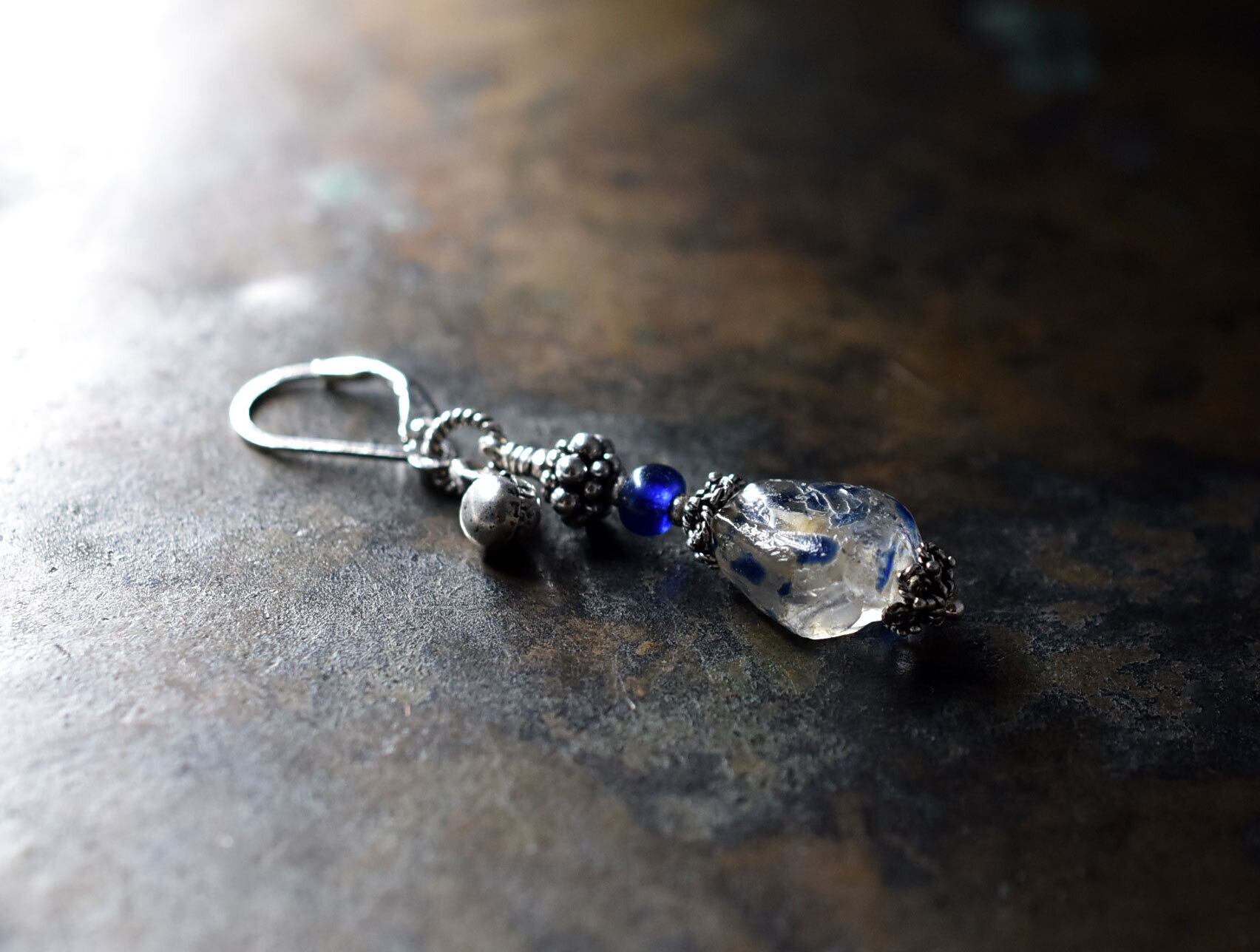 雫型古代施釉水晶とダークブルーアンティークビーズアンティーク、インドシルバー鈴の片耳ピアス