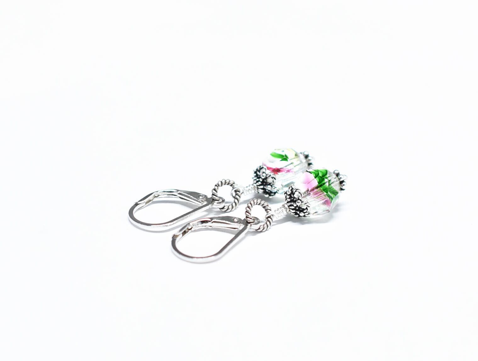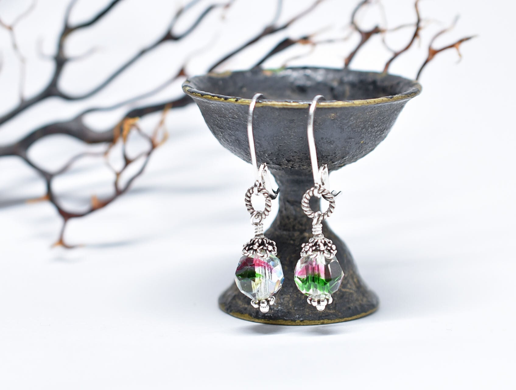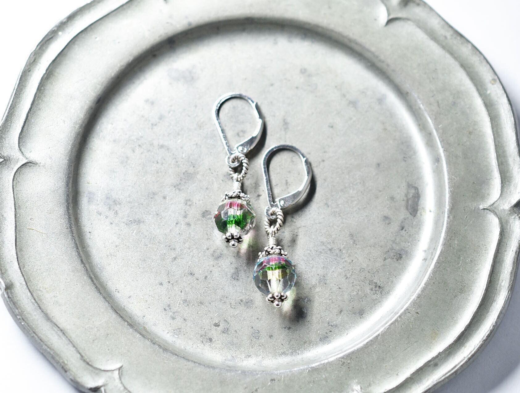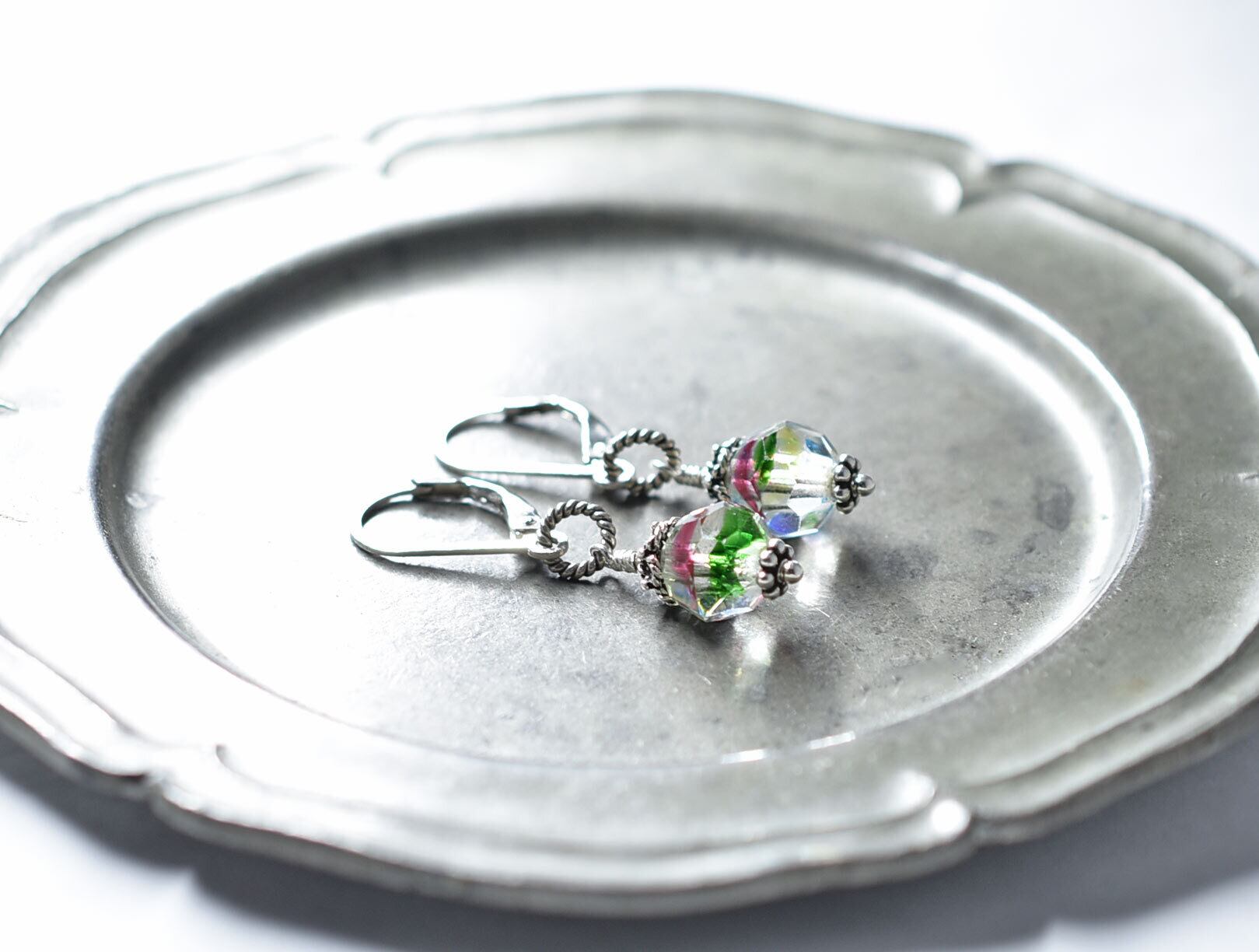 アンティークアイリスガラスの小さな一粒ピアス(グリーン×ピンク)
