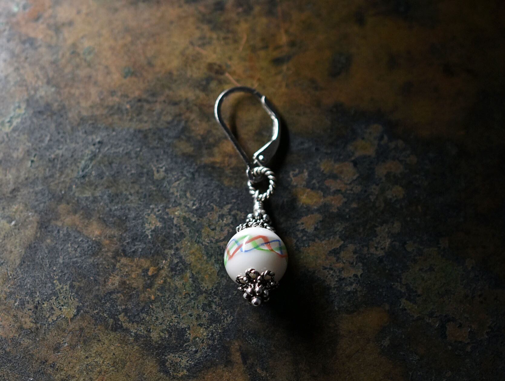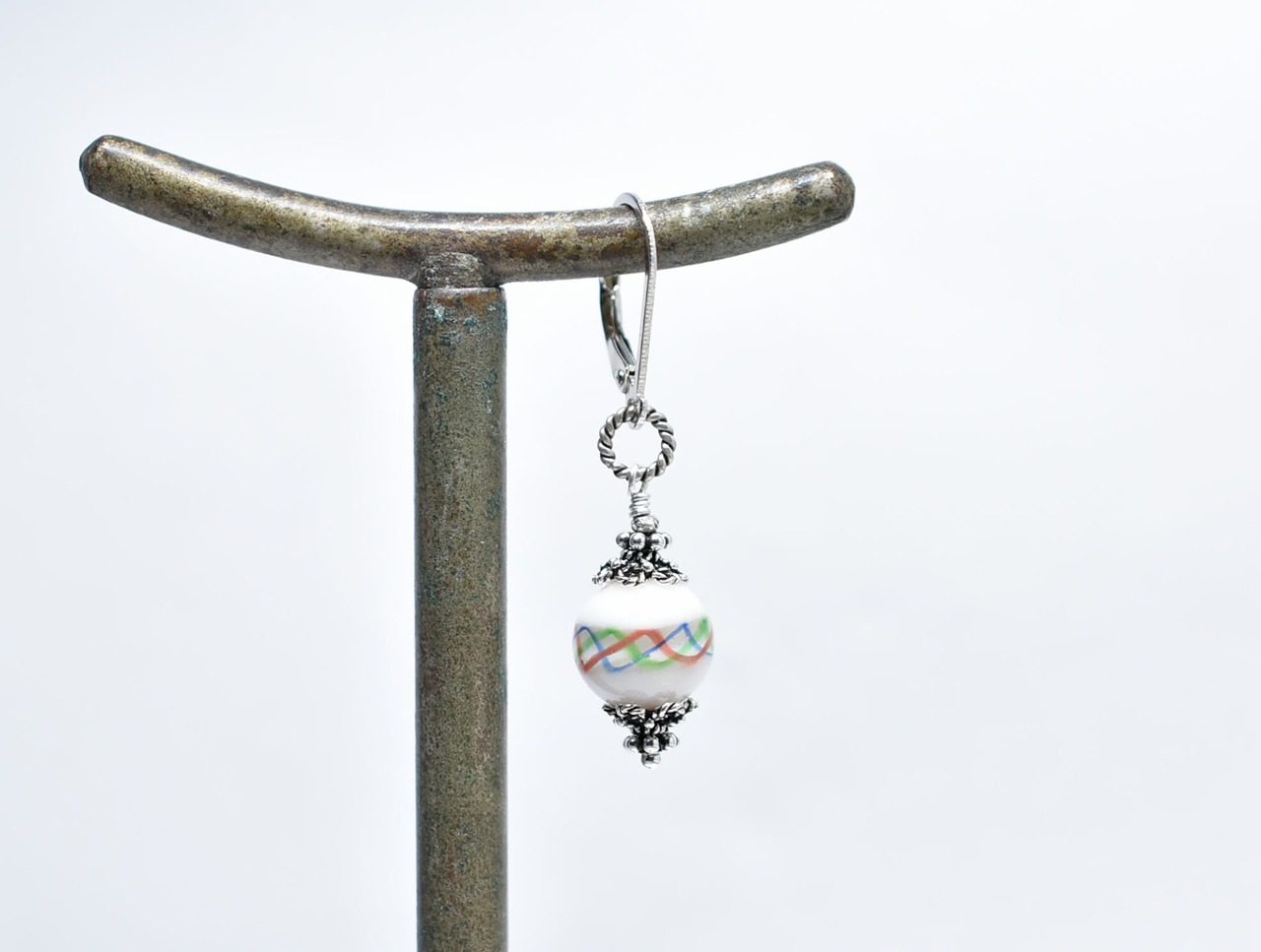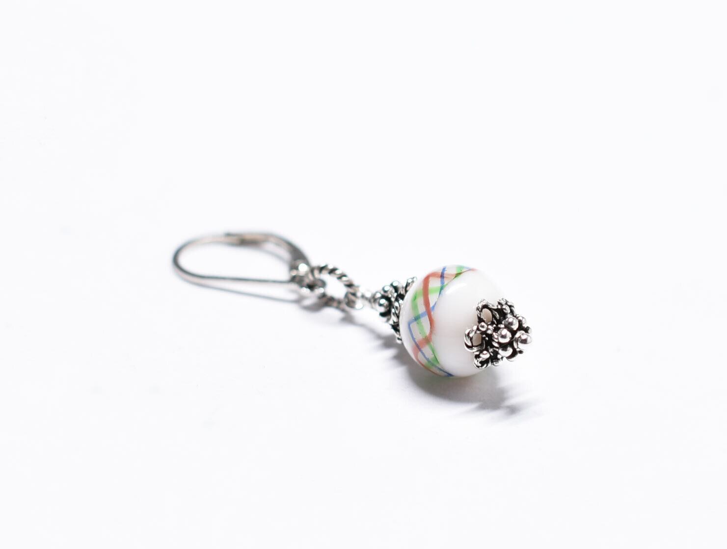 3色の波模様が施された白磁のような江戸とんぼ玉を繋いだ片耳ピアスです。
