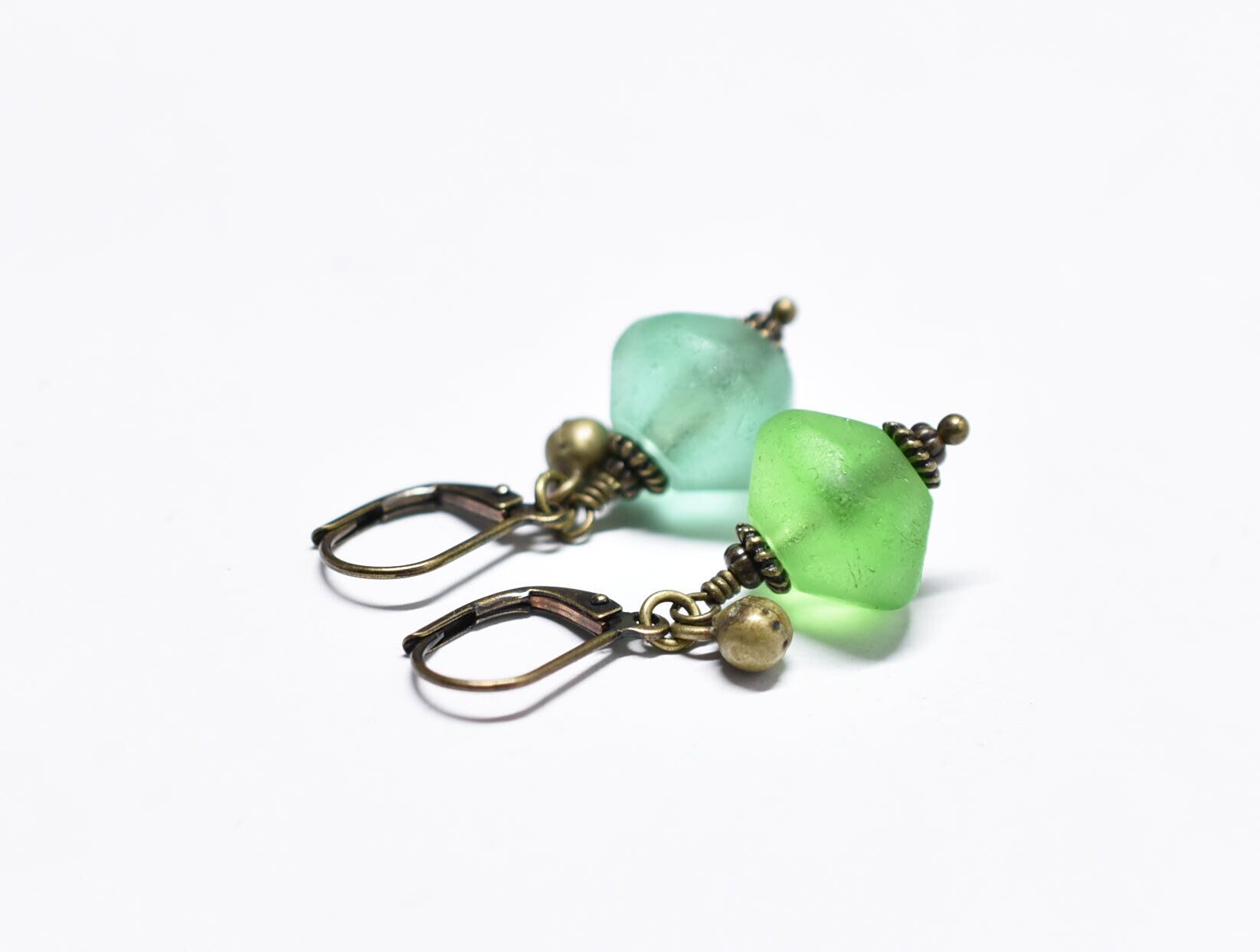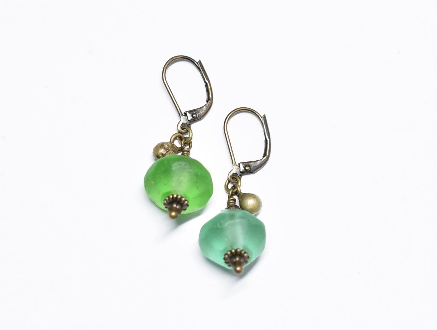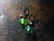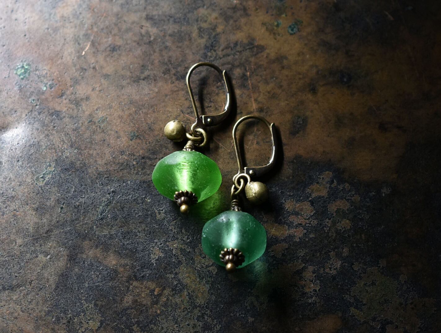 算盤型アンティークウランガラスと民族鈴のピアス