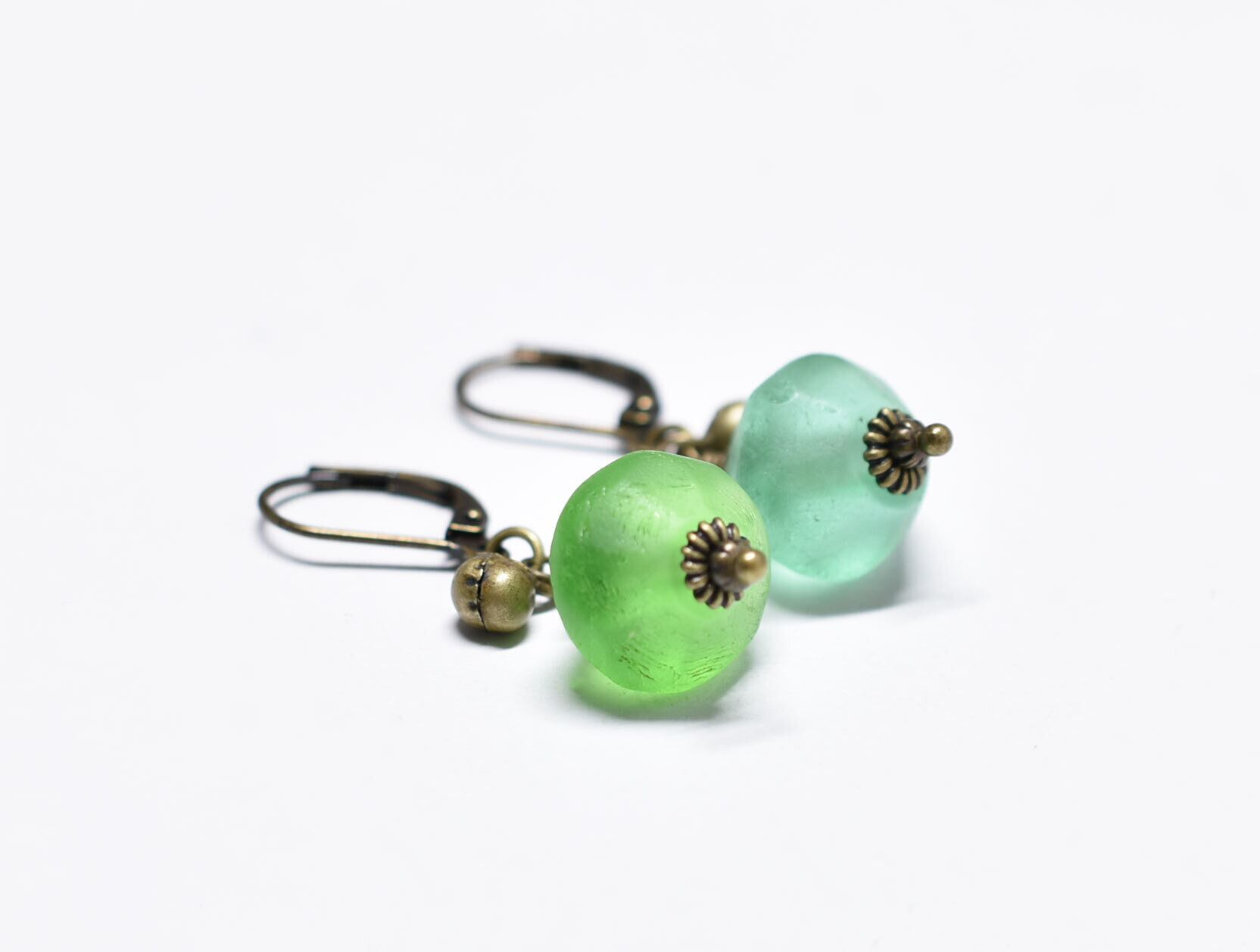 算盤型アンティークウランガラスと、民族鈴を繋いだピアスです。