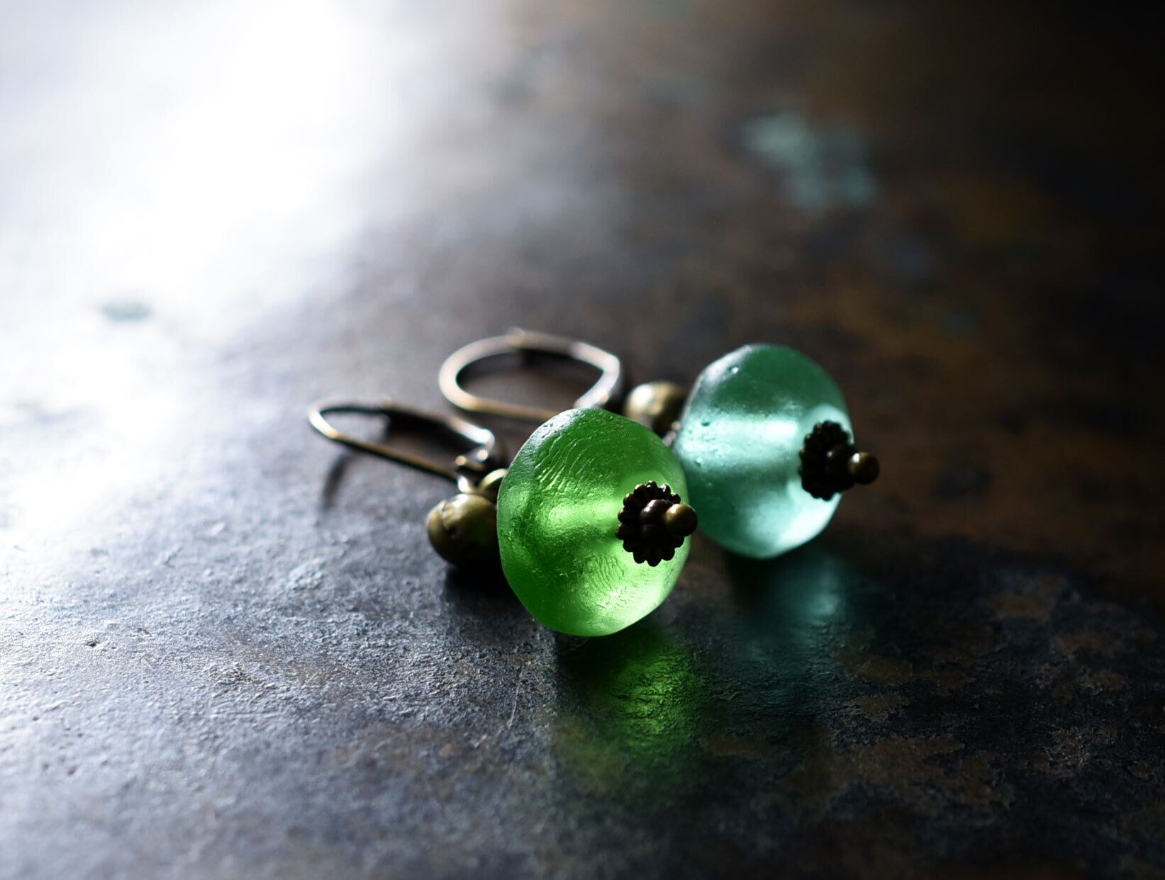 独特なセミクリアグリーンのビーズは、極々微量のウランで発色させています。ブラックライトを当てると光ります!