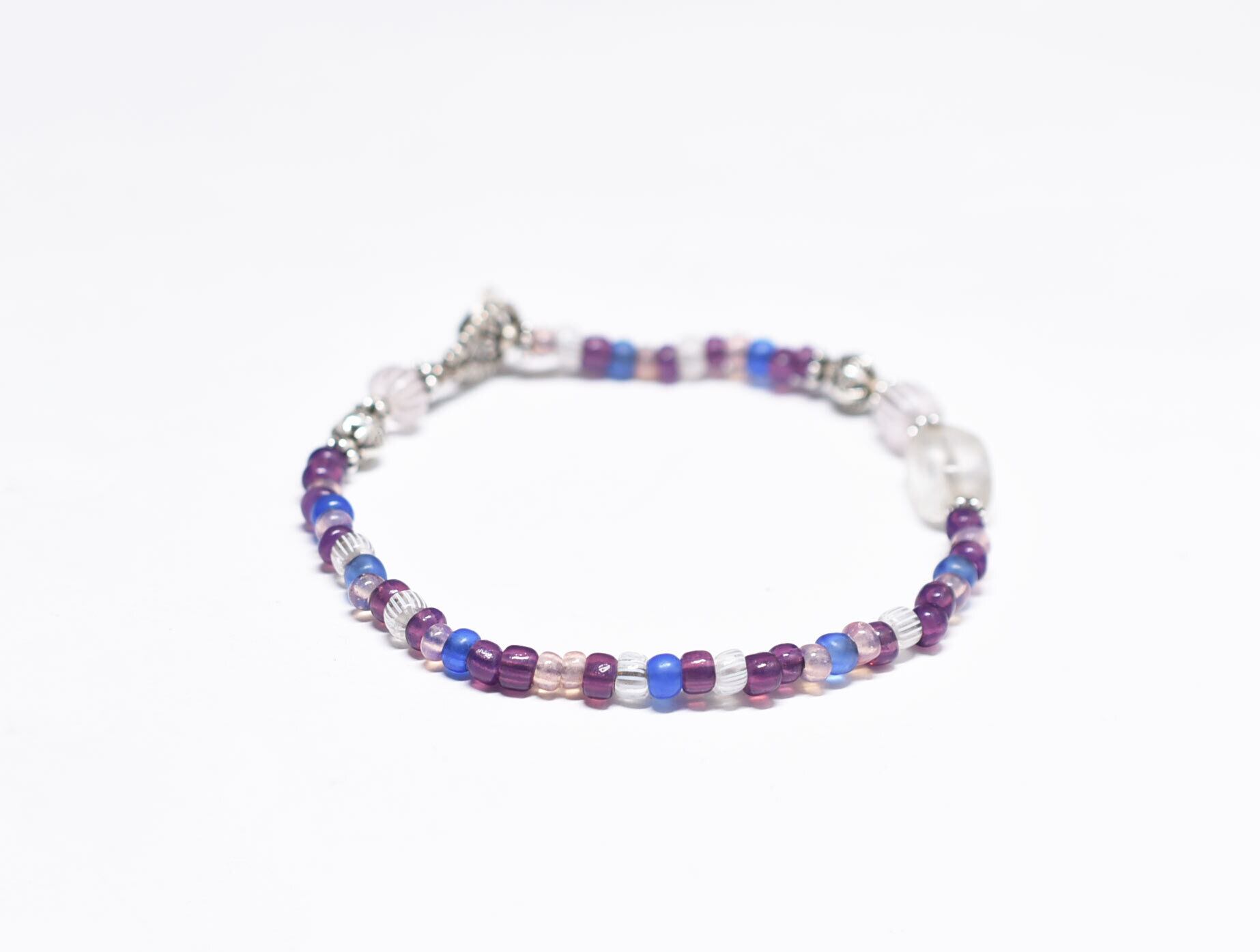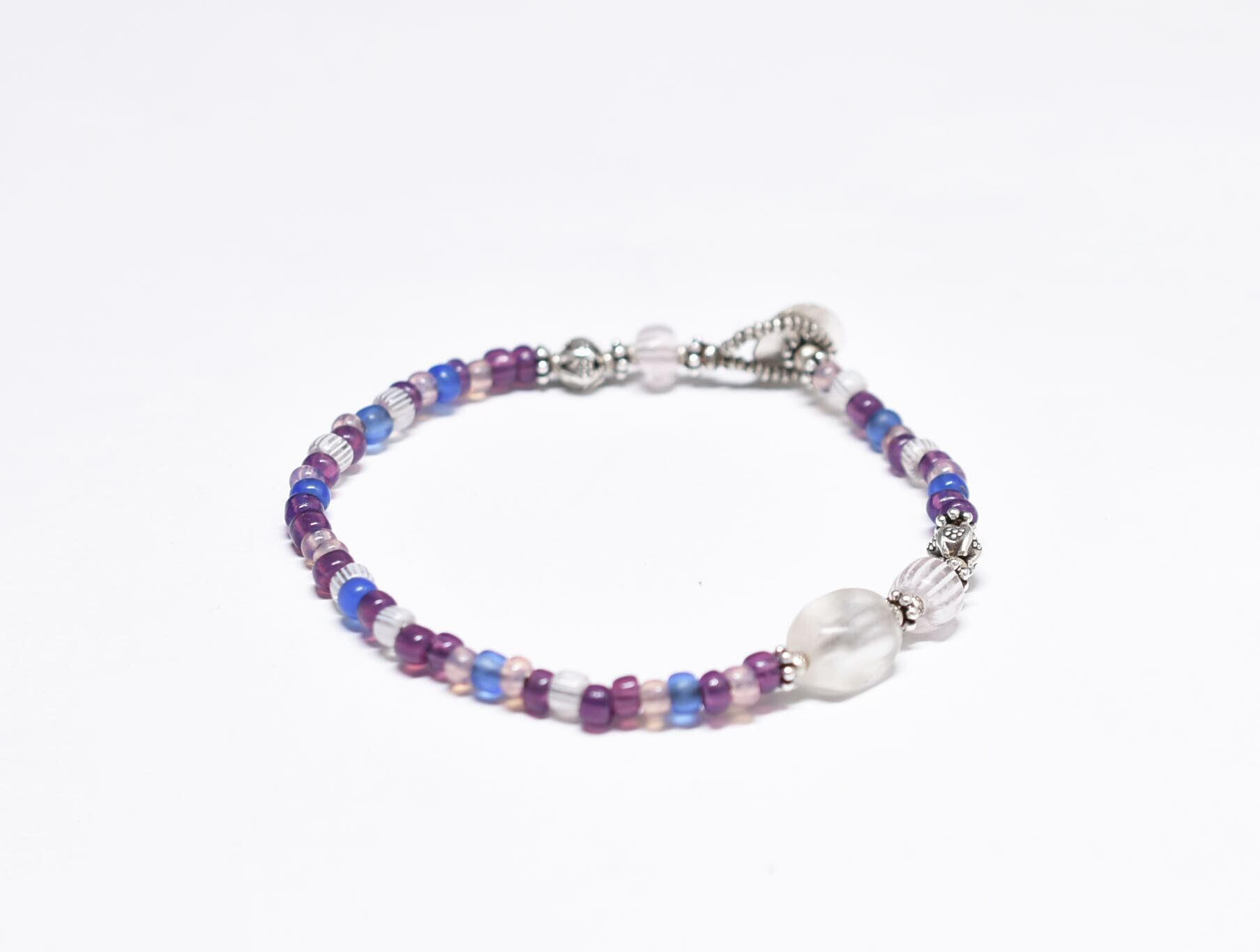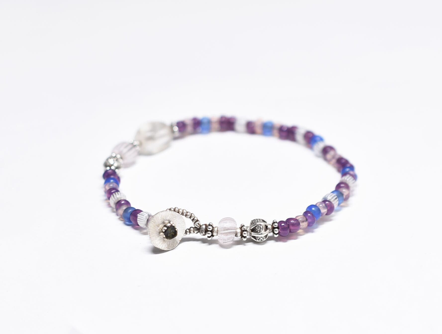 アンティークボヘミアビーズとカレンシルバー、グーズベリー、すみれ色&勿忘草色&桃色ビーズのブレス