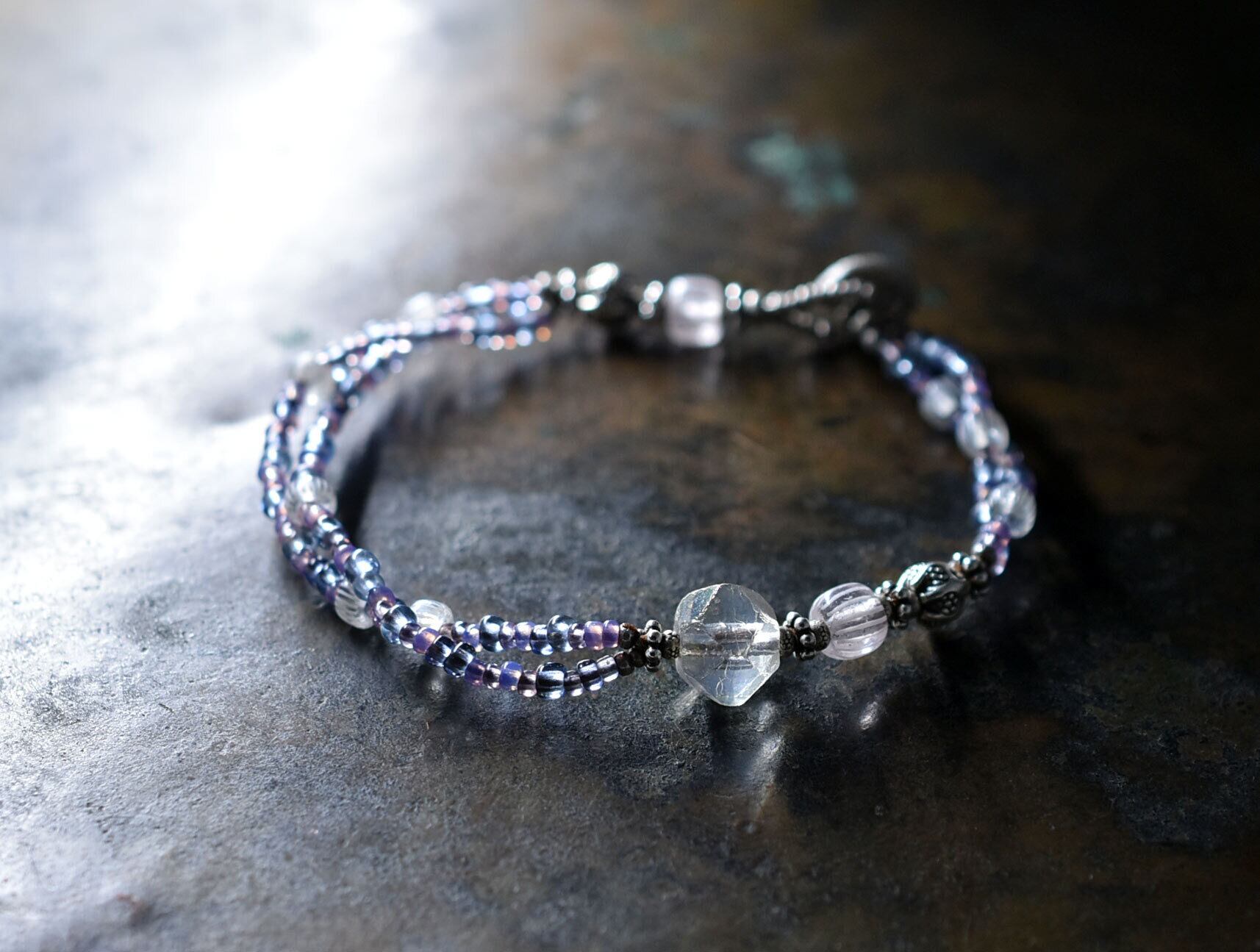 ヴィンテージオーロラチェコビーズとグーズベリー、フランスのヴィンテージビーズ、カレンシルバーなどを繋いだ2連のブレスです。