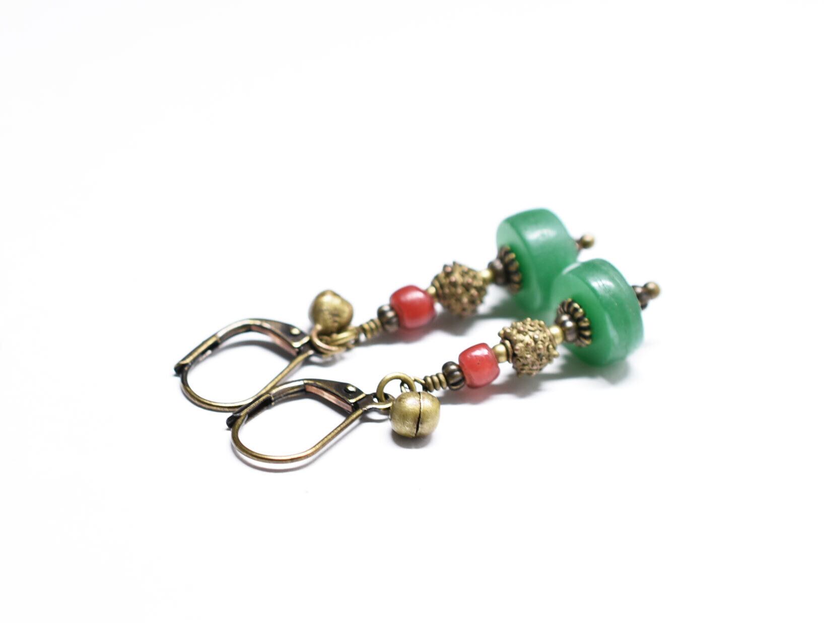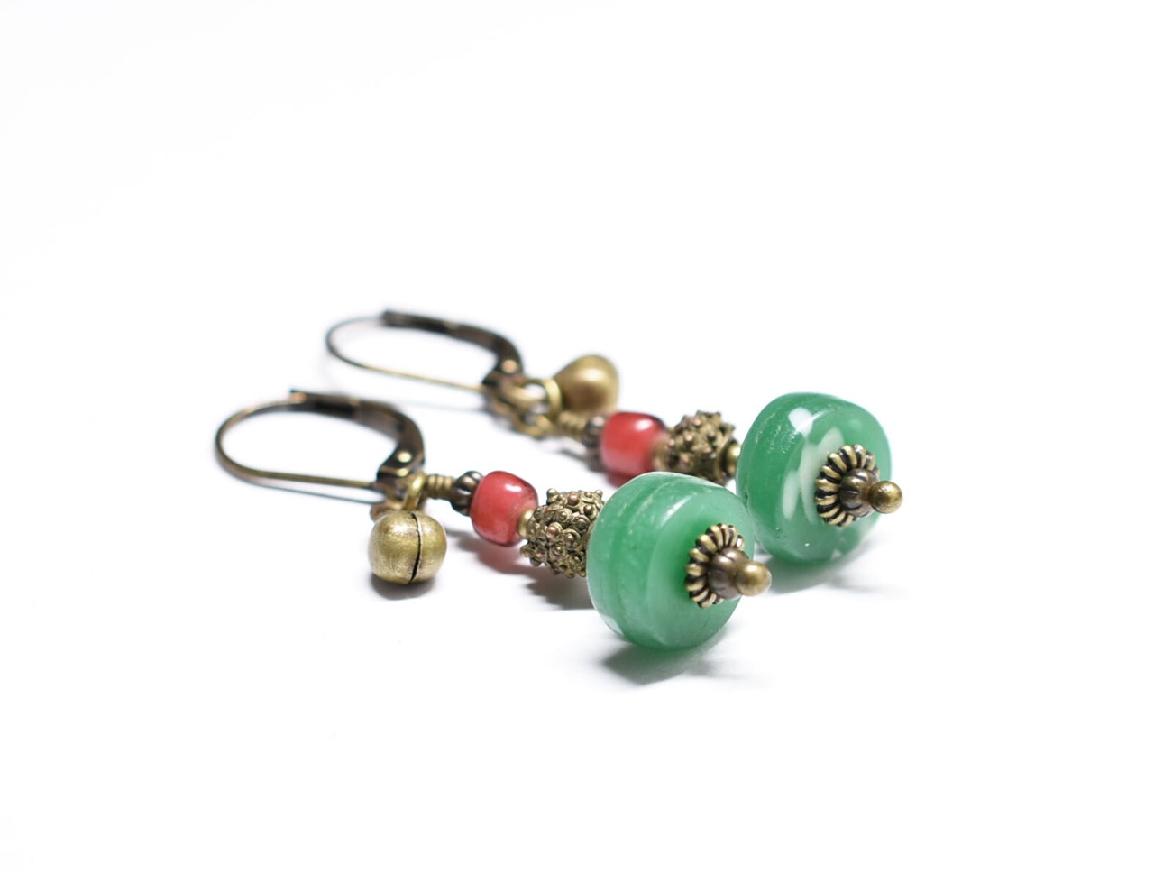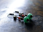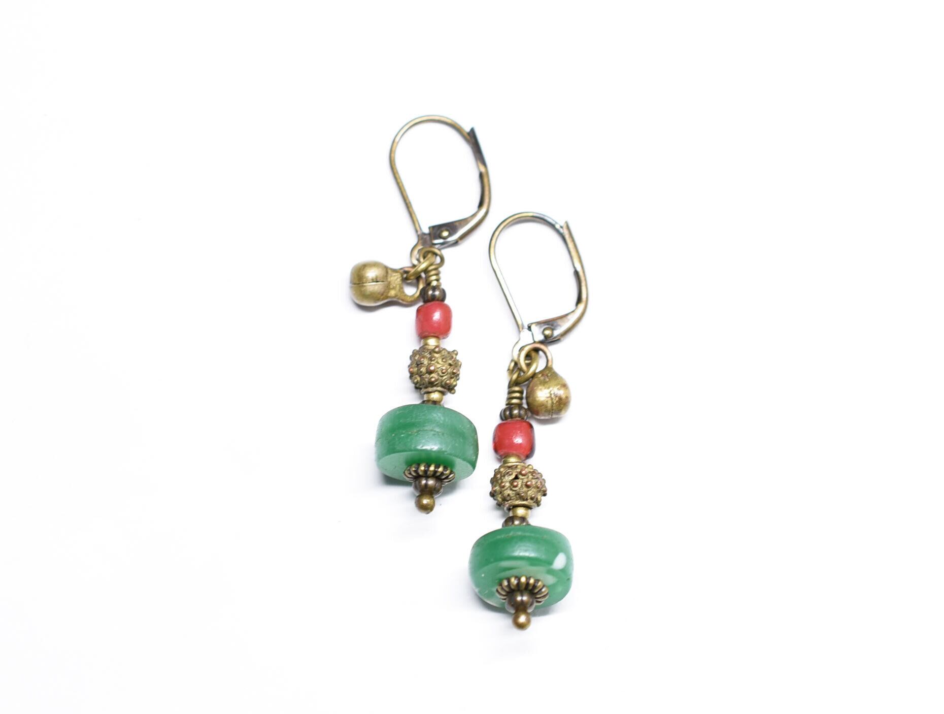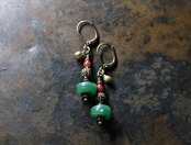 ウランガラスカカンバビーズとつぶつぶブラス、金赤ホワイトハーツ、民族鈴を繋いだピアスです。