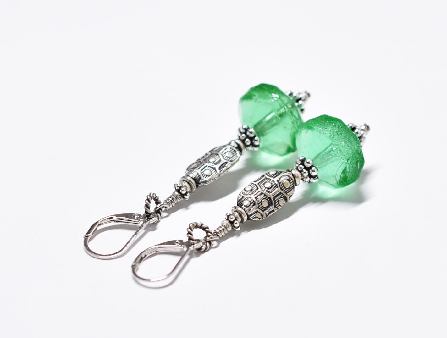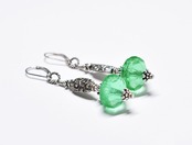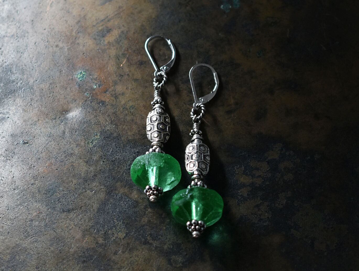 算盤型アンティークウランガラスと亀甲模様シルバーを繋いだボリュームのあるピアスです。
