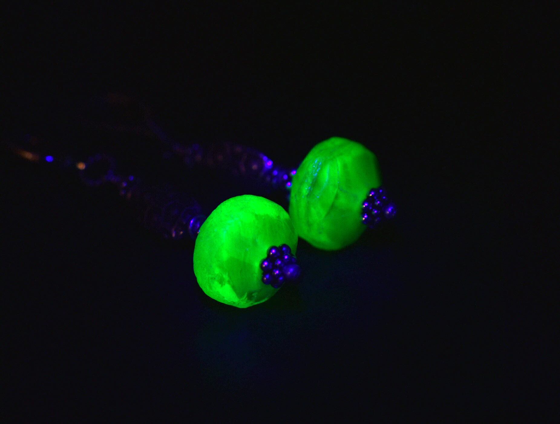 独特なセミクリアーンのビーズは、極々微量のウランで発色させています。ブラックライトを当てると光ります!