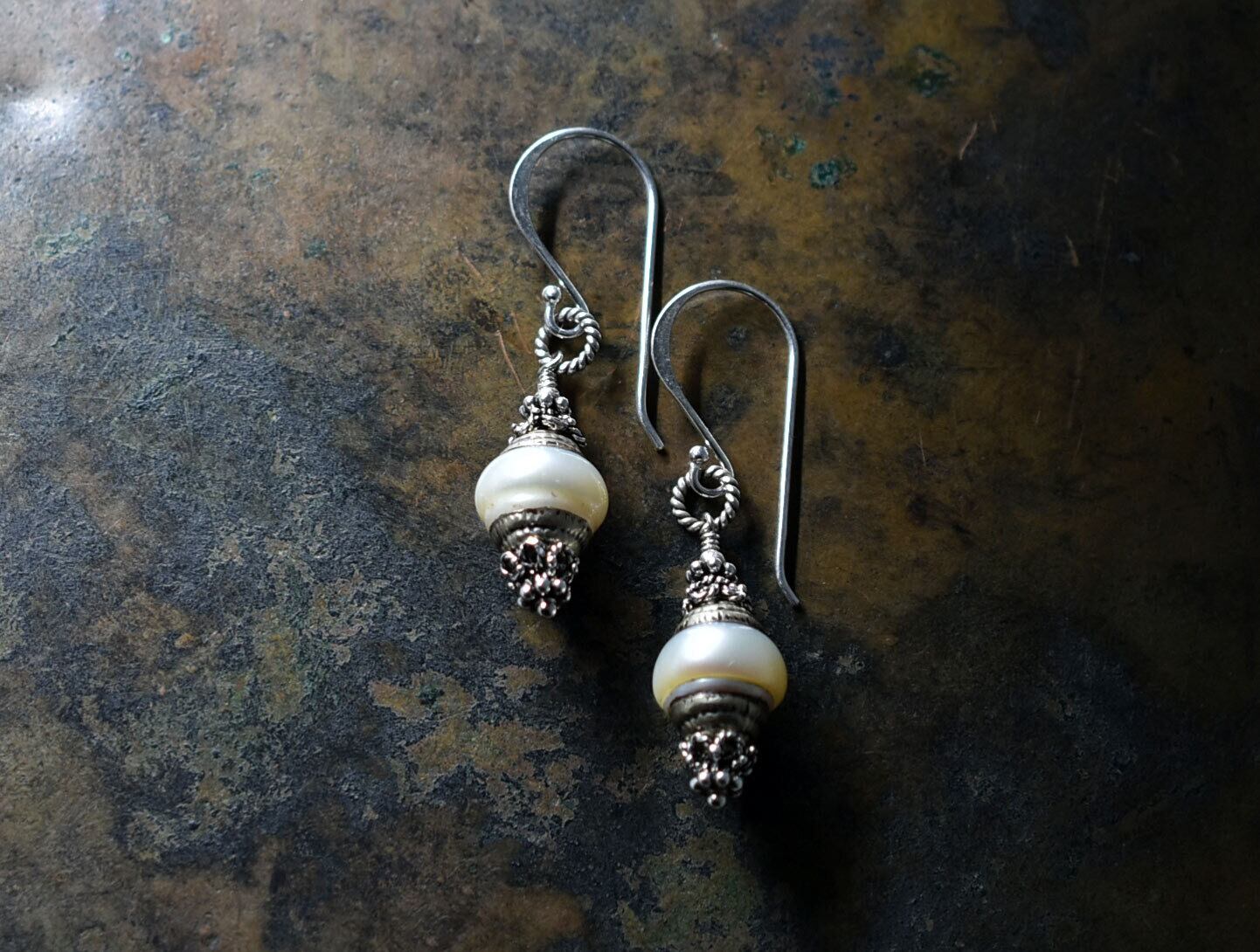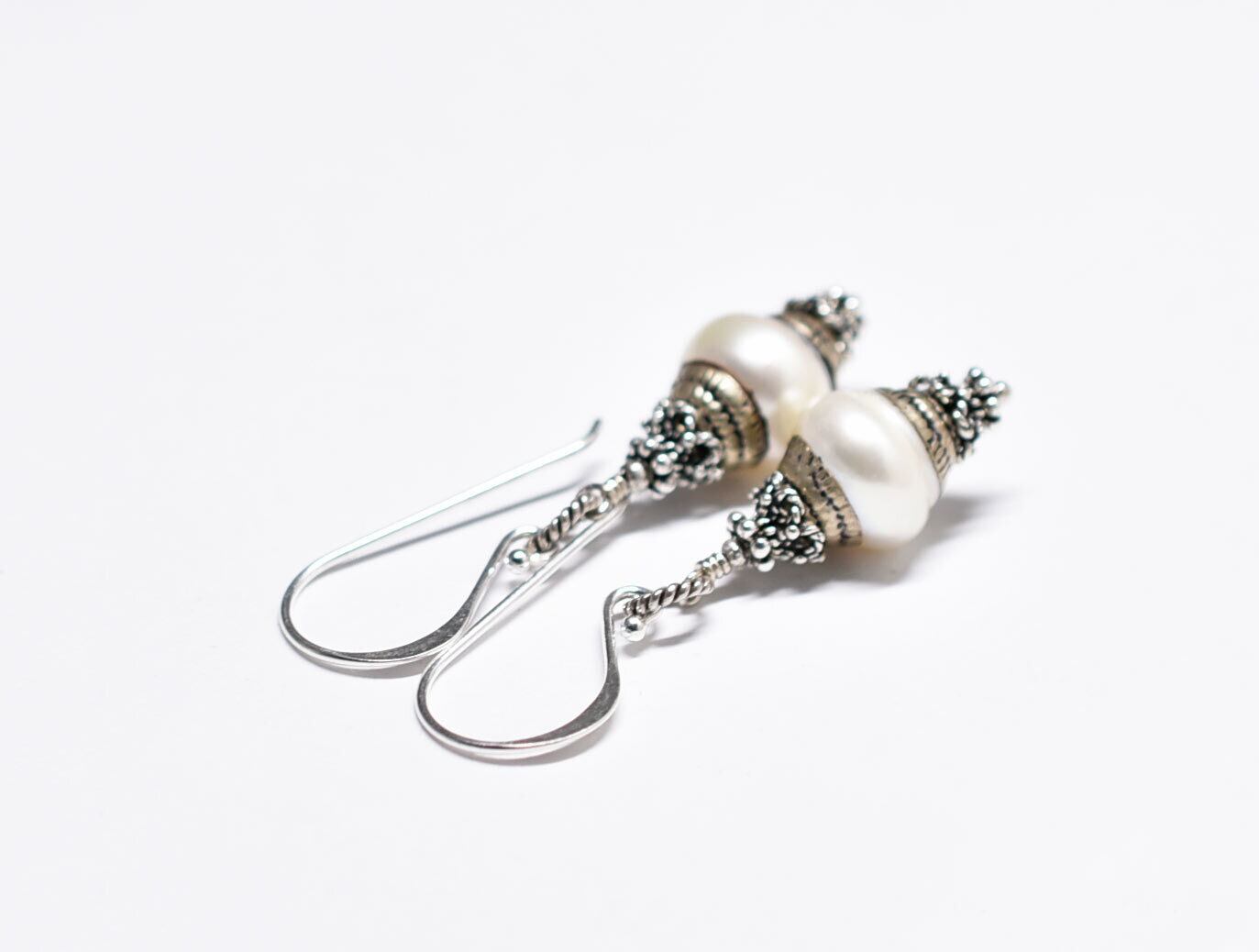 アンティークシルバー装飾パールのフックピアス