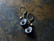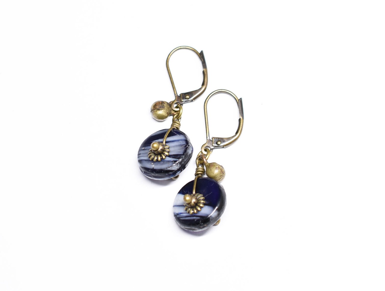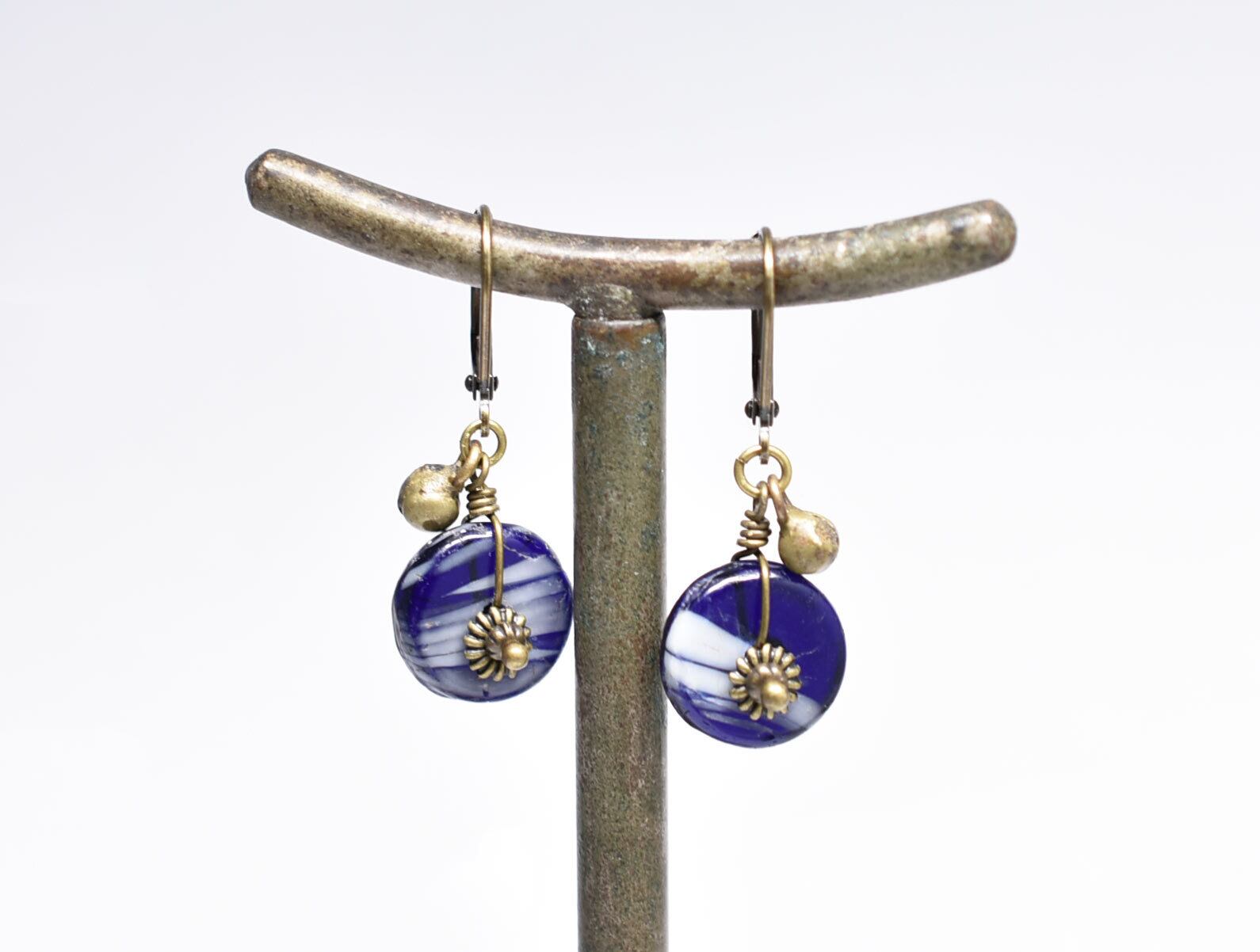 瑠璃色&ホワイトマーブルカカンバビーズと民族鈴のピアス