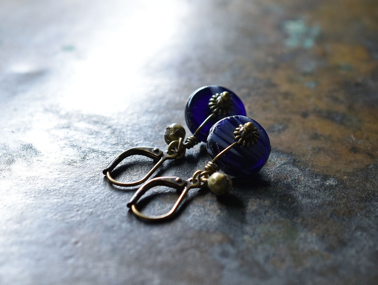 アンティークボヘミアビーズの魅力を楽しめる、シックな色合いのピアスです。