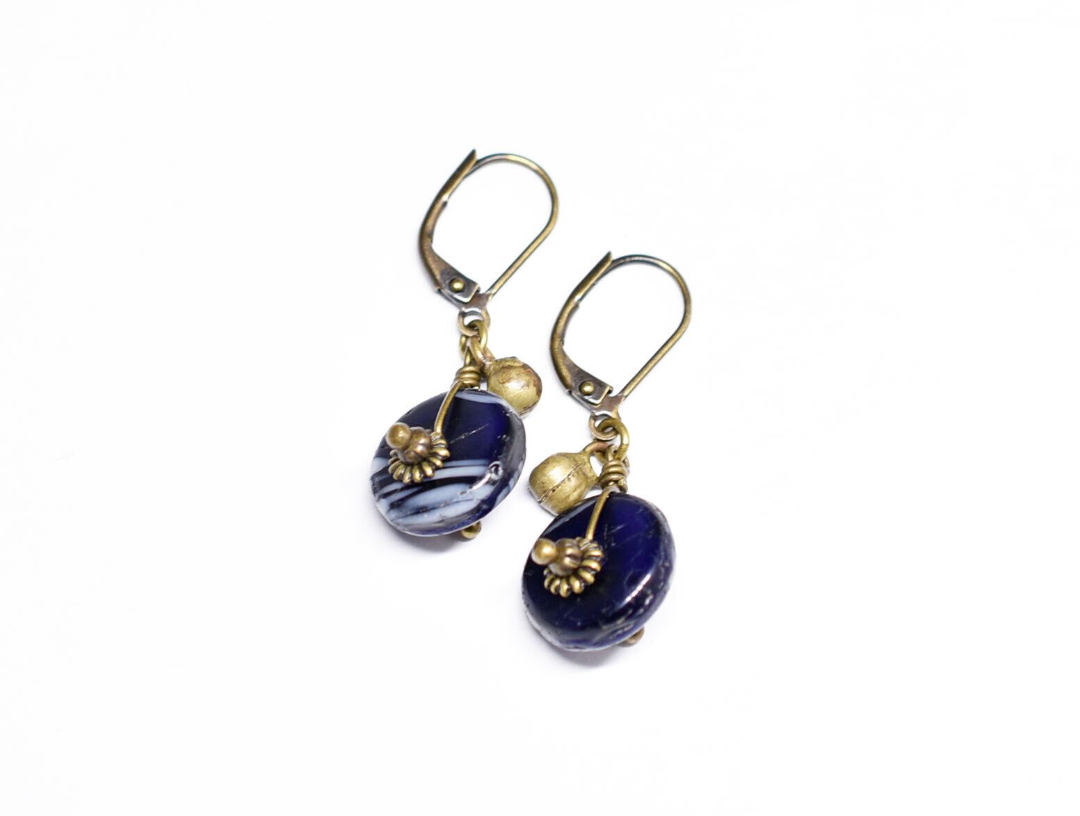 瑠璃色&ホワイトマーブルカカンバビーズと民族鈴を繋いだピアスです。