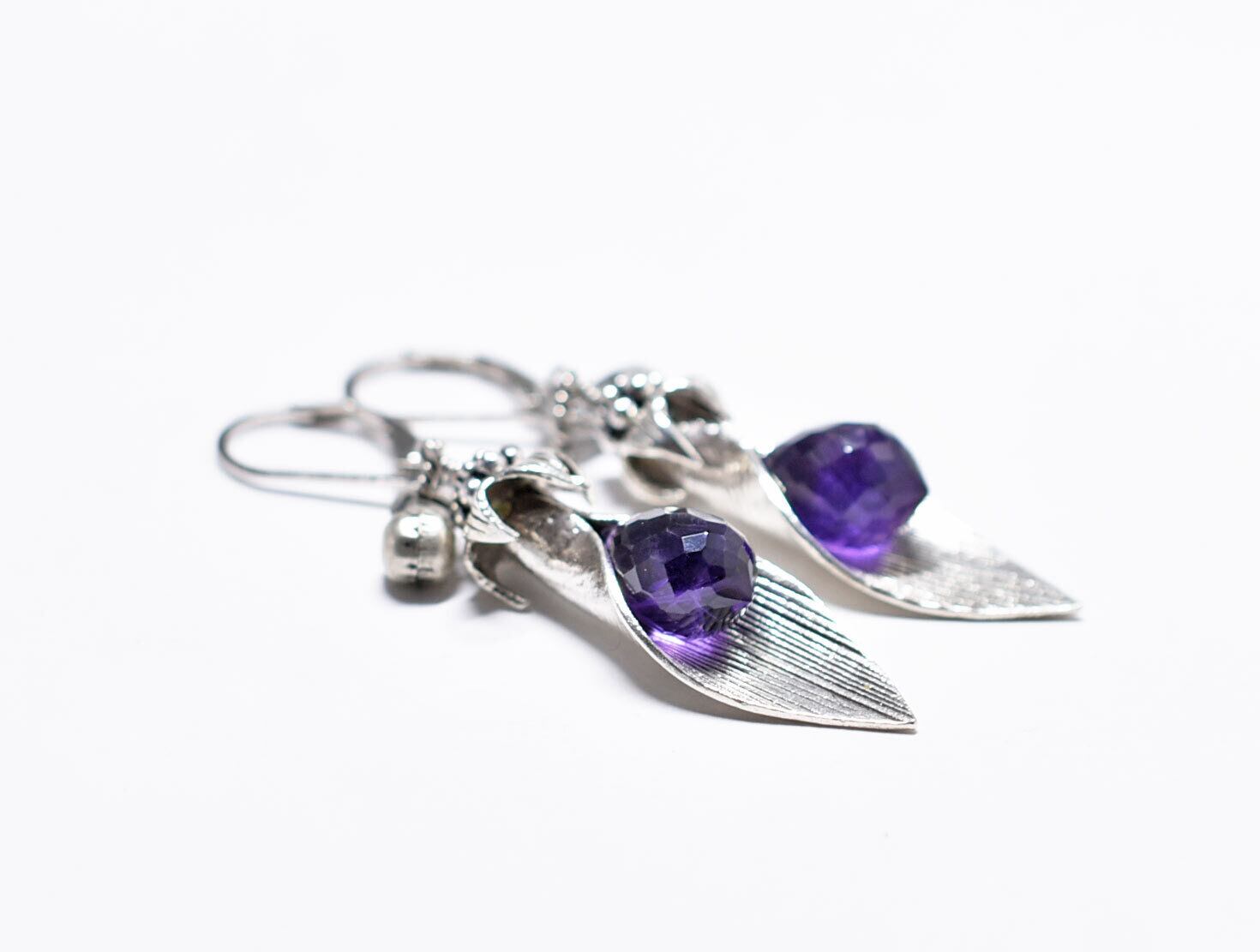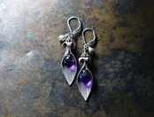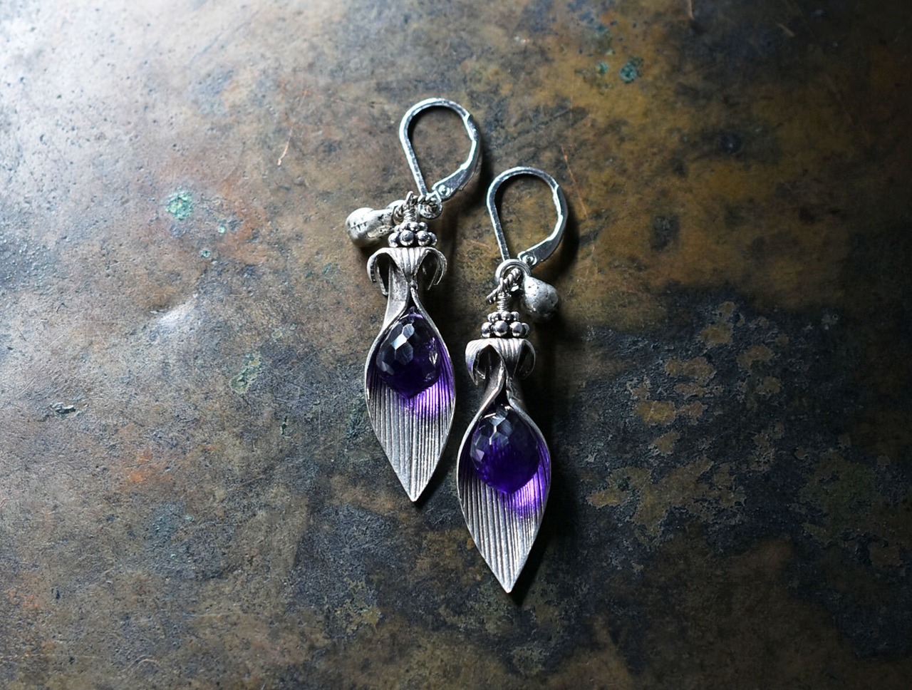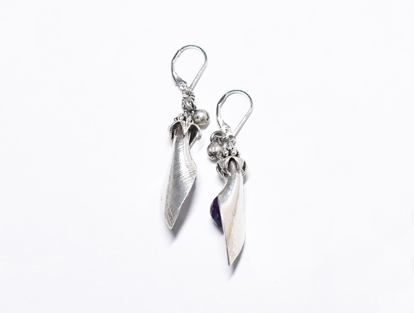 葉っぱのようなカレンシルバーとアメジスト、インドシルバー鈴のピアス