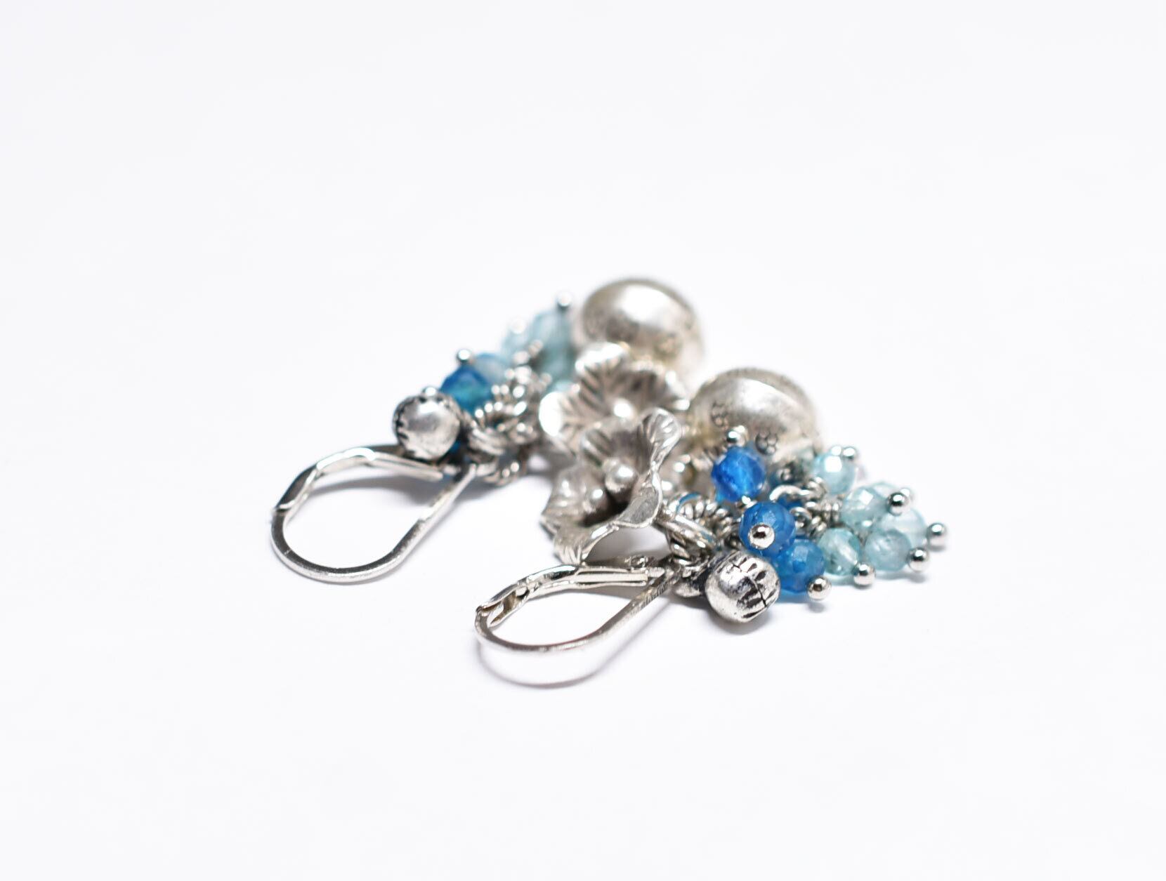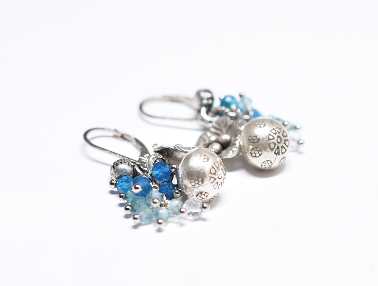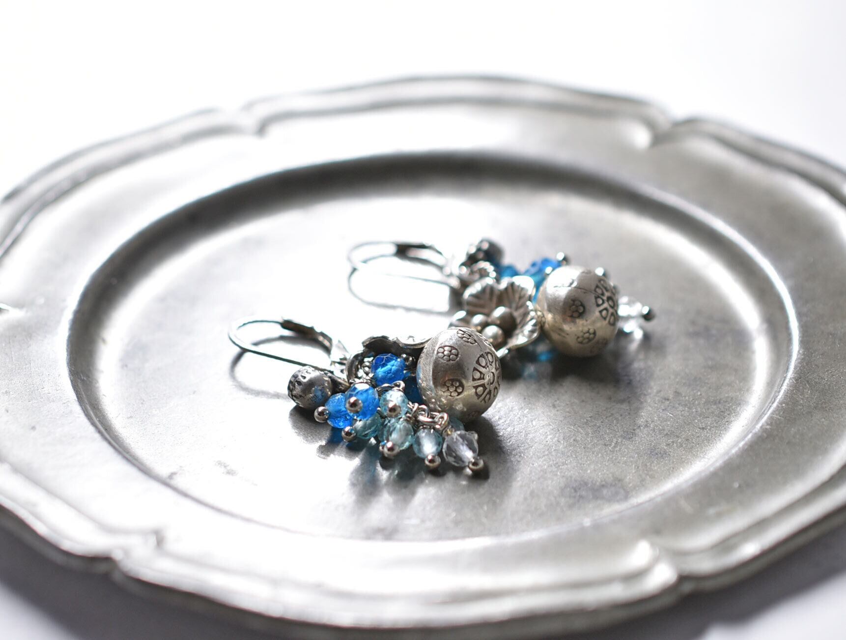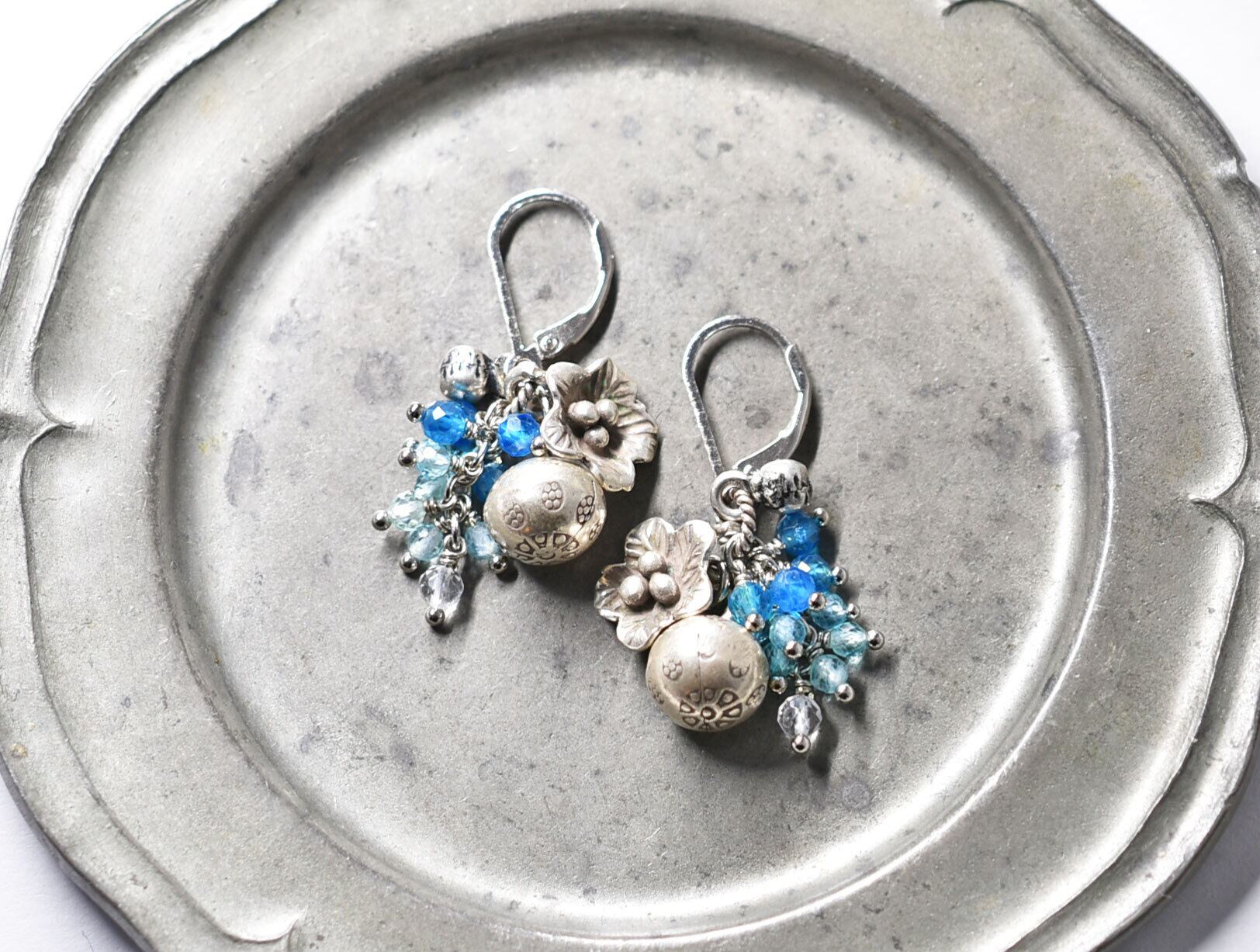 鈴とお花カレンシルバー、たわわなアパタイト、アクアマリン、クォーツ、インドシルバー鈴のピアス