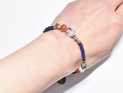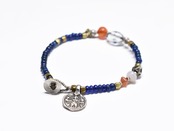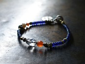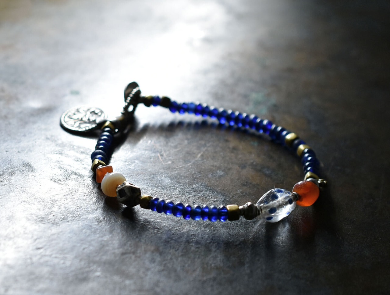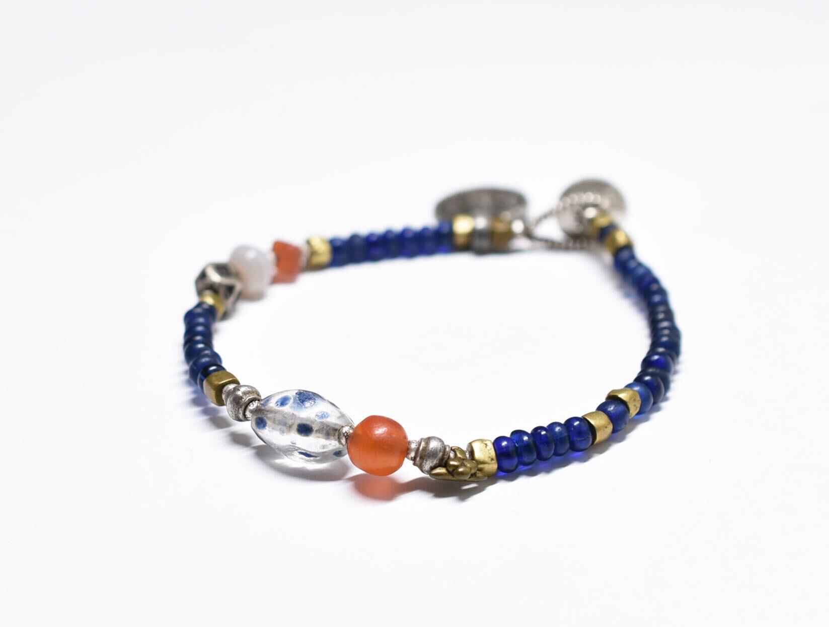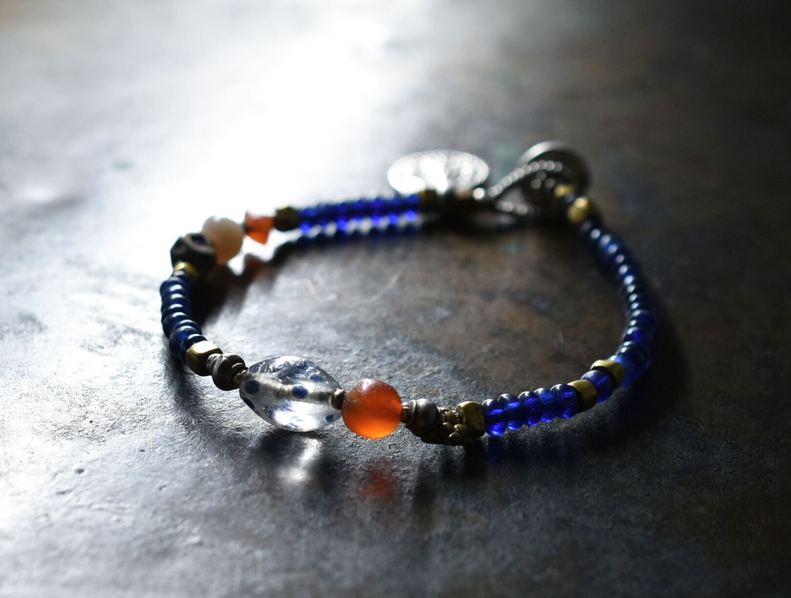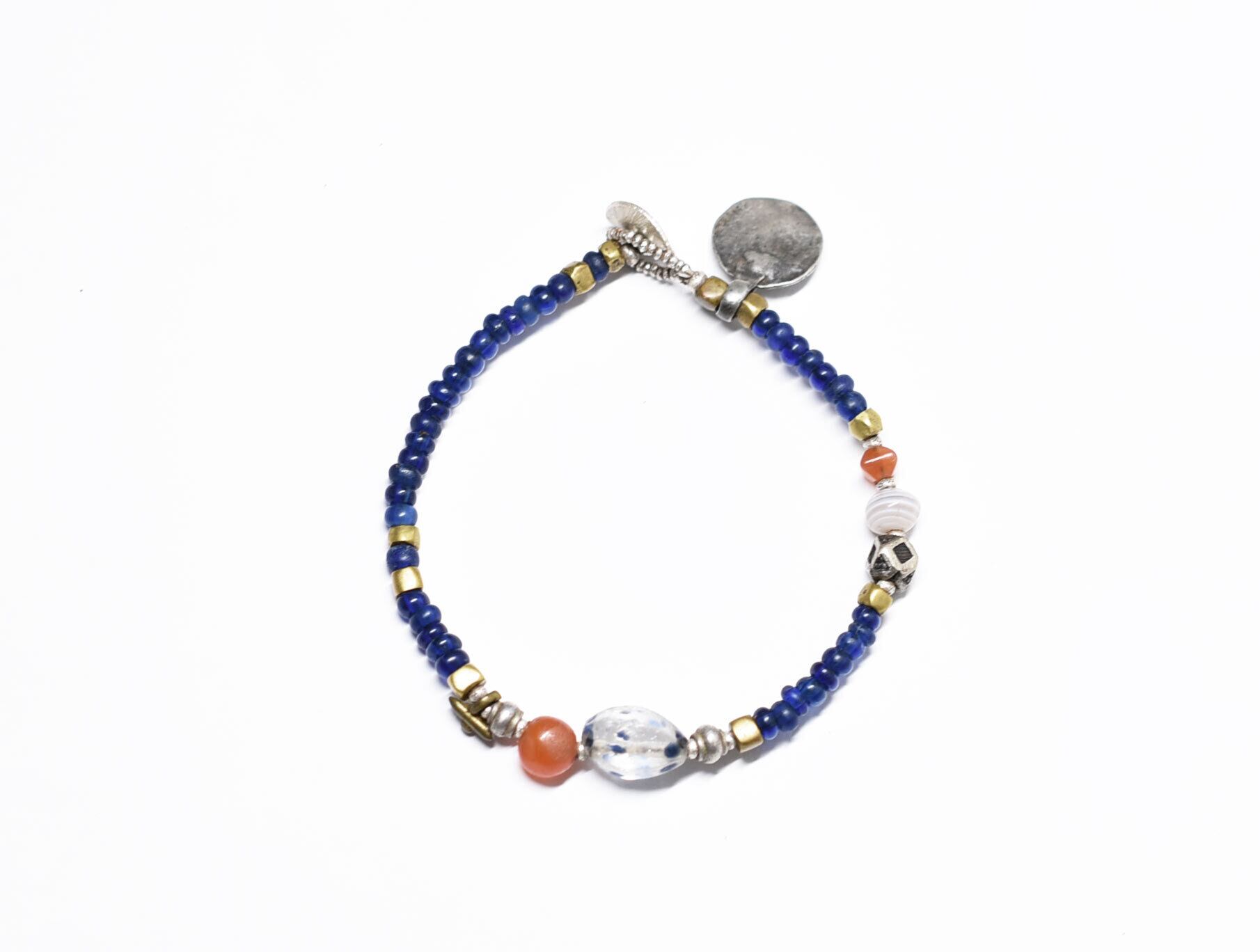 古代施釉水晶、古代カーネリアン、古代瑪瑙、トゥアレグビーズ、ダークブルービーズ、oldインドシルバーチャーム、oldオリッサブラス、oldチンシルバーなどを繋いだブレスです。