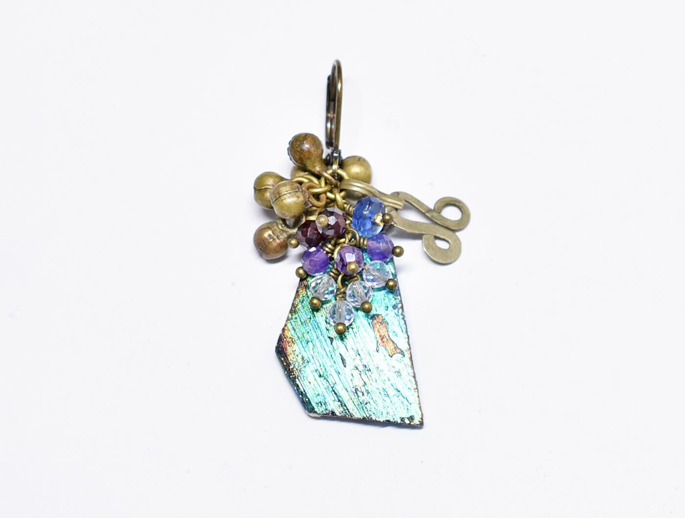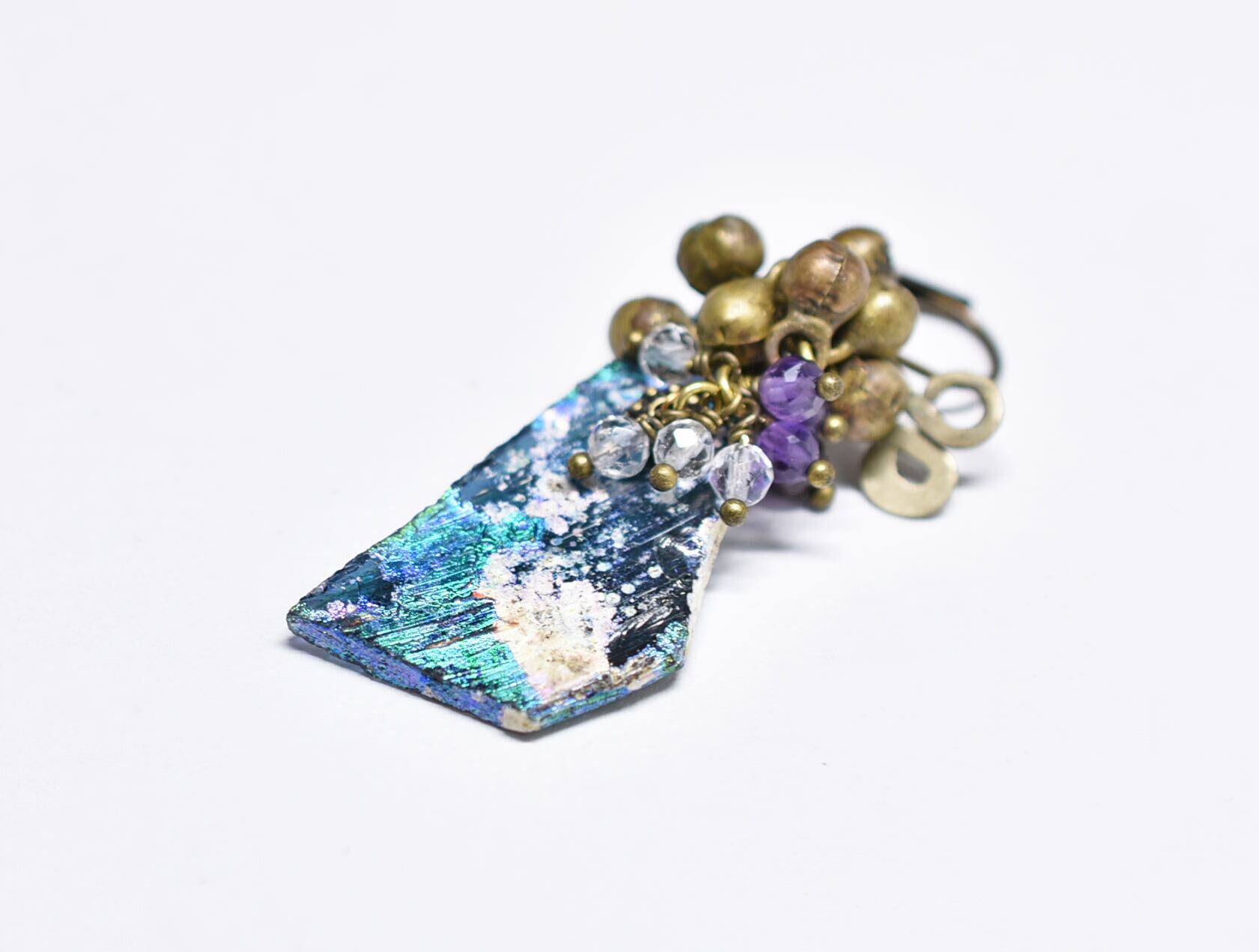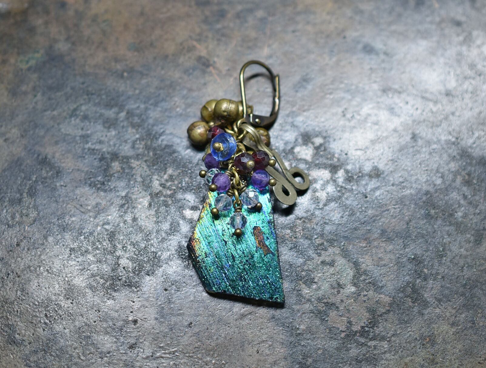 眩い銀化ローマングラスとたわわなストーンビーズ、民族鈴とアフガンパーツを繋いだ片耳ピアスです。