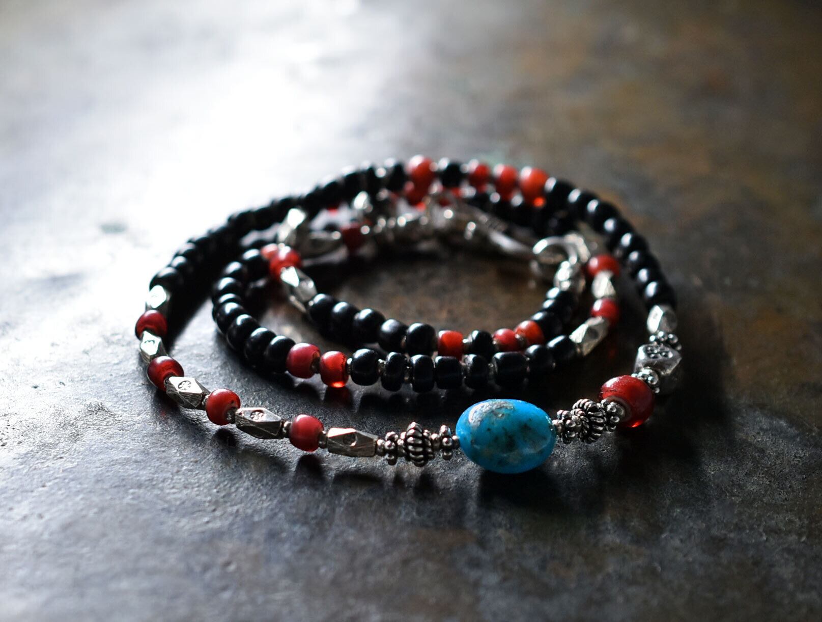 キングマンターコイズと金赤ホワイトハーツ、漆黒アンティークビーズ、カレンシルバーなどを繋いだネックレスです。