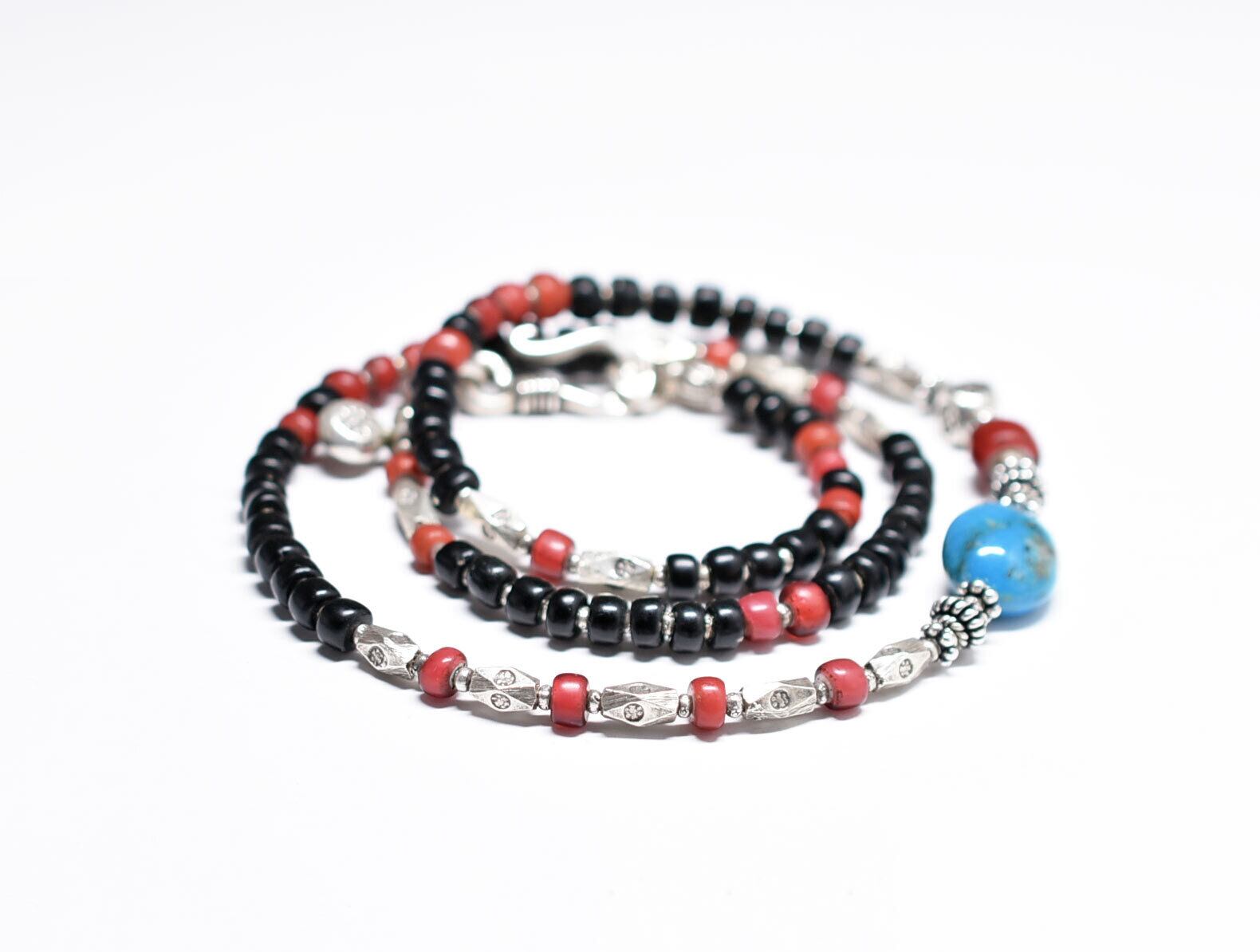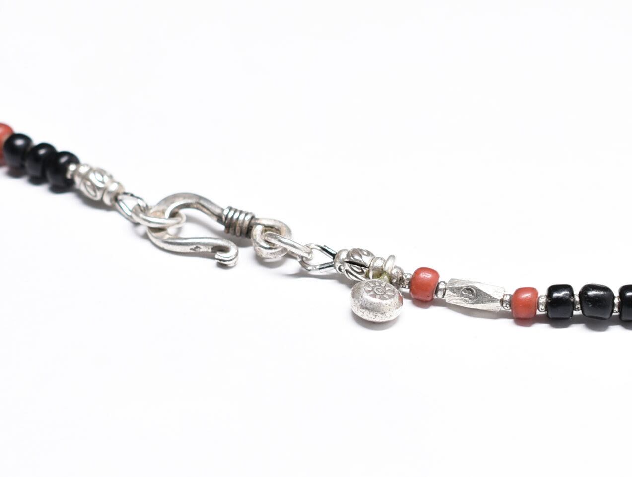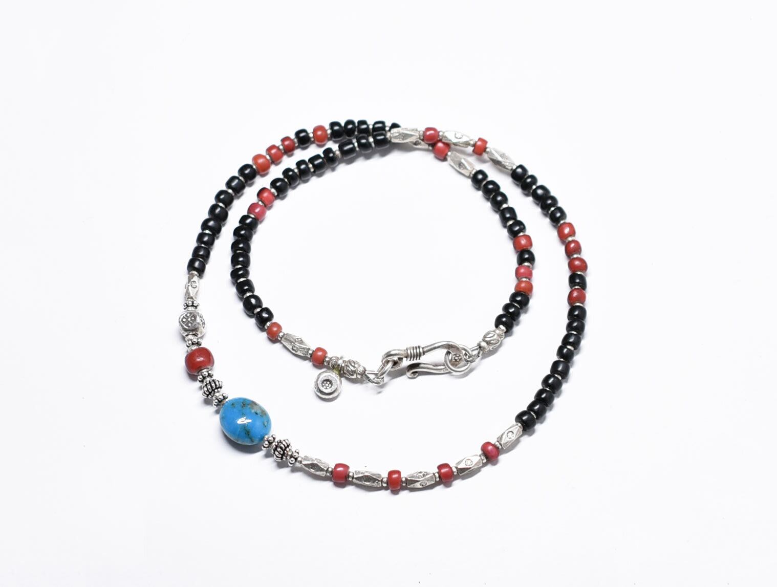 キングマンターコイズと金赤ホワイトハーツ、漆黒アンティークビーズ、カレンシルバーのネックレス
