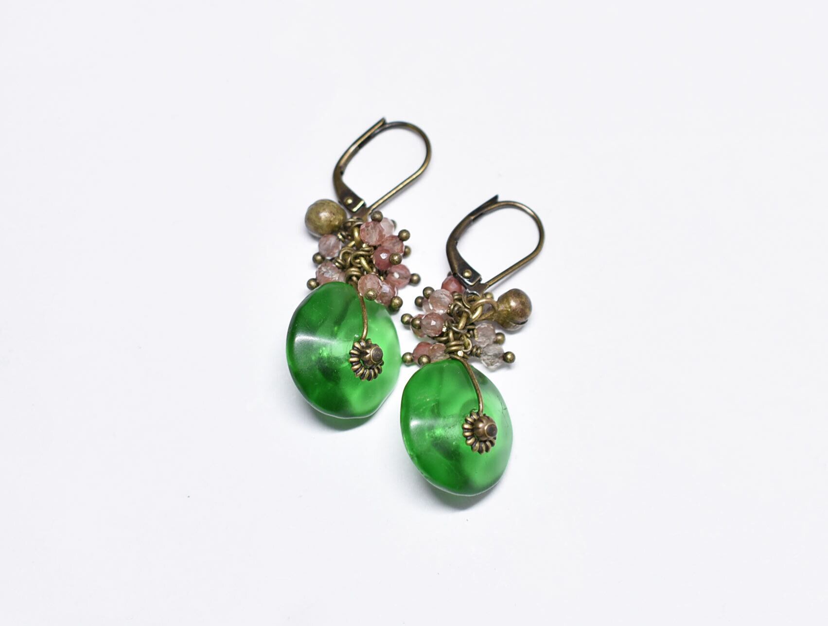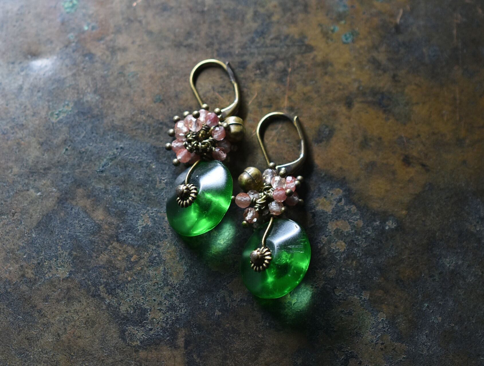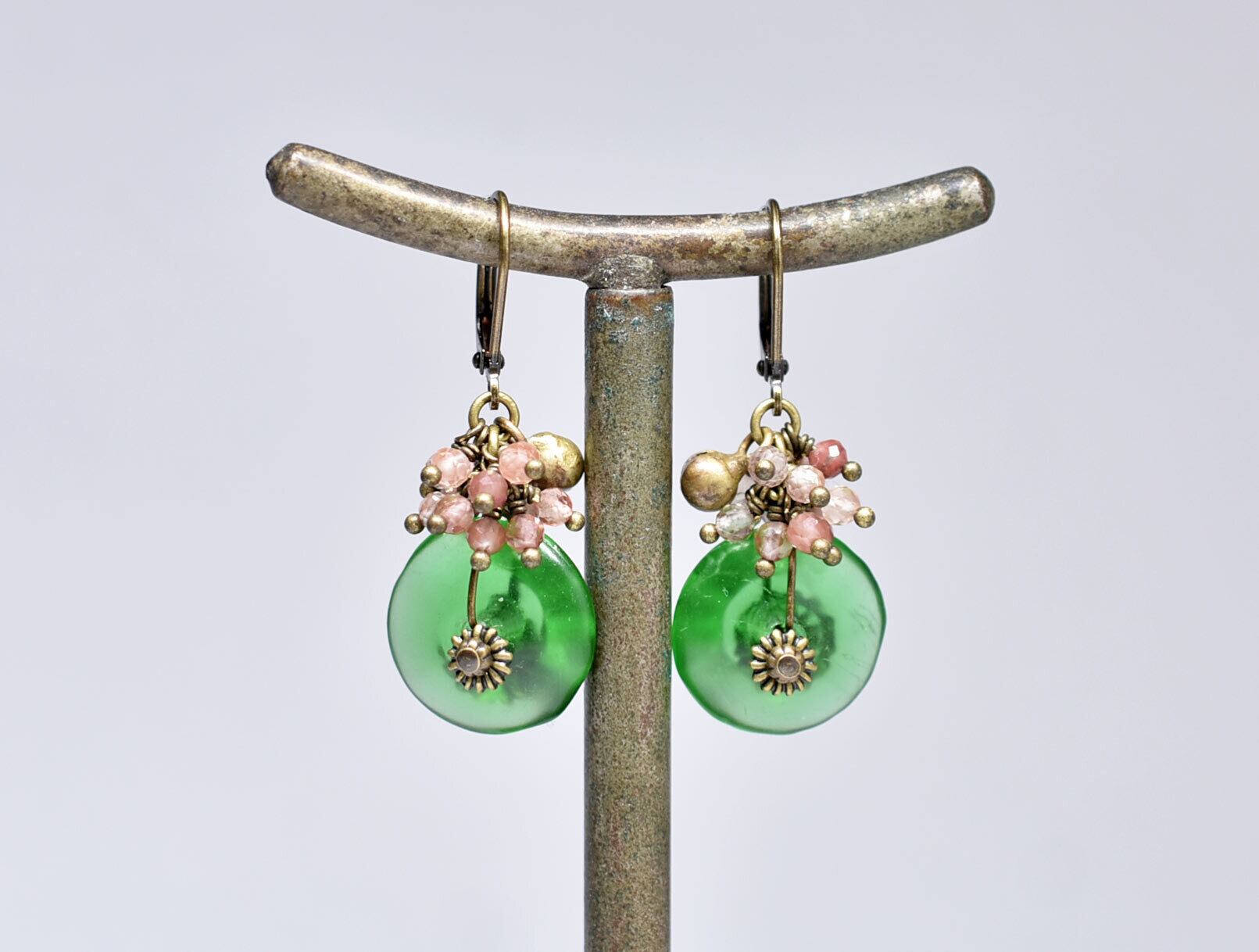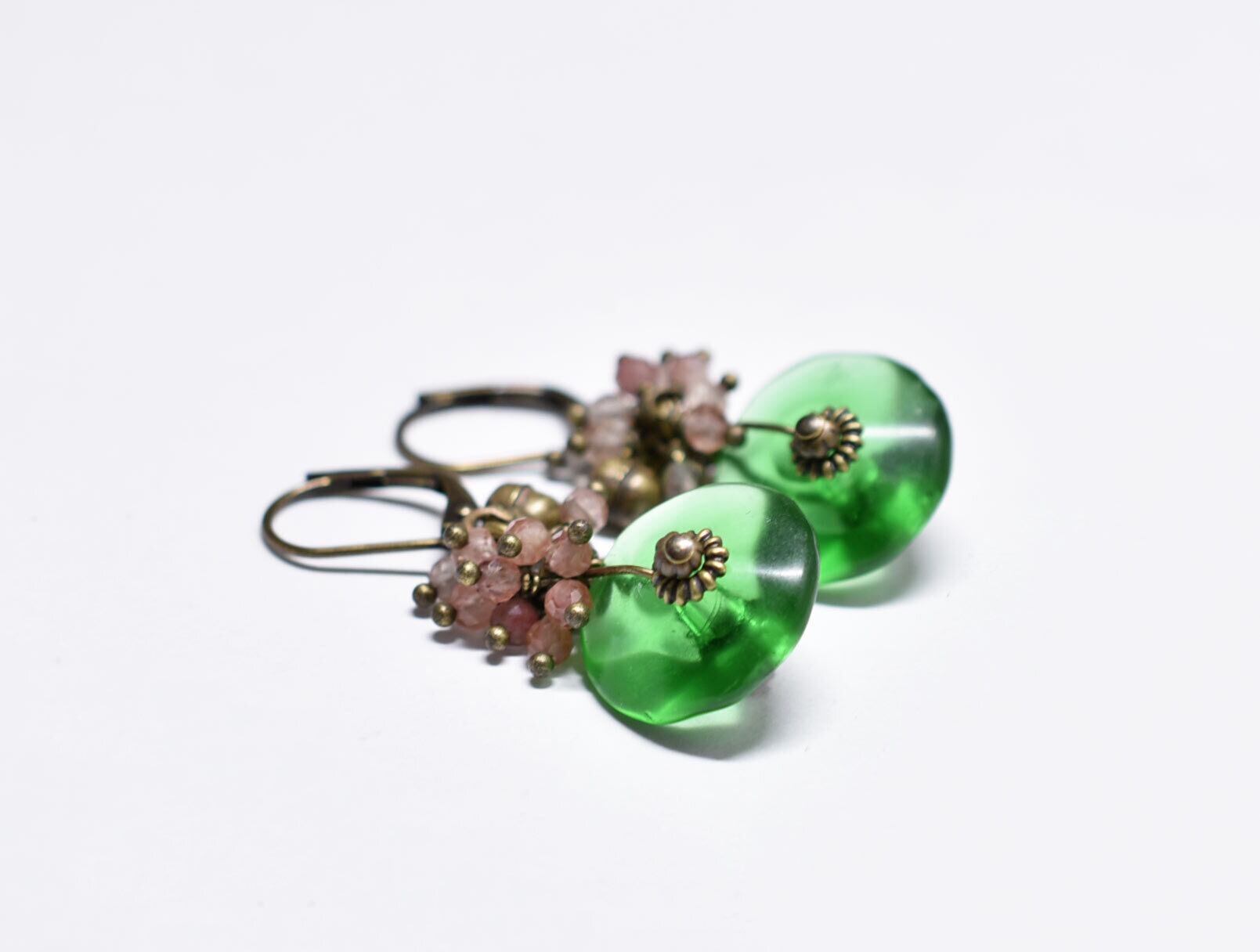 ディスク型アンティークボヘミアビーズとたわわなアンデシン、民族鈴のピアス