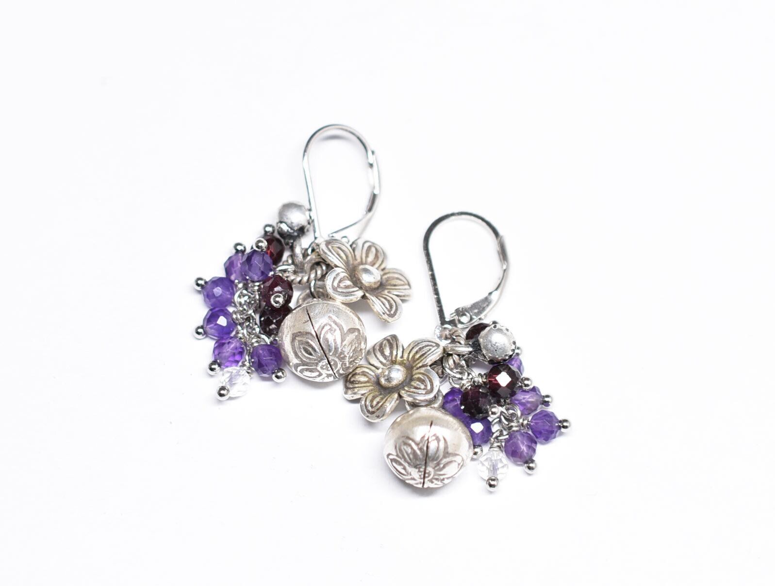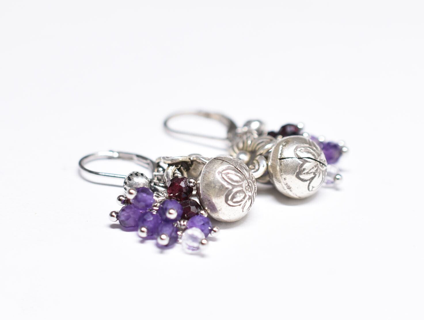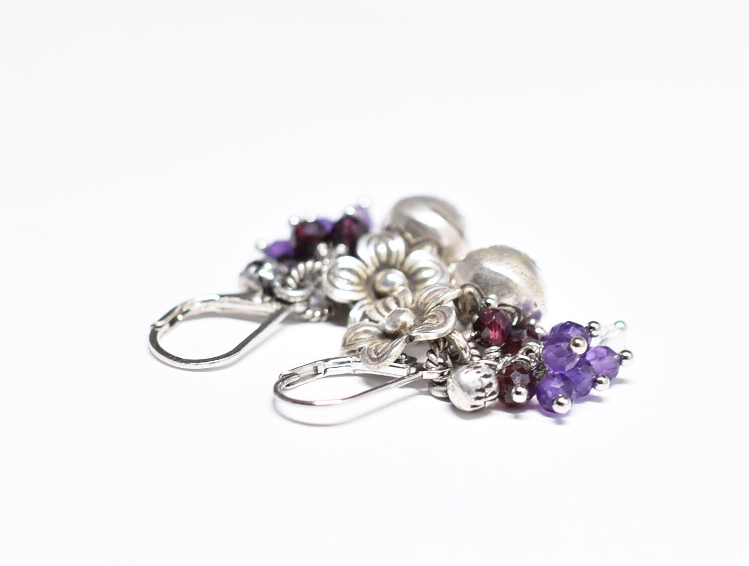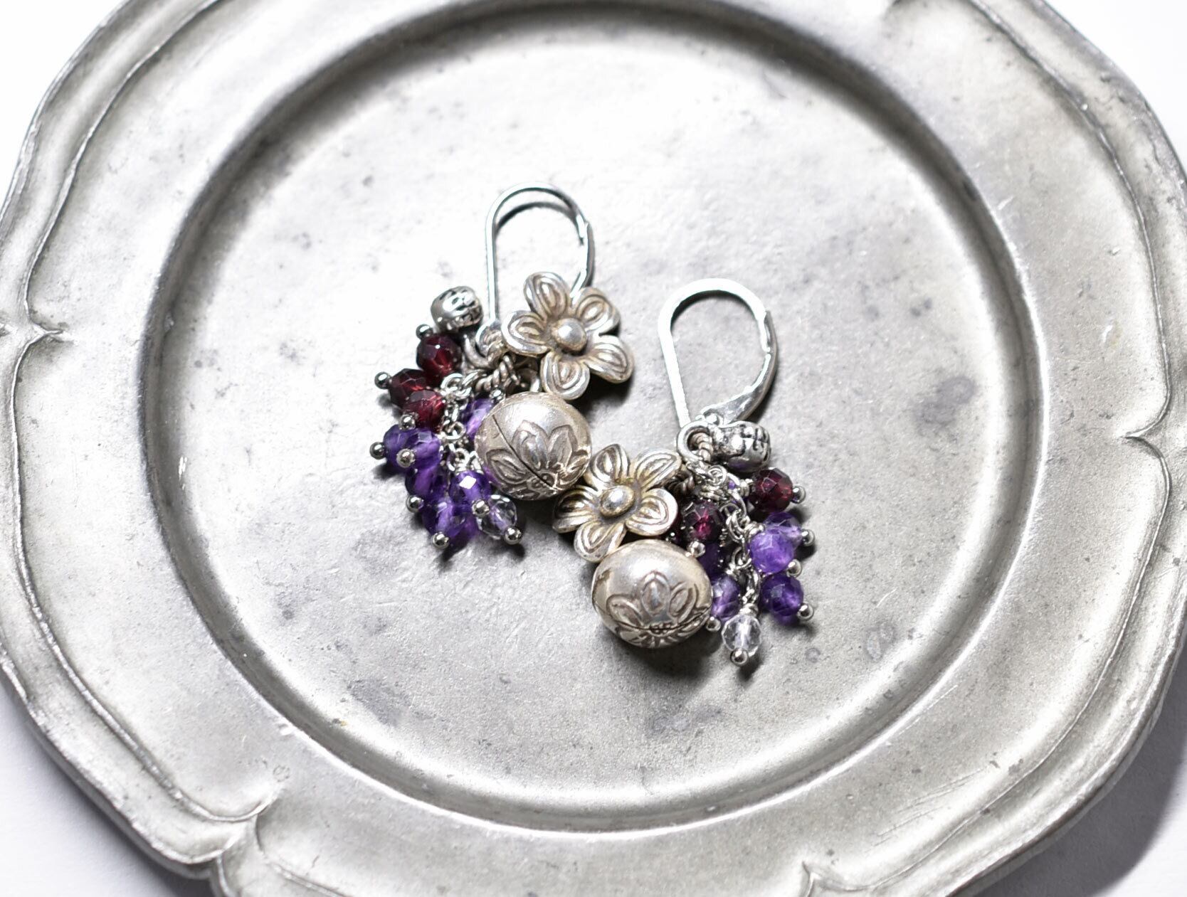 鈴とお花カレンシルバー、たわわなガーネット、アメジスト、クォーツ、インドシルバー鈴のピアス