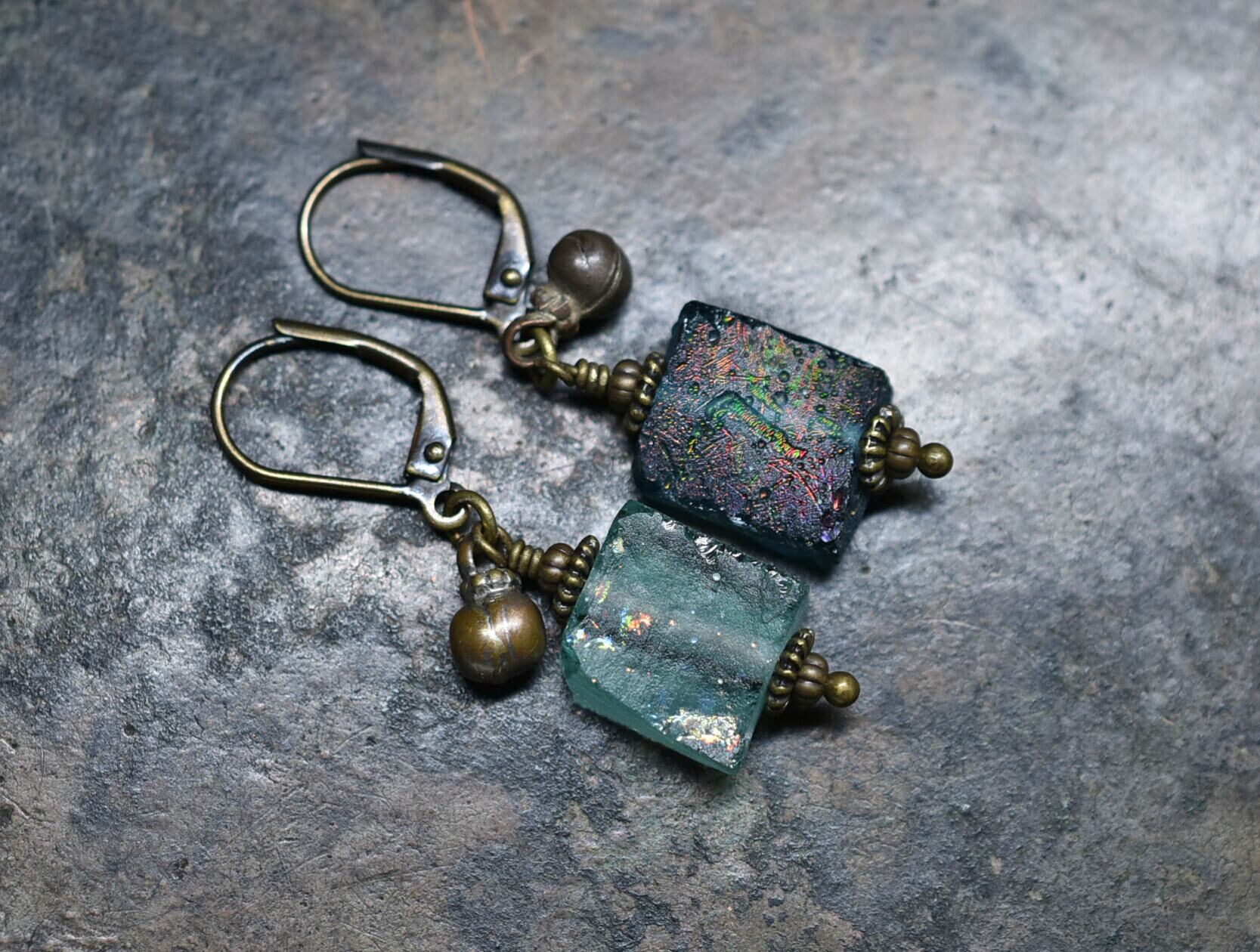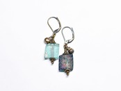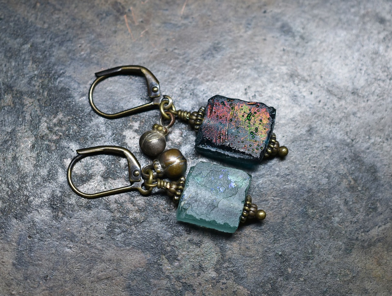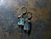 スクエア型の薄っすら銀化ローマングラスと民族鈴を繋いだピアスです。