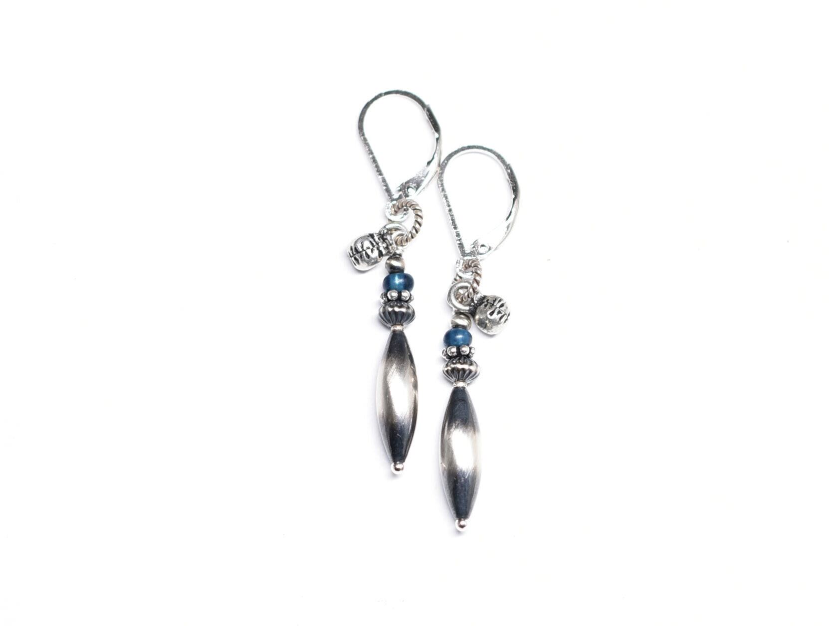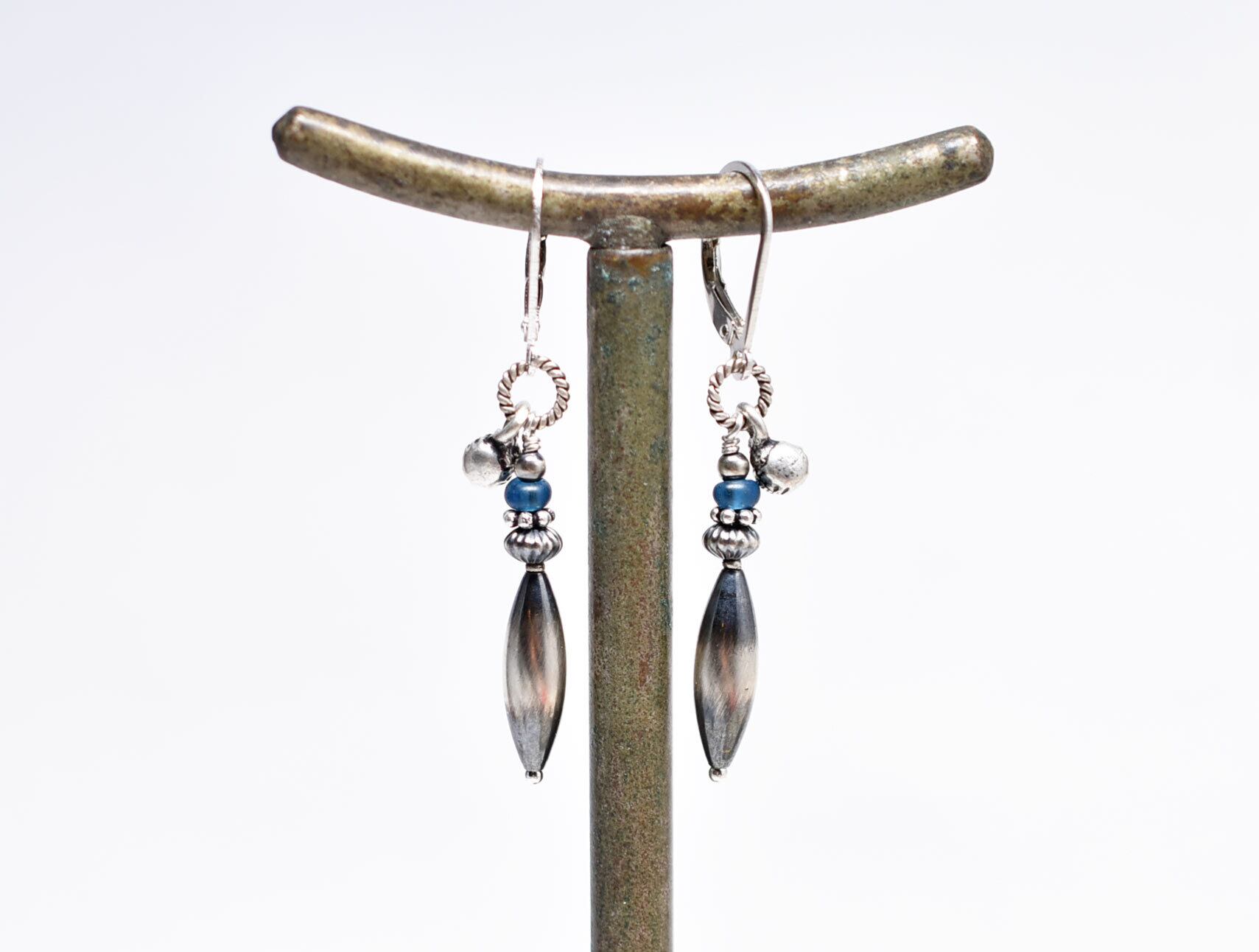 多彩ナバホパールとブルービーズ、インドシルバーの鈴とスリムなピアス