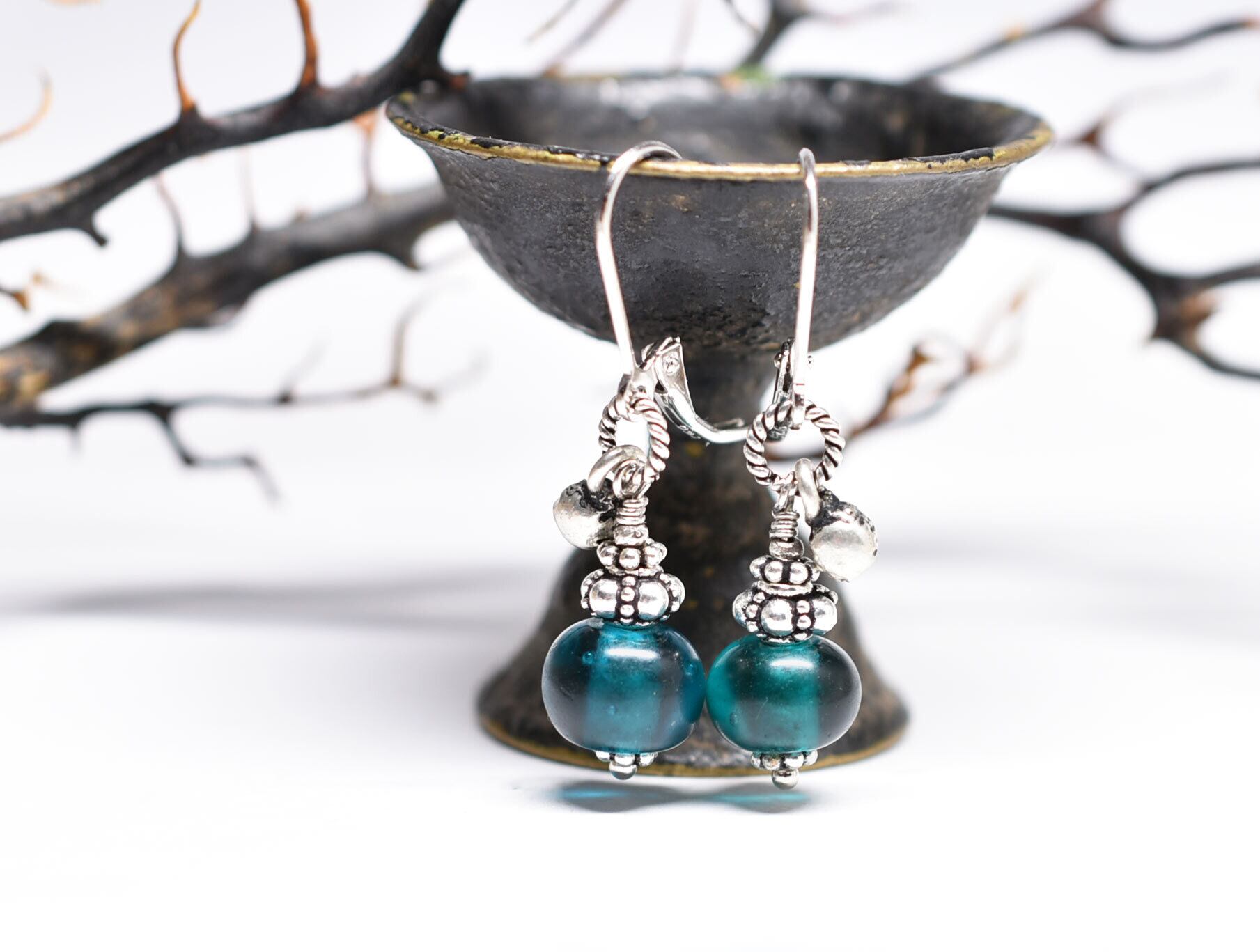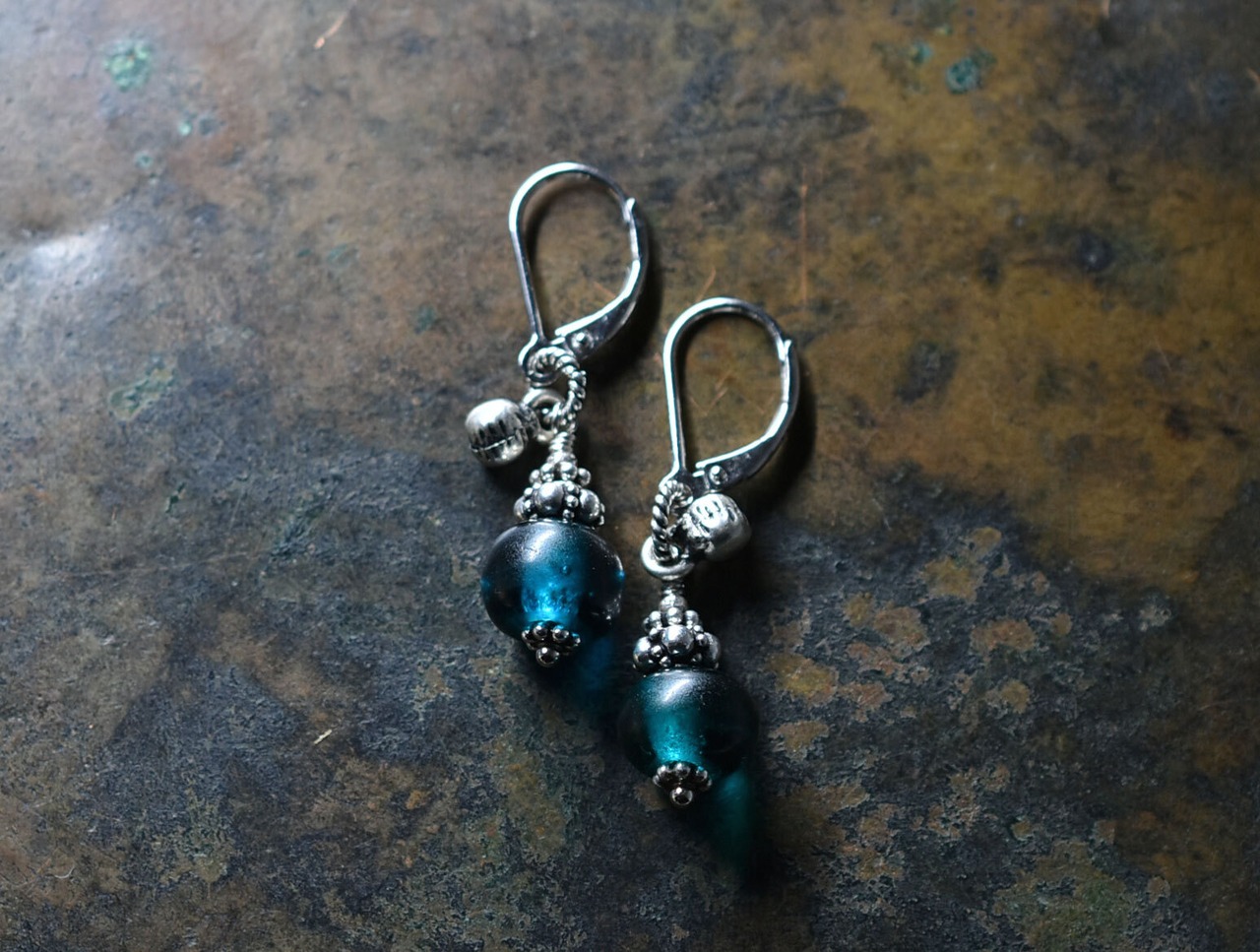 インディゴブルーヴィンテージビーズとハンドメイドシルバー、インドシルバー鈴のピアス