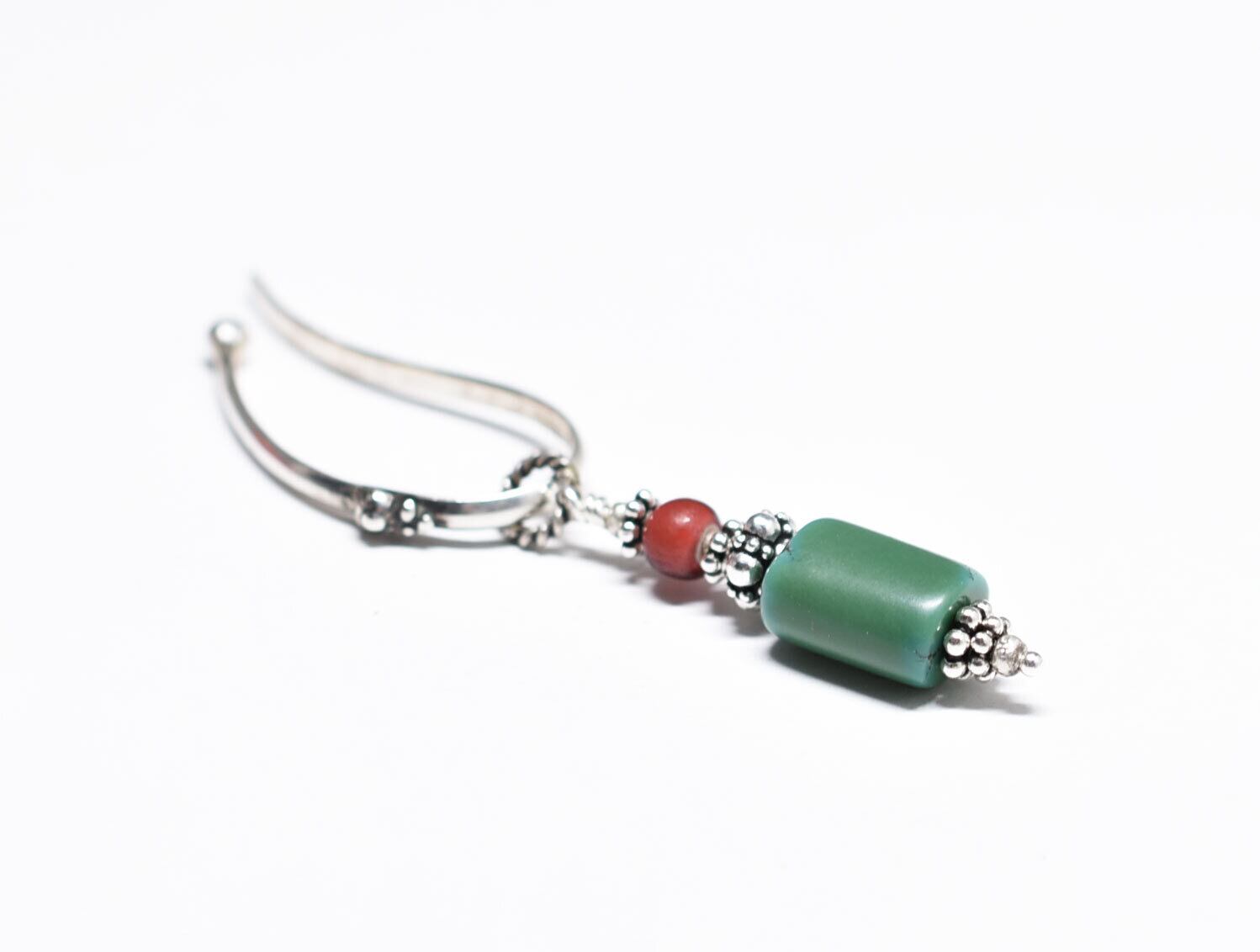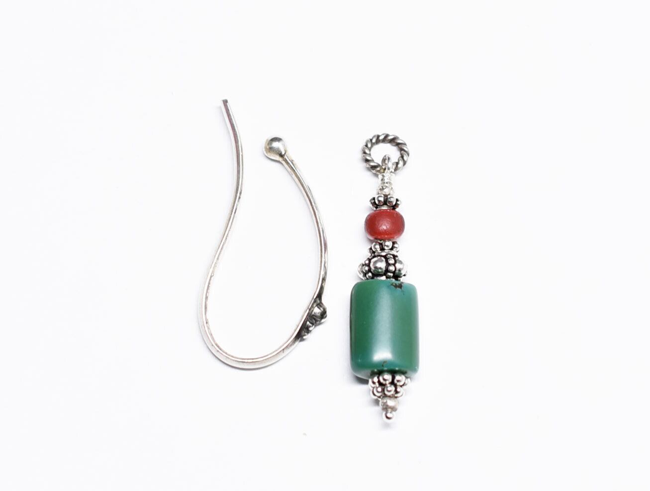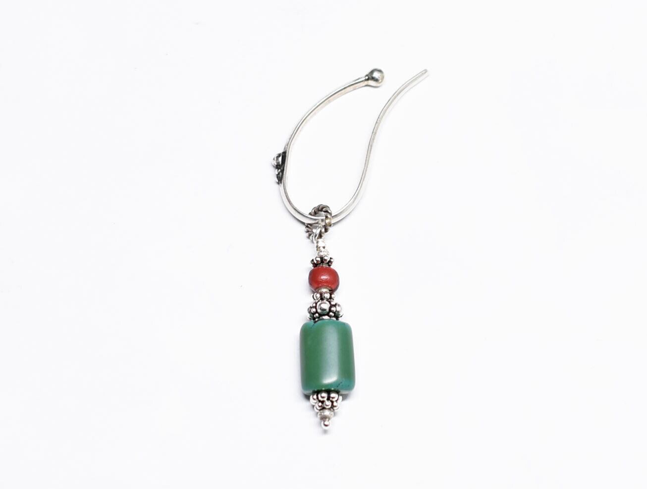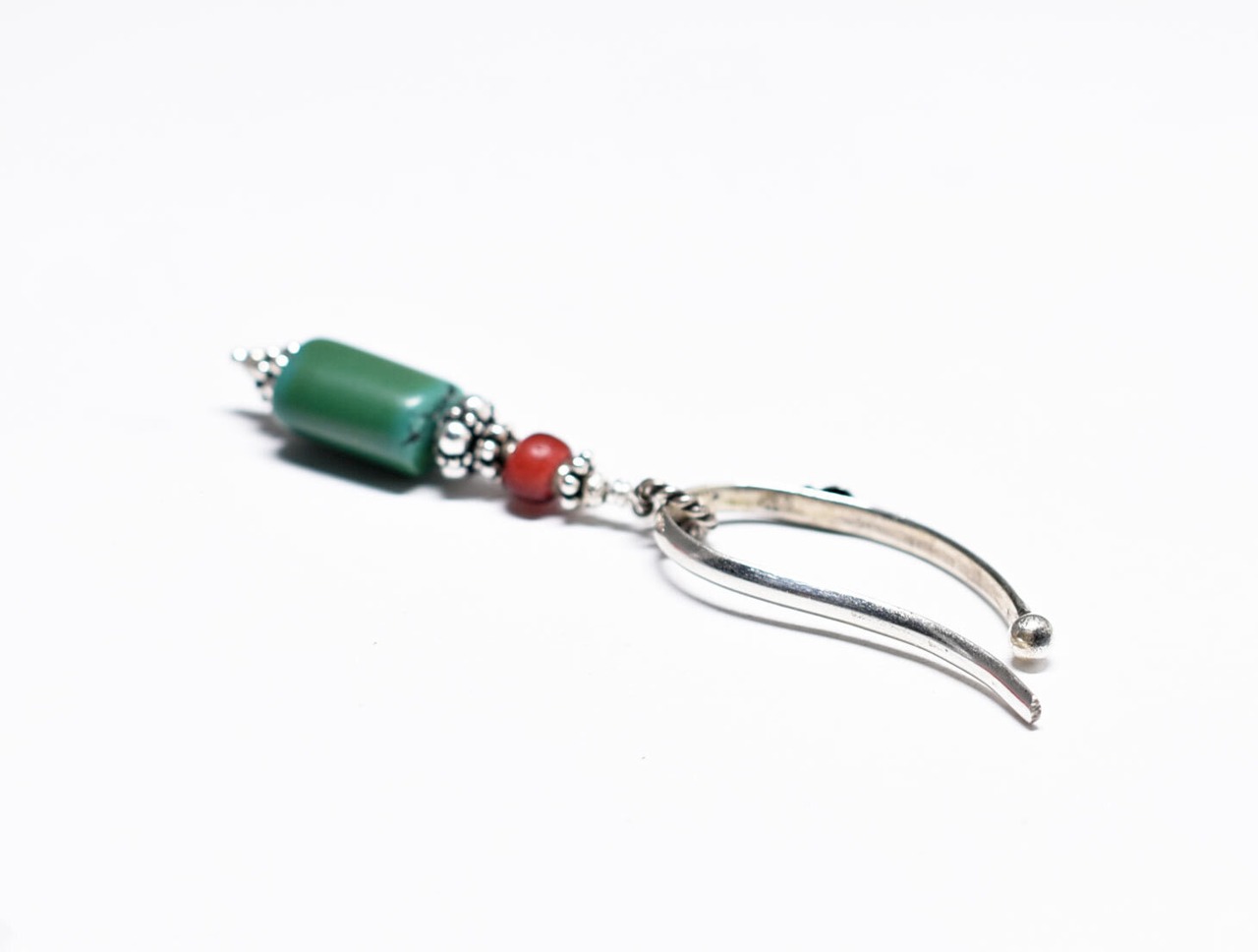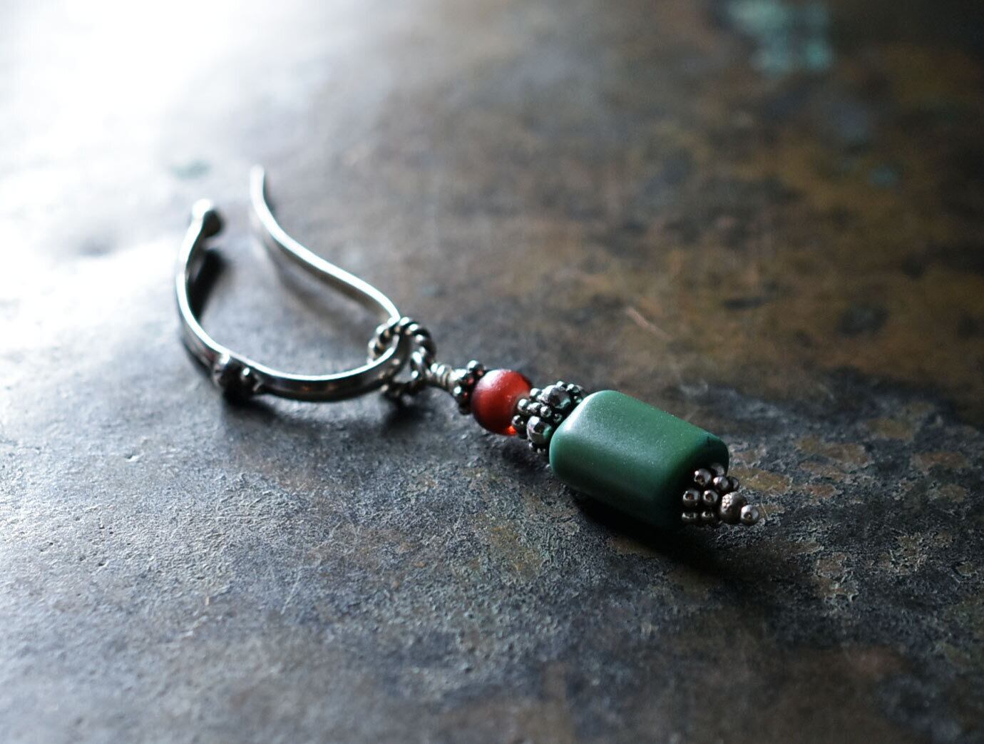 oldチベタンターコイズと金赤ホワイトハーツなどを繋いだインドシルバーイヤーカフです。