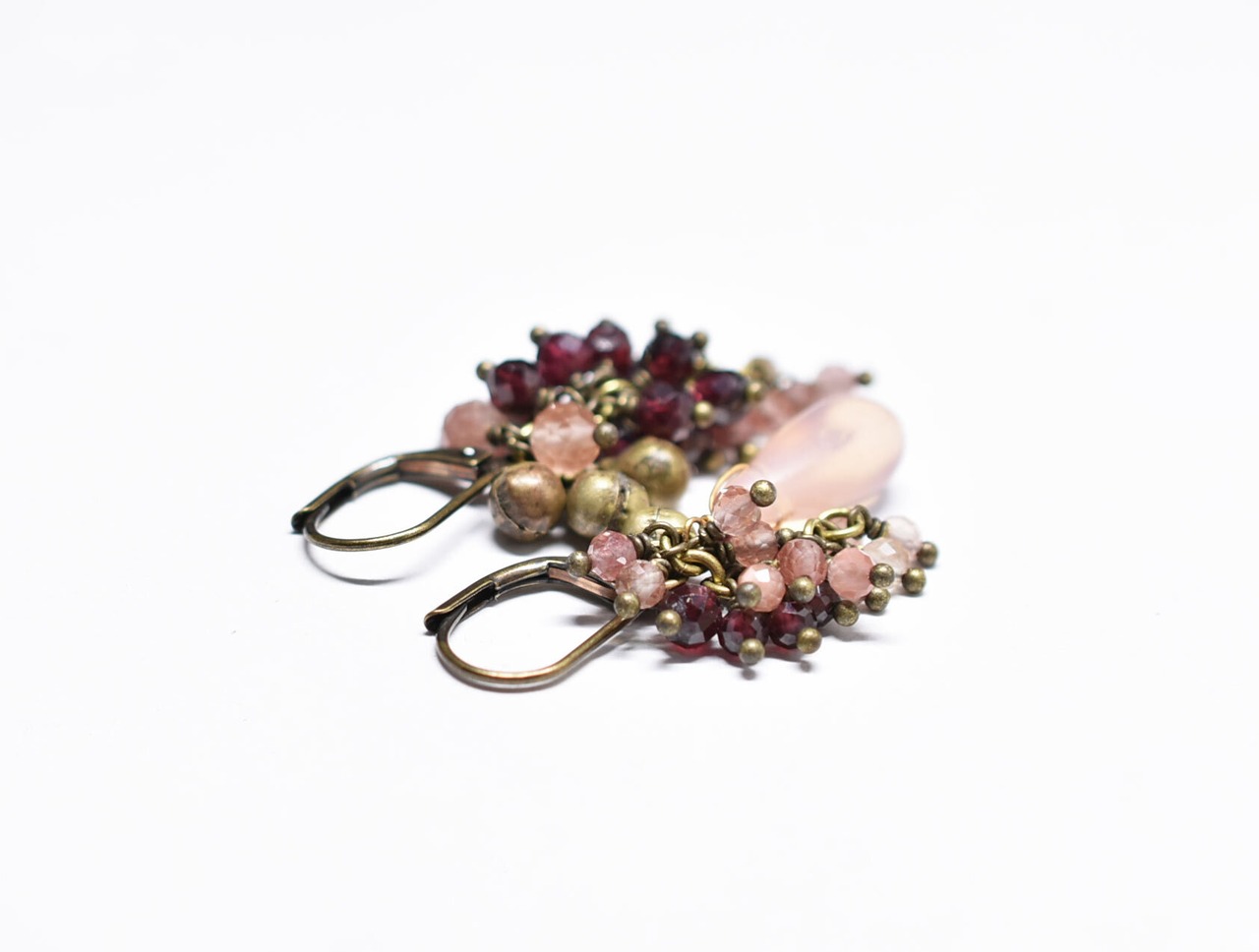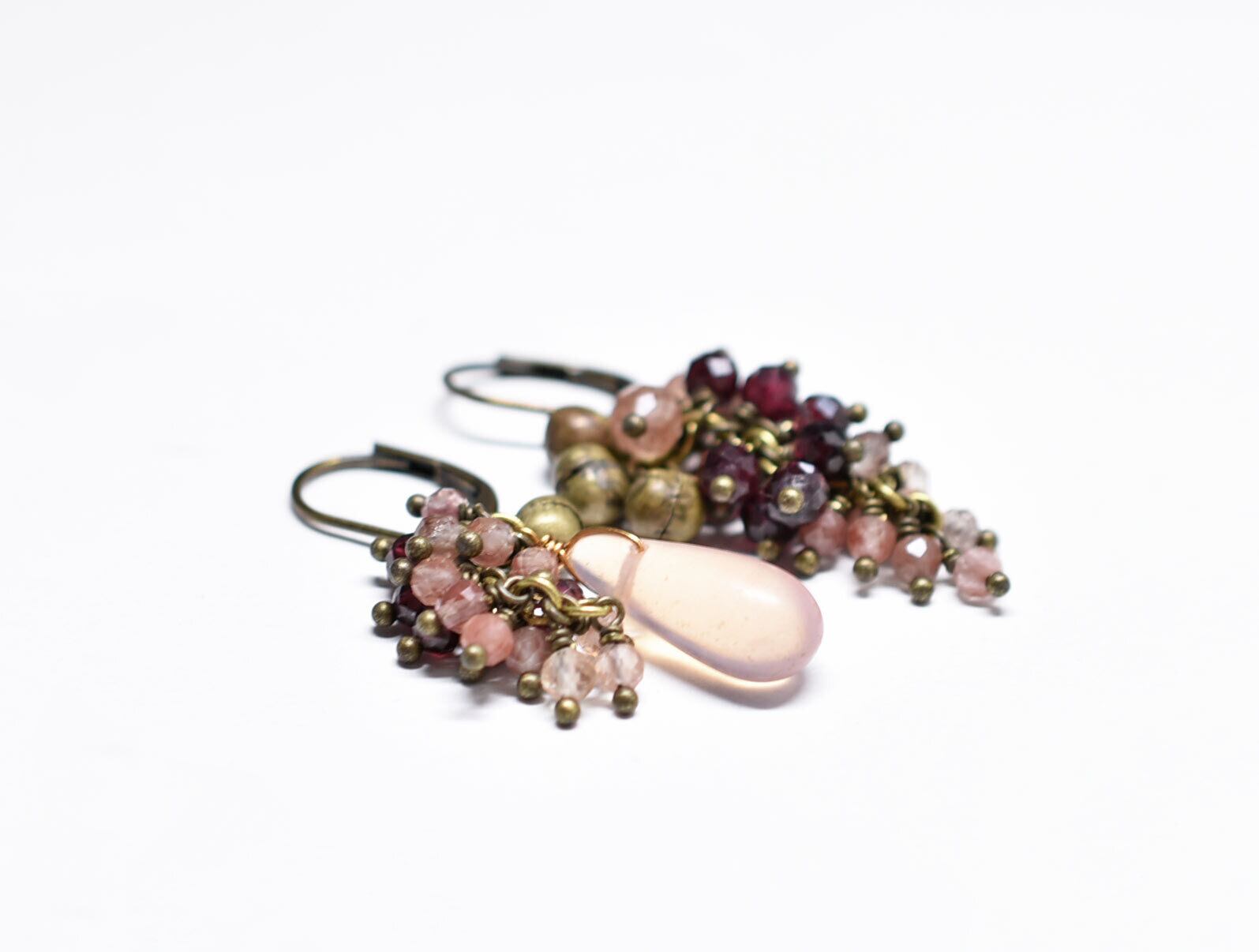 桃色ウエディングビーズとたわわなアンデシン&ガーネット、民族鈴のアンシメトリーなピアスです。